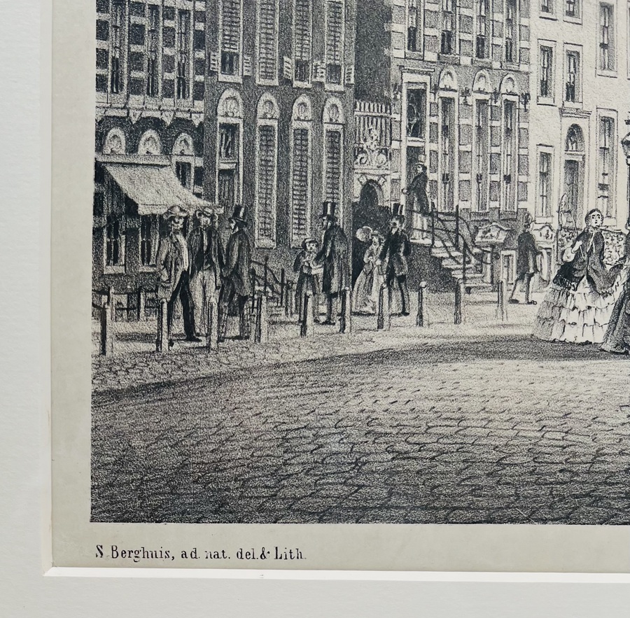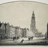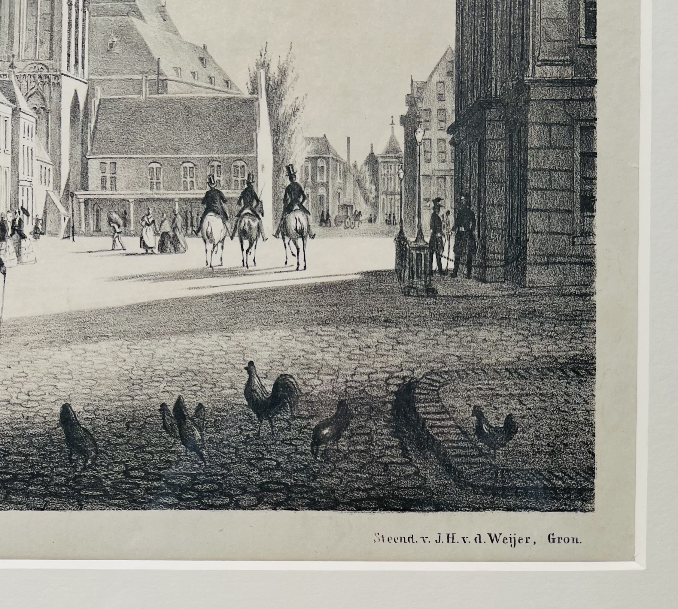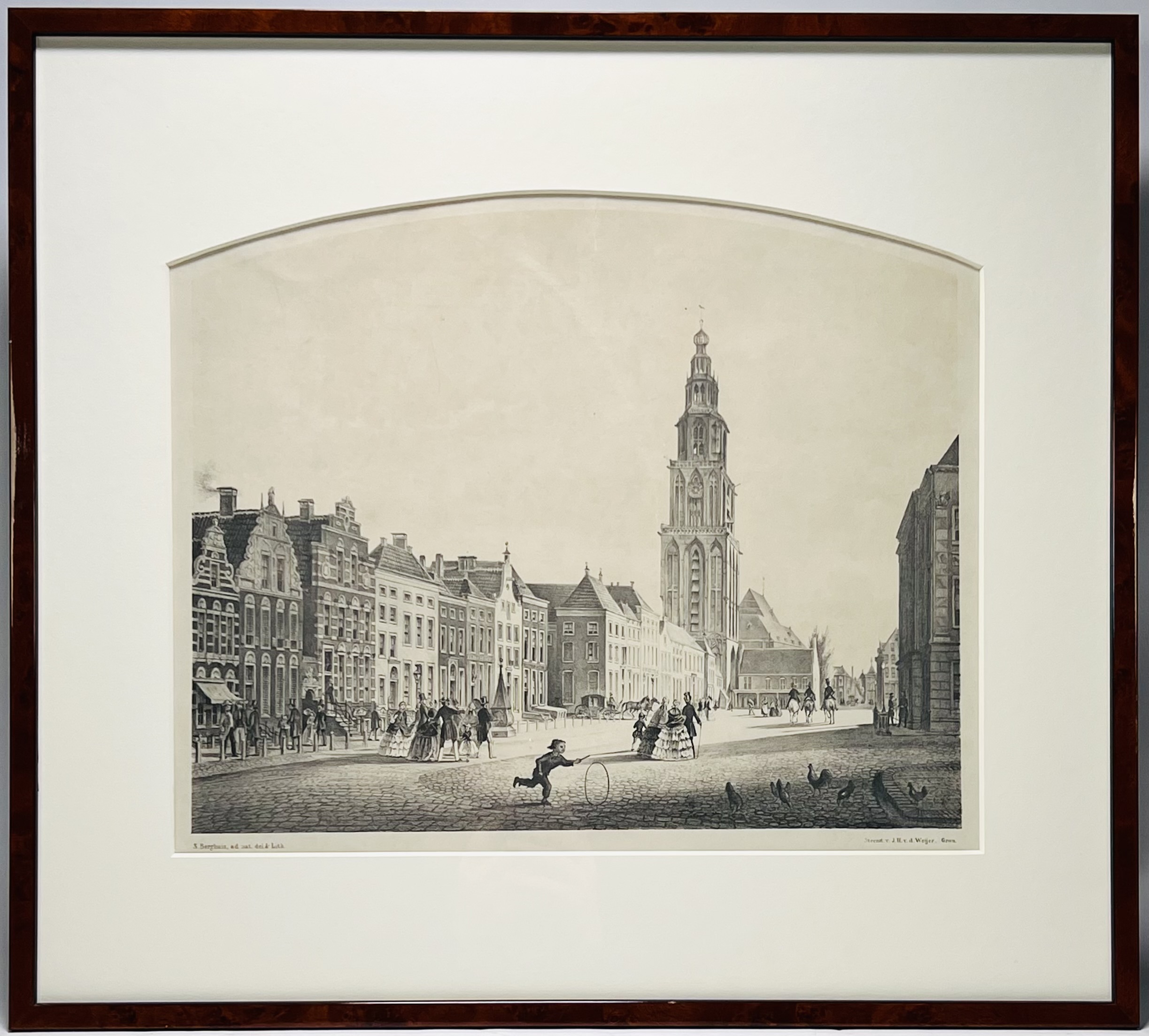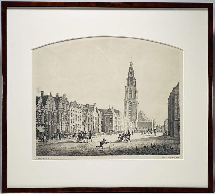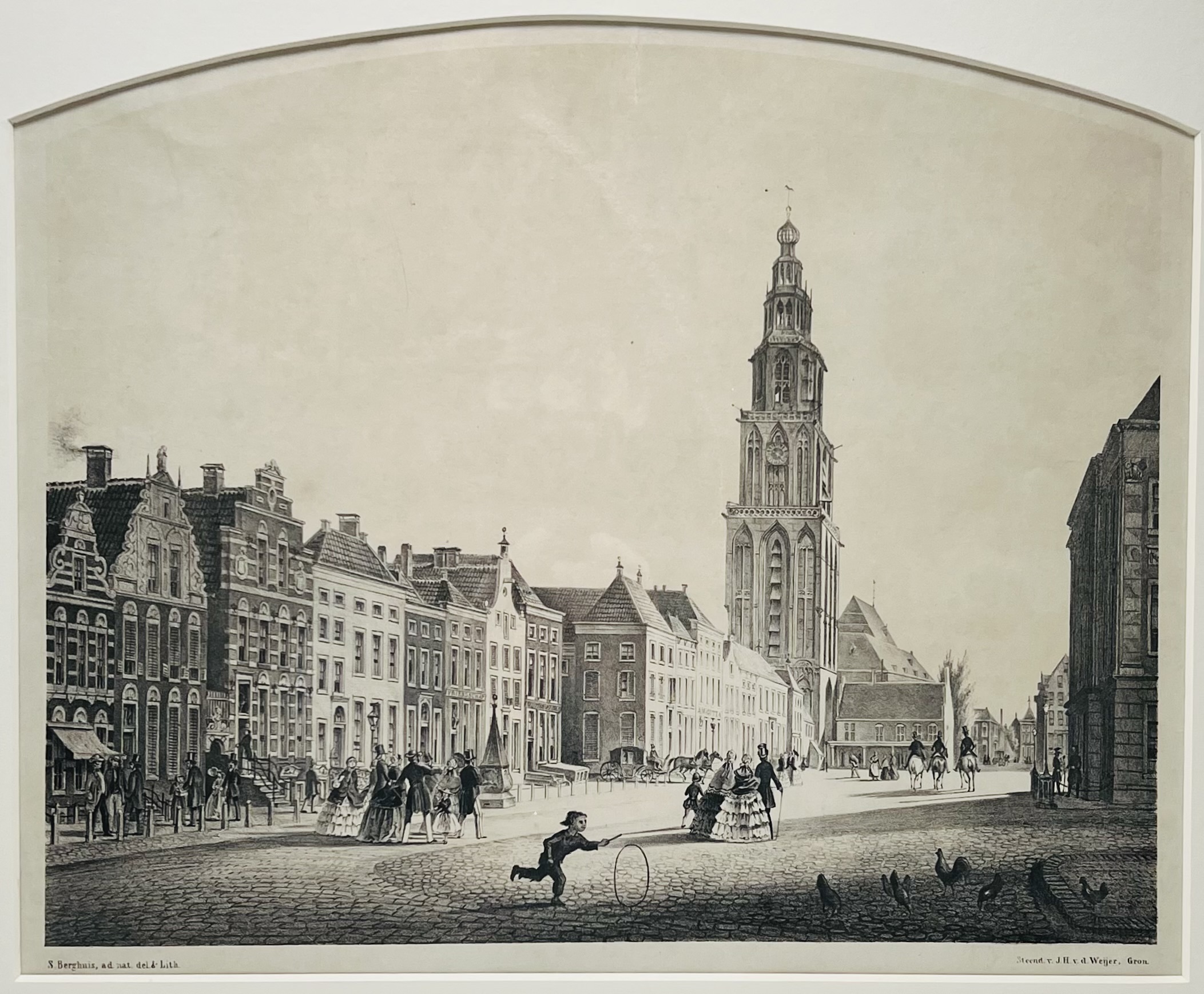 Reproductie van een steendruk van Groningen vanaf de Grote Markt richting Martinitoren omstreeks 1857 getiteld Grote Markt 1857”. Naar een tekening van Sybolt Berghuis. Litho oorspronkelijk uitgevoerd door Steendrukkerij J.H. V.d Weijer, Groningen, omstreeks 1860. Deze uitvoering eind 20e eeuw. |