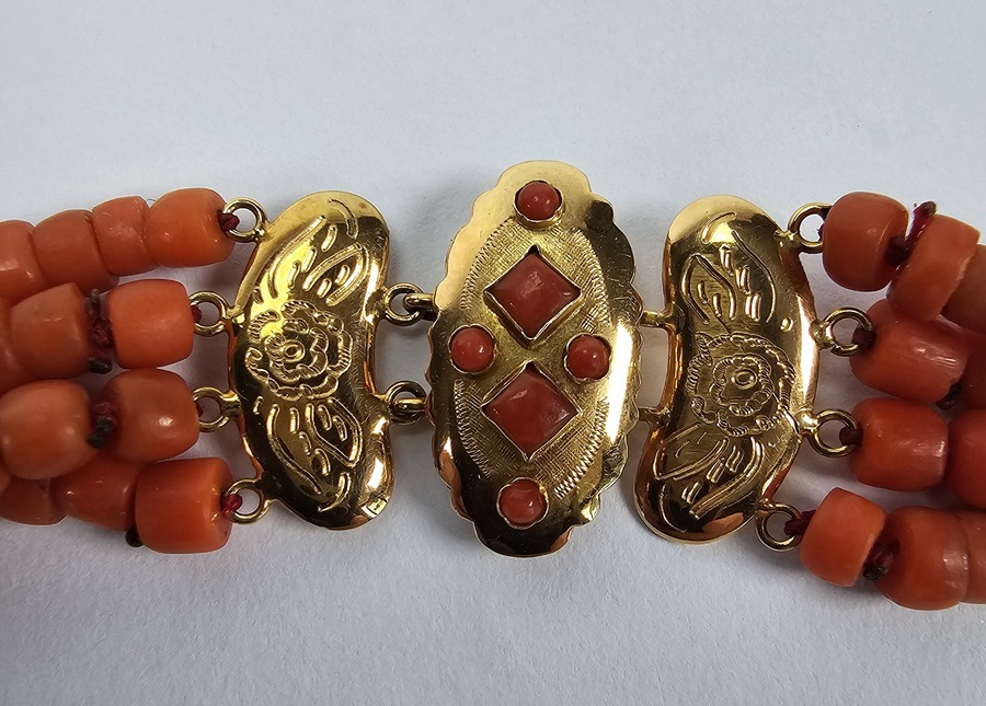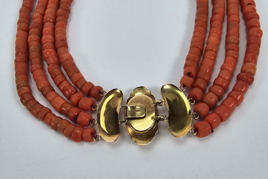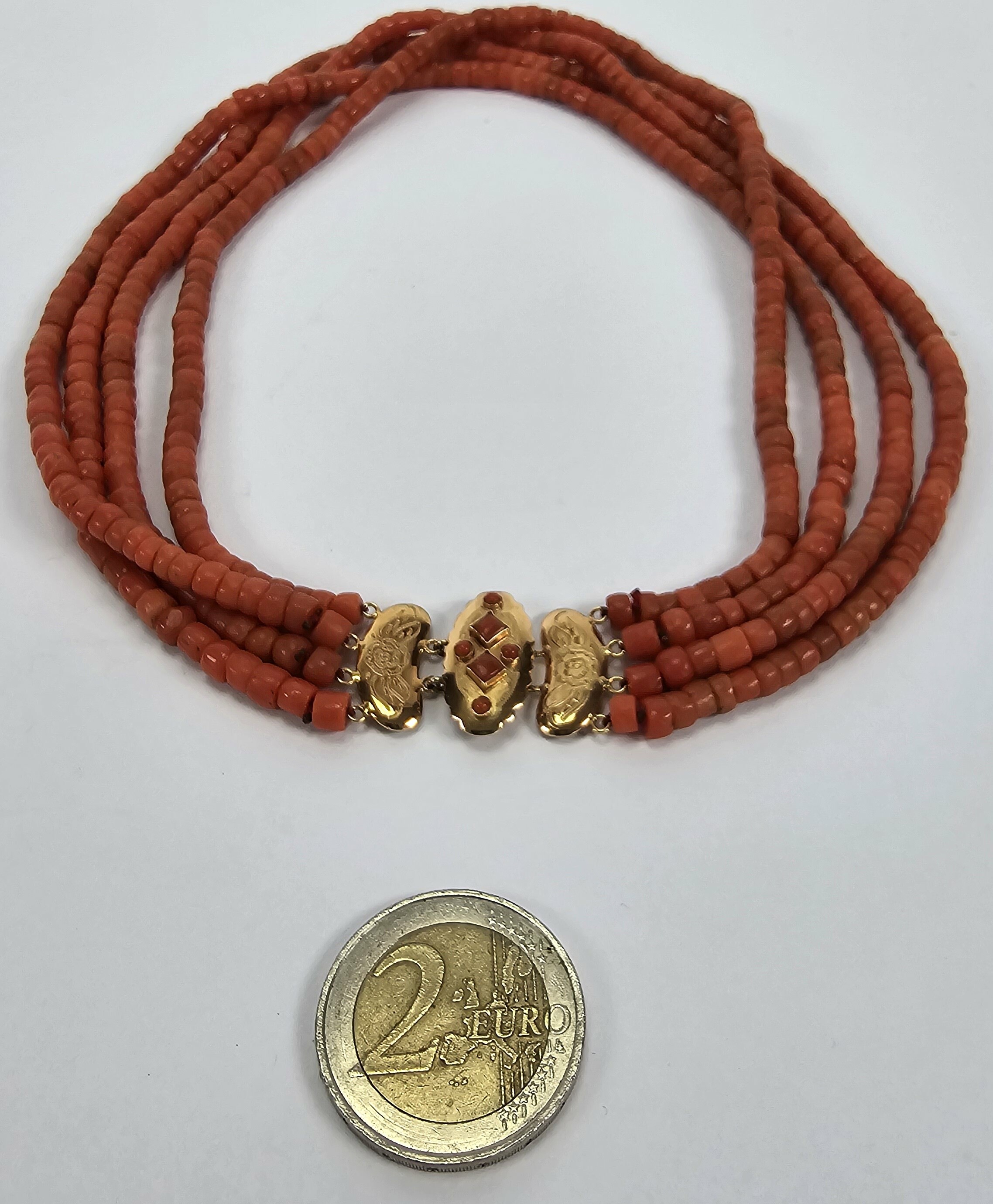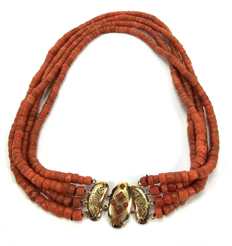 Halsketting met koraal kralen en gouden slot, 14 karaat gemerkt. Gouden slot ingelegd met koraal. Eind 19e eeuw. |