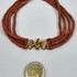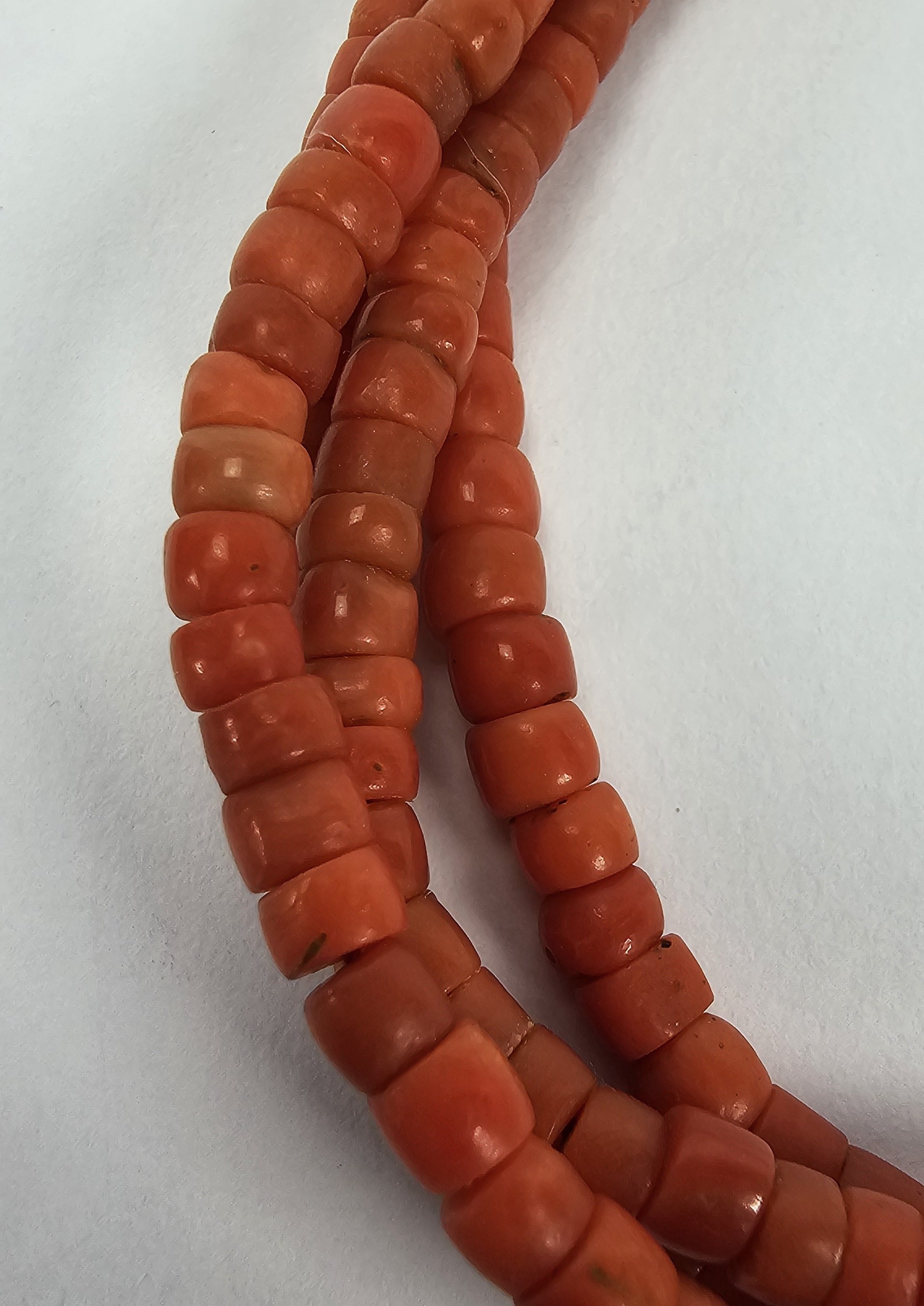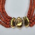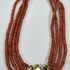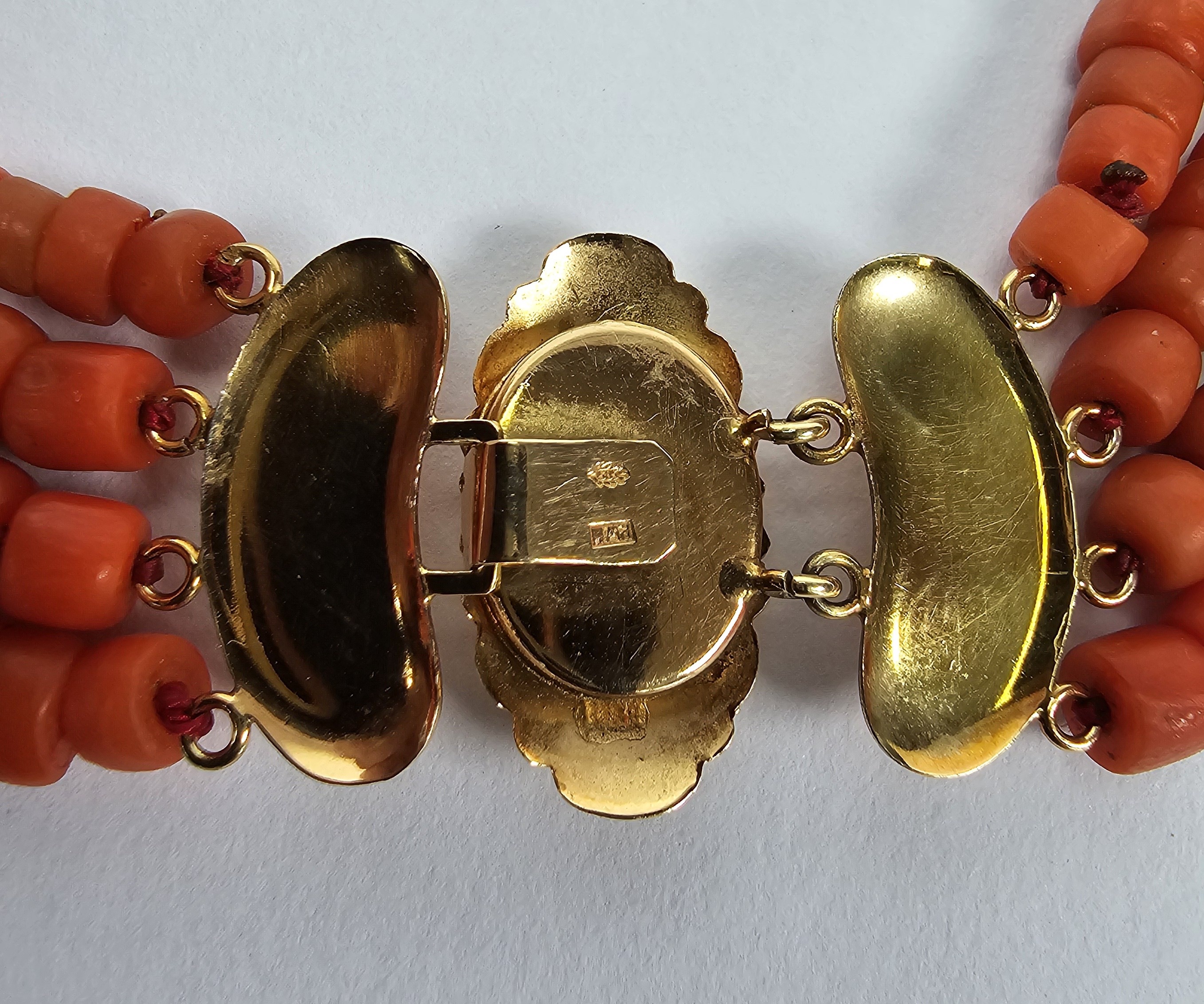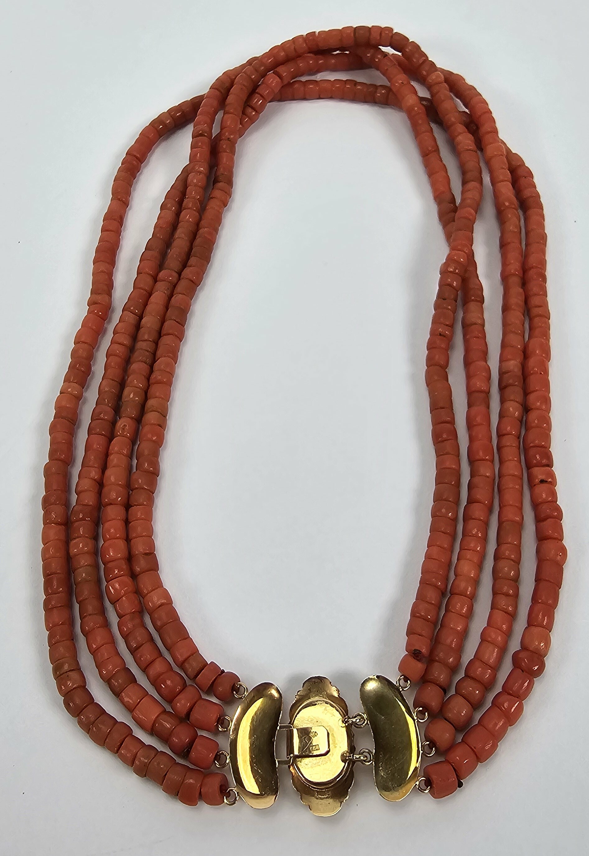 Halsketting met koraal kralen en gouden slot, 14 karaat gemerkt. Gouden slot ingelegd met koraal. Eind 19e eeuw. |