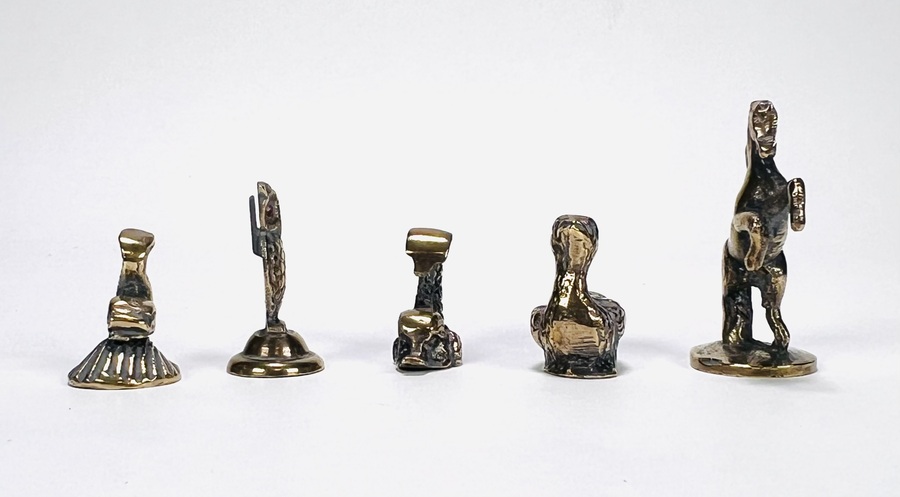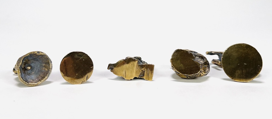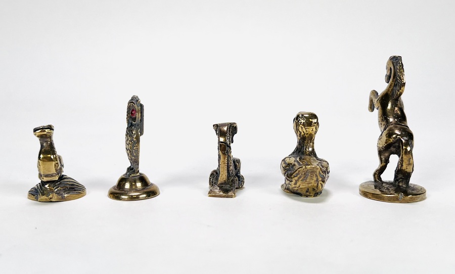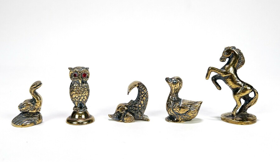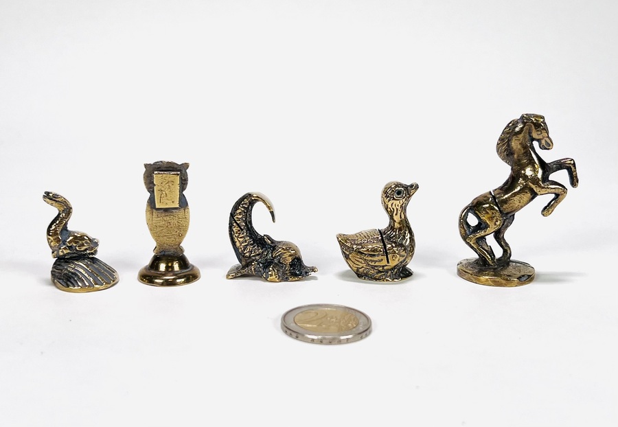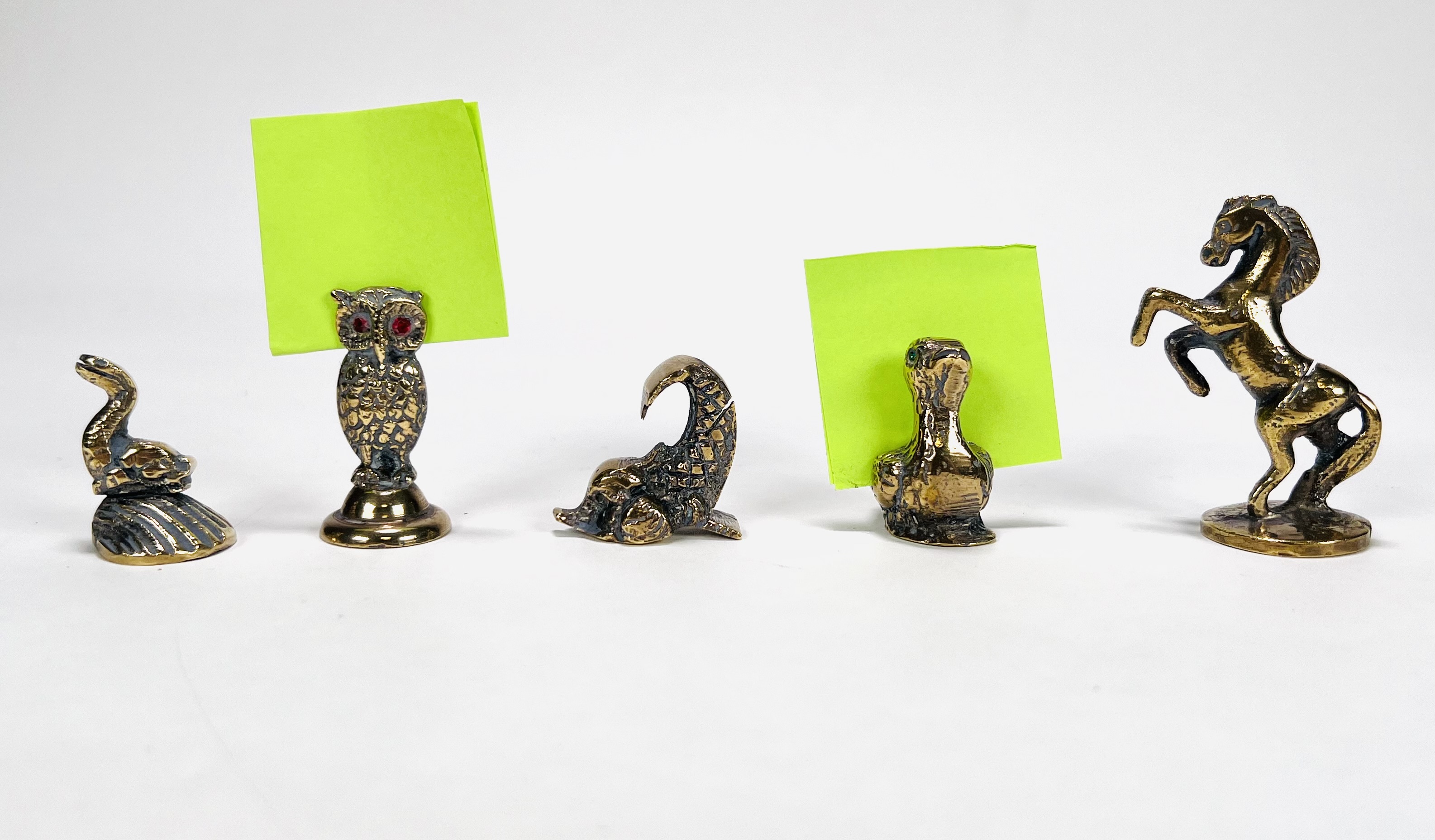 Vijf messing houders in verschillende diervormen voor tafelschikking. Tweede helft 20e eeuw. |