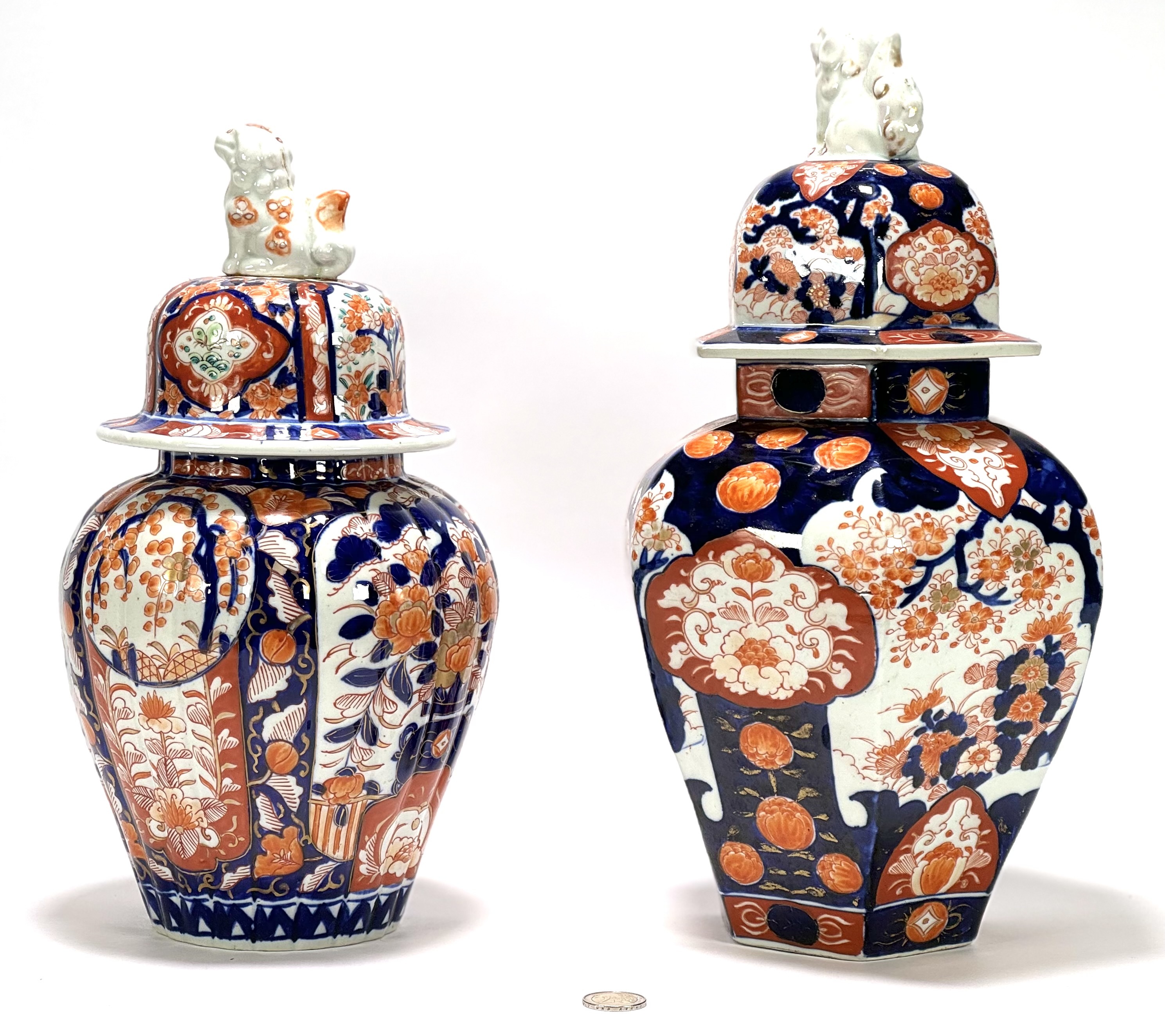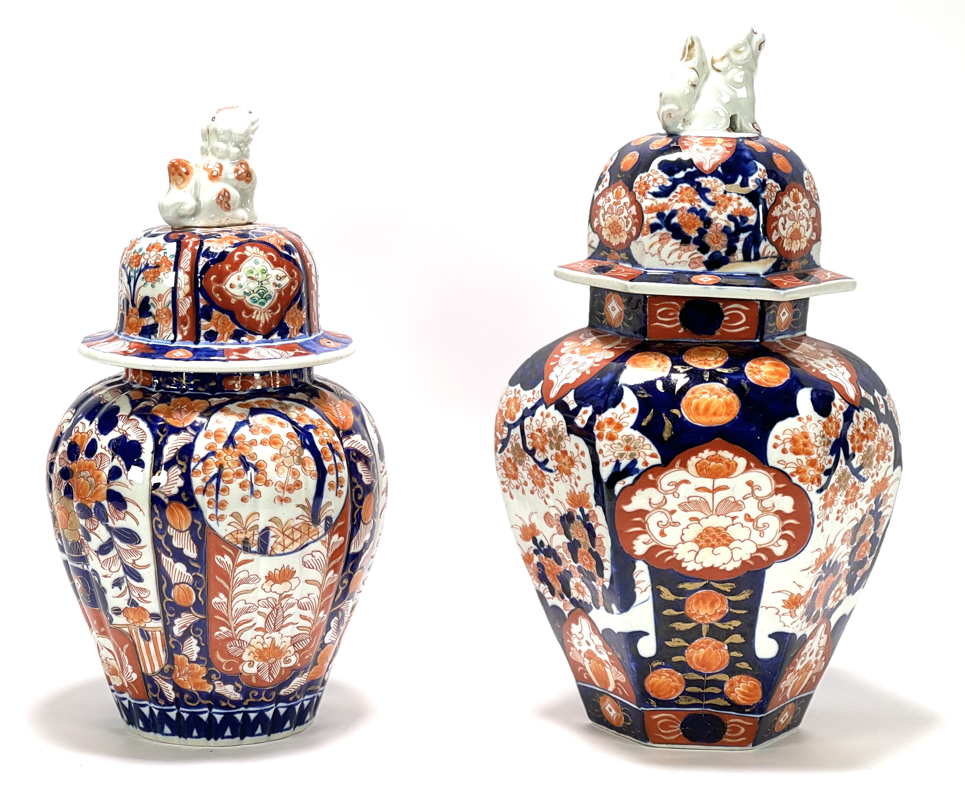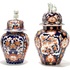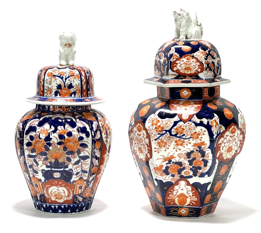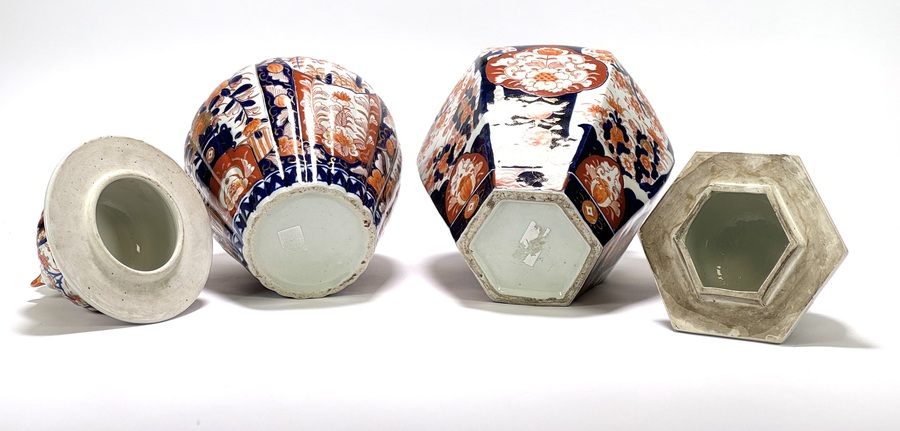 Twee Japanse porseleinen Imari dekselvazen, een balustervormige en hexagonaal vormige vaas gedecoreerd met botanische motieven en Foo hond als greep. Japan, eind 19e eeuw. |