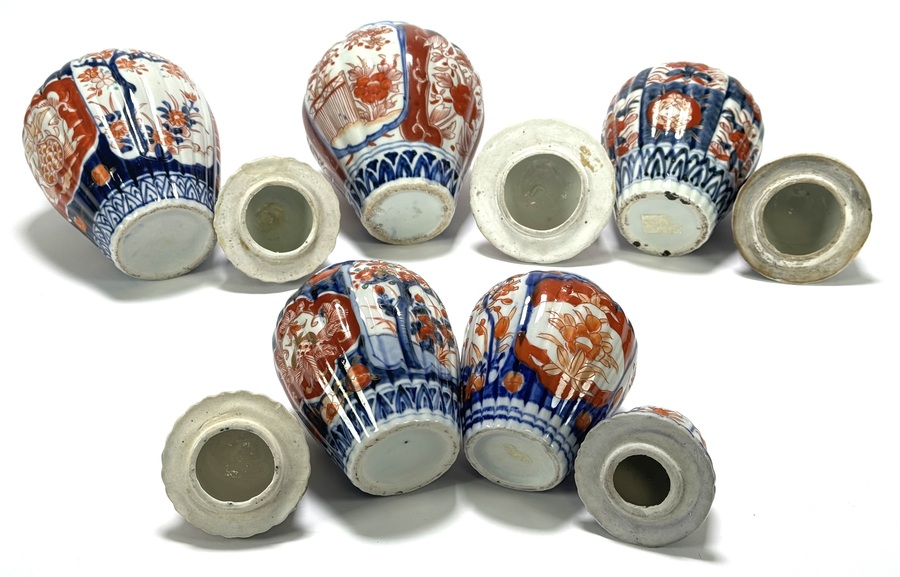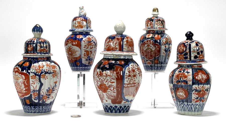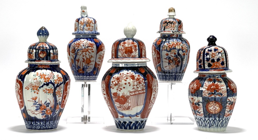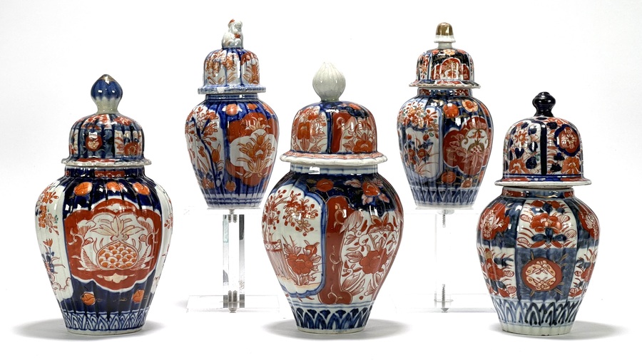 Convoluut van vijf porseleinen Imari balustervormige dekselvazen met handbeschilderd floraal decor. Japan, begin 1900. |