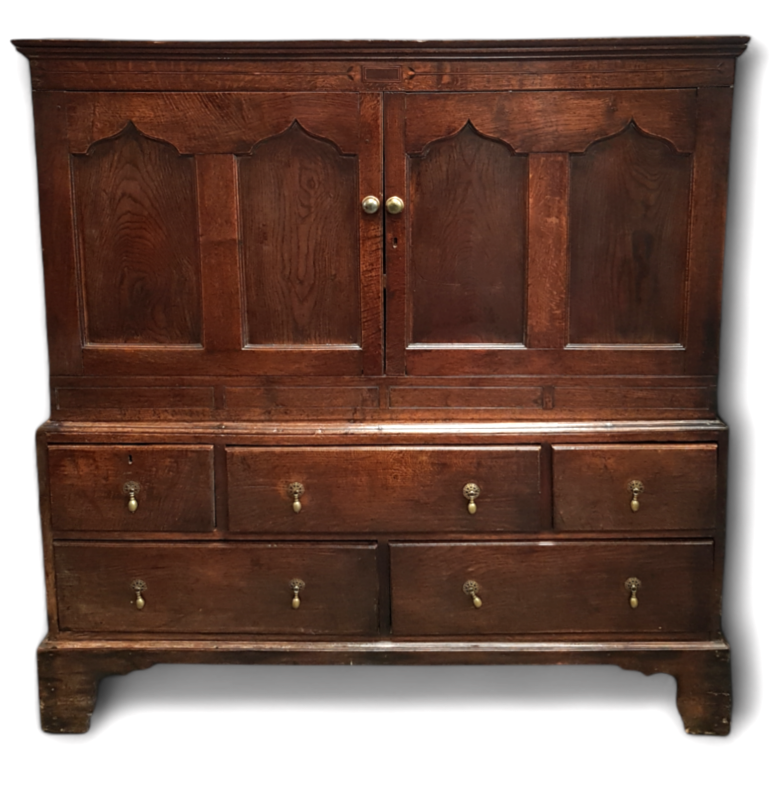 Eikenhouten Welsh Cardiganshire kabinet met twee deuren en vijf lades, 18e eeuw. |