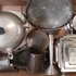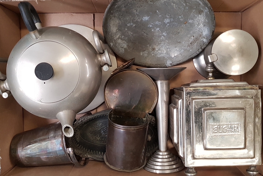 Lot curiosa een metalen Art Deco stijl theepot met houder, metalen suiker voorraaddoos, kandelaar en meer. 20e eeuw. |