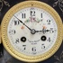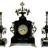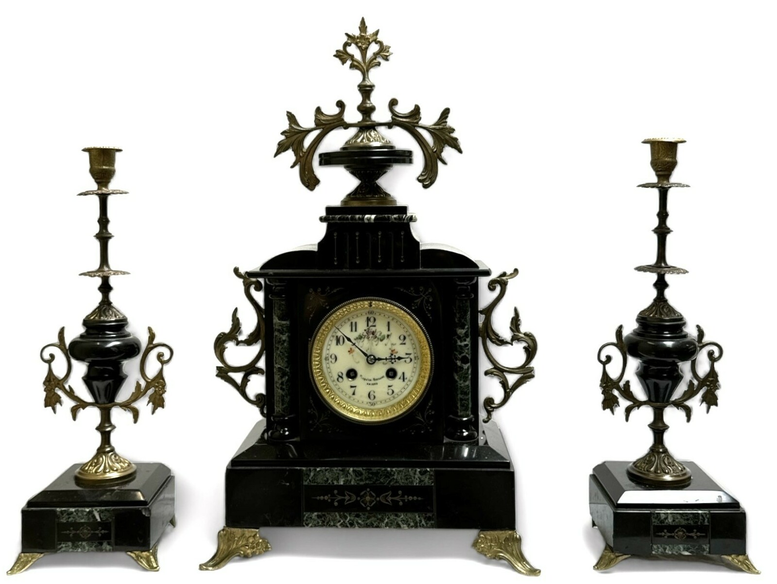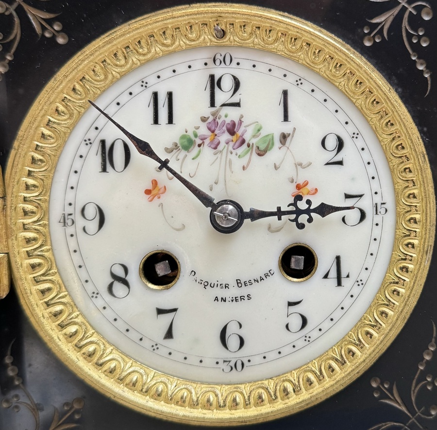 Marmeren Franse mantelklok met floraal gedecoreerde geëmailleerde wijzerplaat tezamen met twee kandelaren met bronskleurige messing montuur. Wijzerplaat gemerkt Pasquier-Besnard, Angers. Frankrijk, tweede helft 19e eeuw. |
