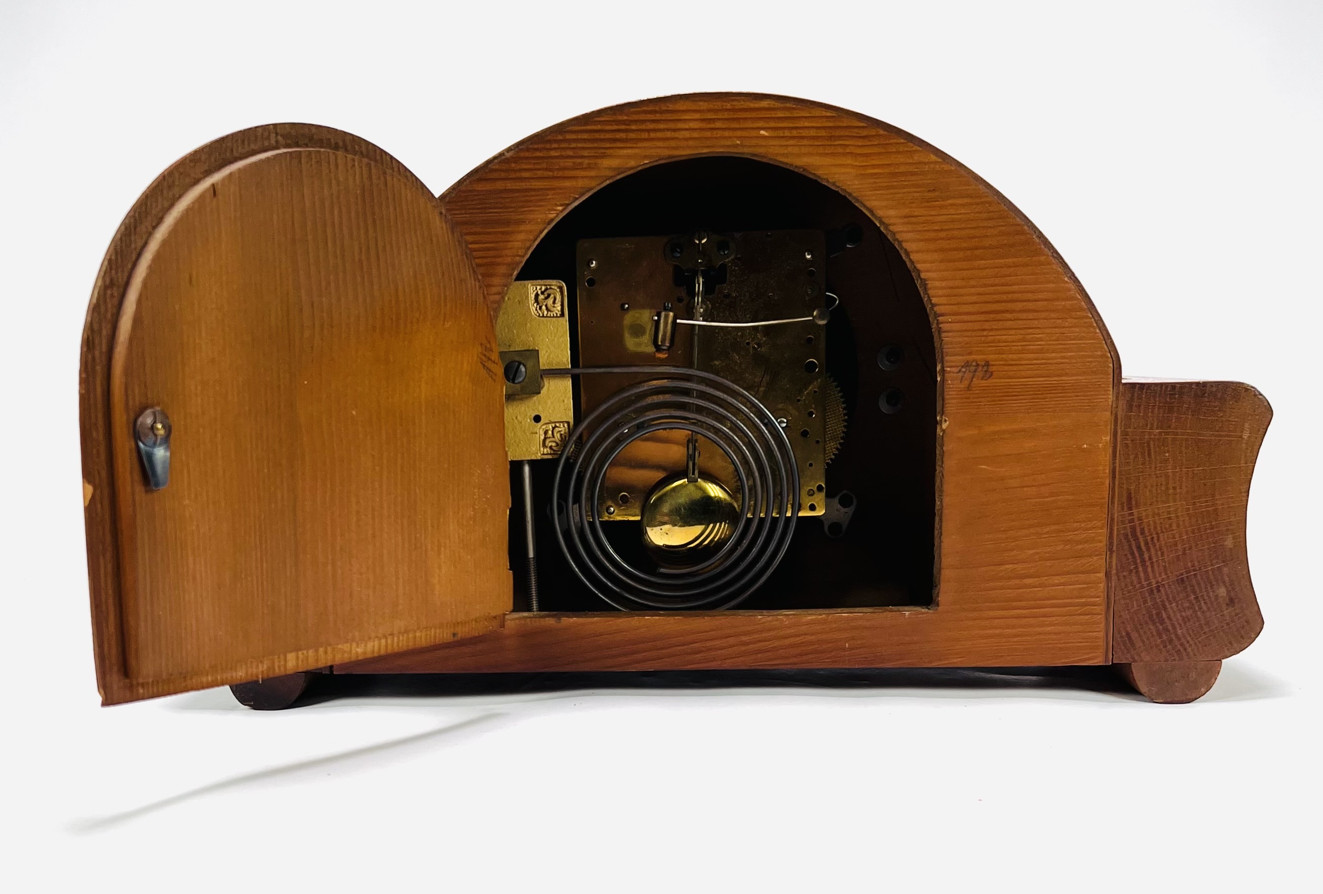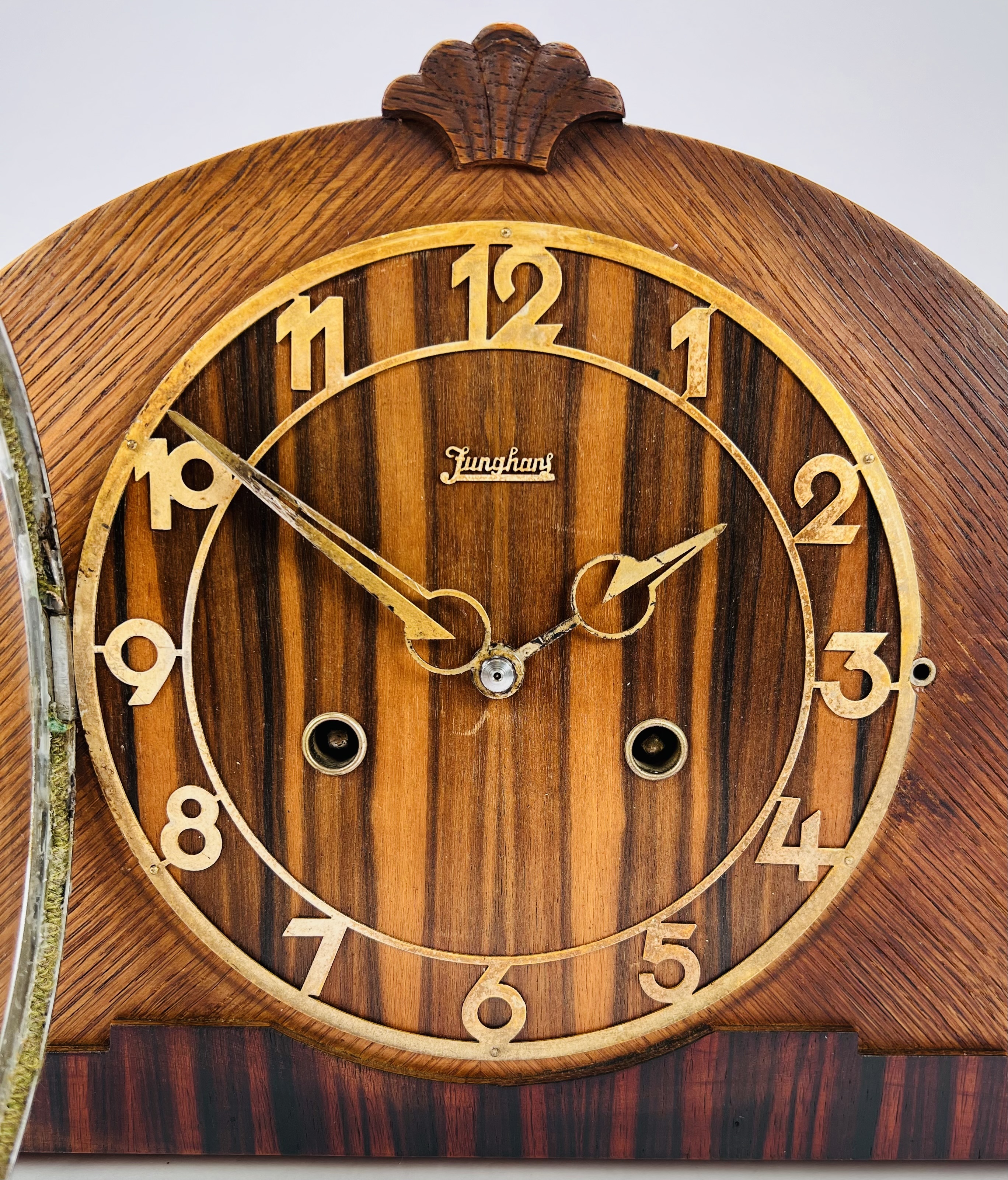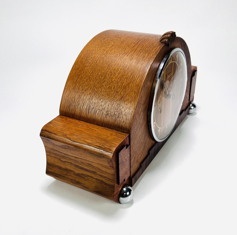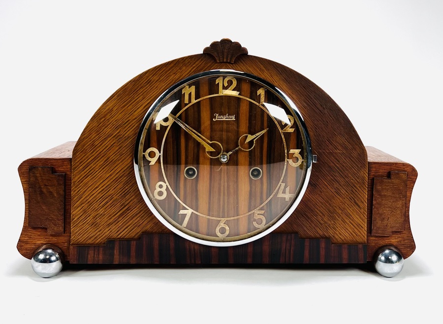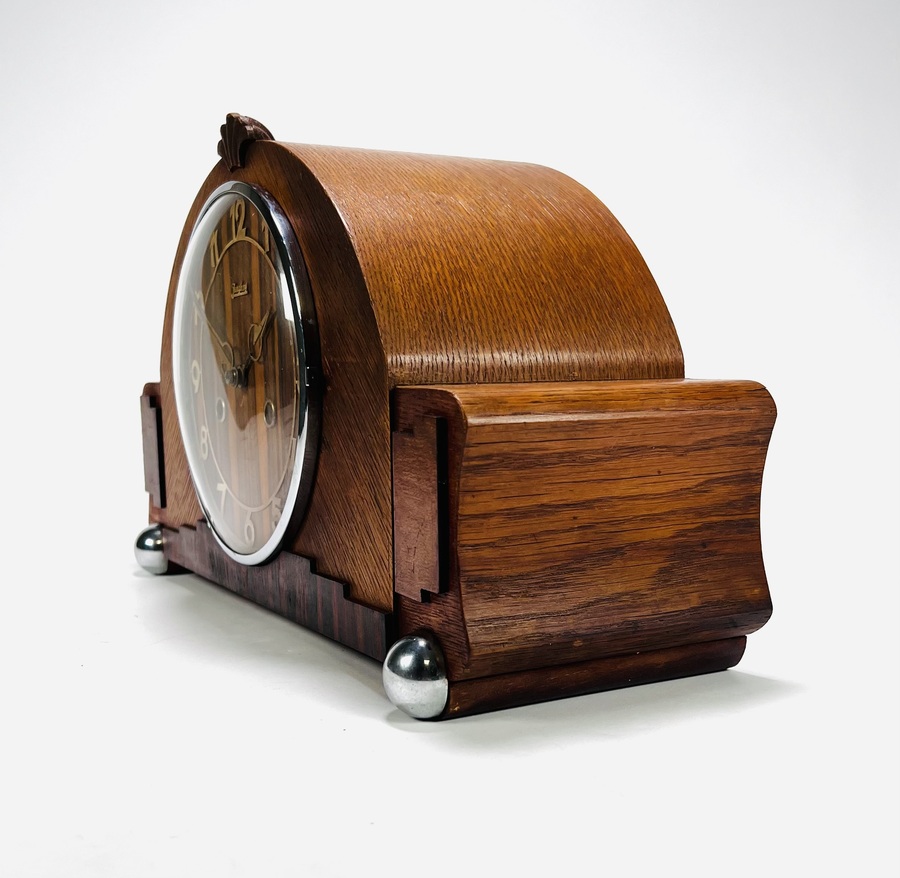Houten Art Deco mantelklok door Junghans met verchroomde bolpoten en met palissanderhoutfineer wijzerplaat. Duitsland, jaren 30. |
