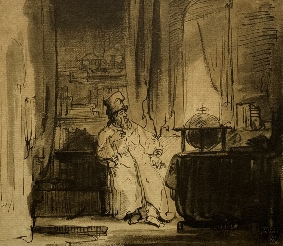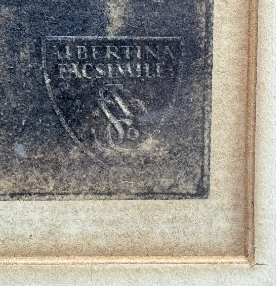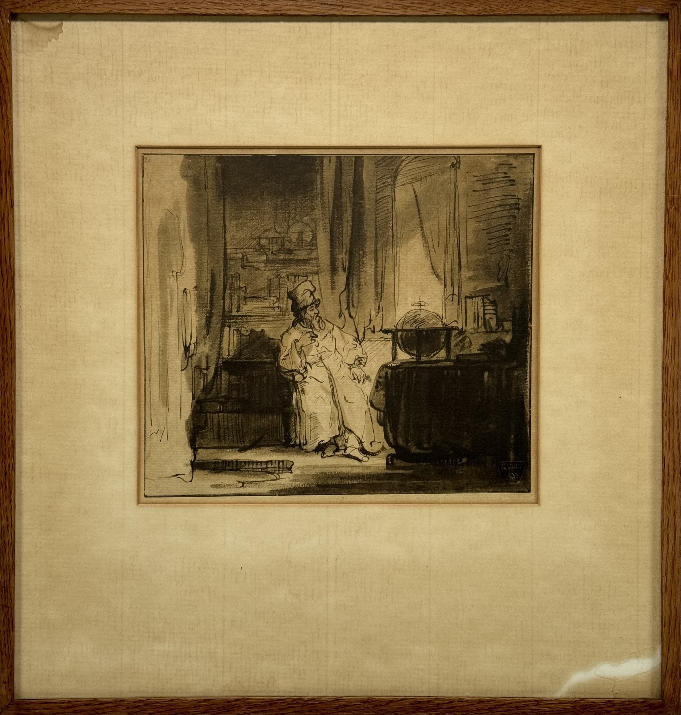 Lithografie getiteld “De filosoof” naar een ets van Rembrandt. Rechtsonder stempel Albertina Facsimile. Gedrukt namens het Weense Museum Albertina, jaren 20/30. |