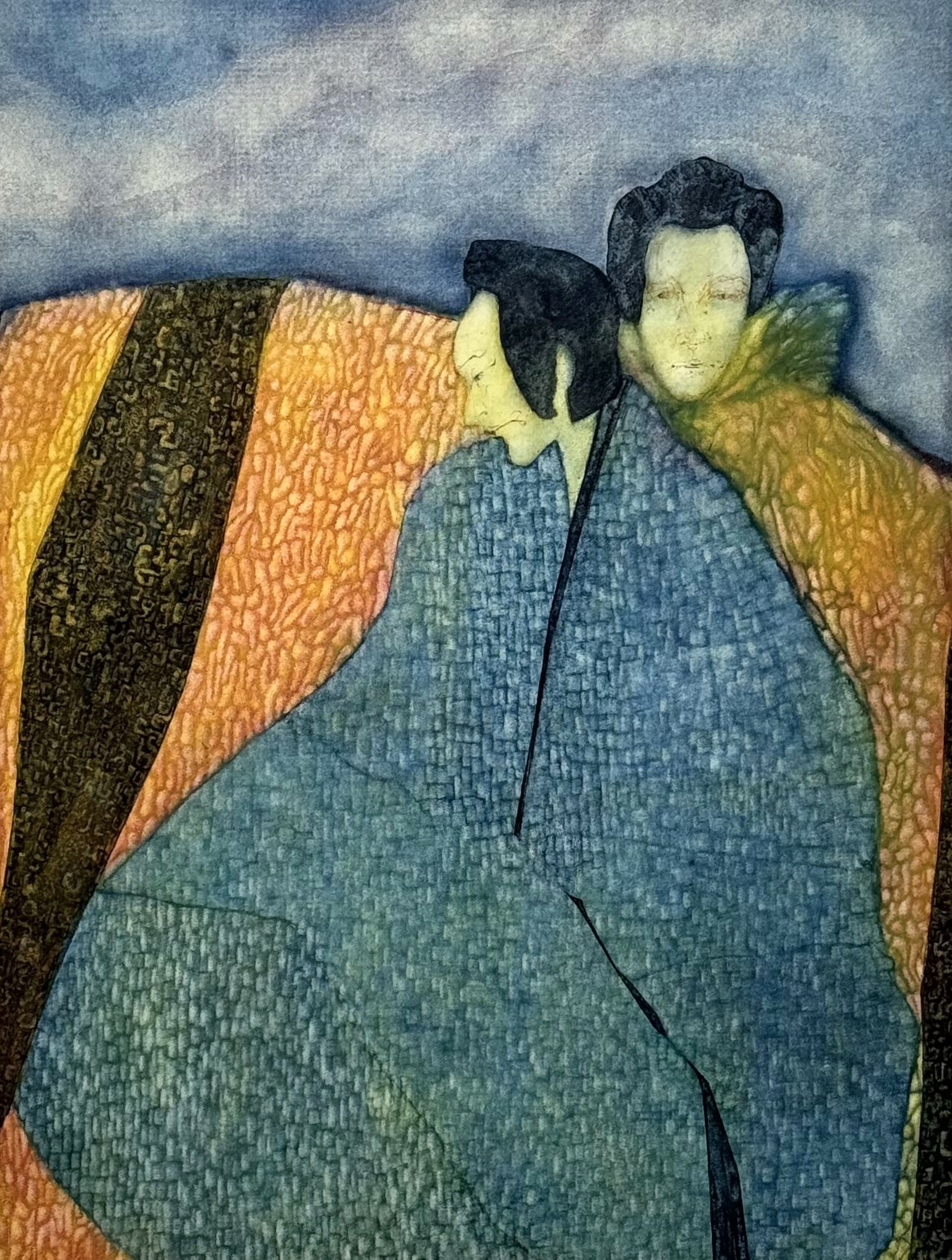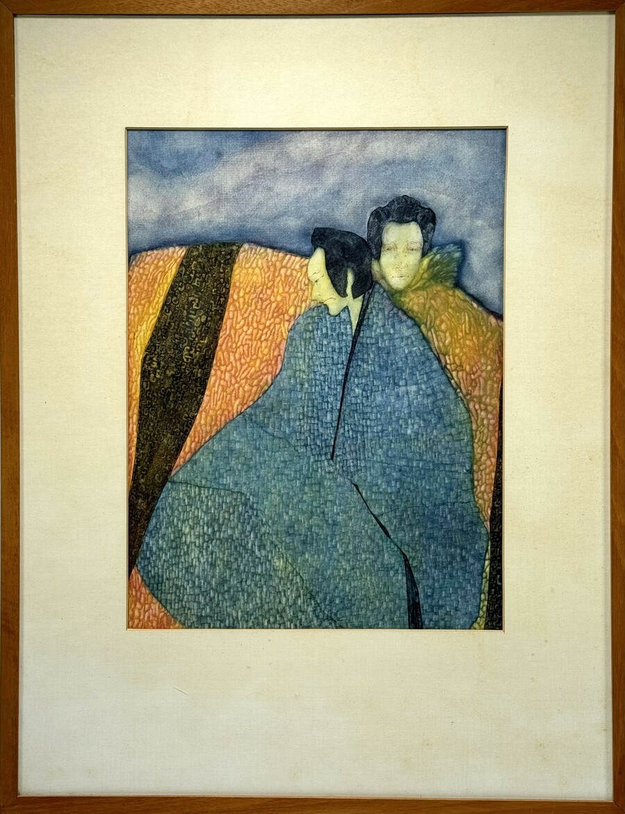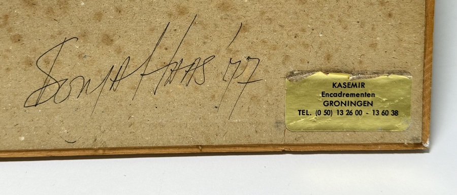 Schilderij met twee Oosterse personen door Sonja Haas, gemengde techniek op papier. Achterzijde informatie en datering 1977. |
