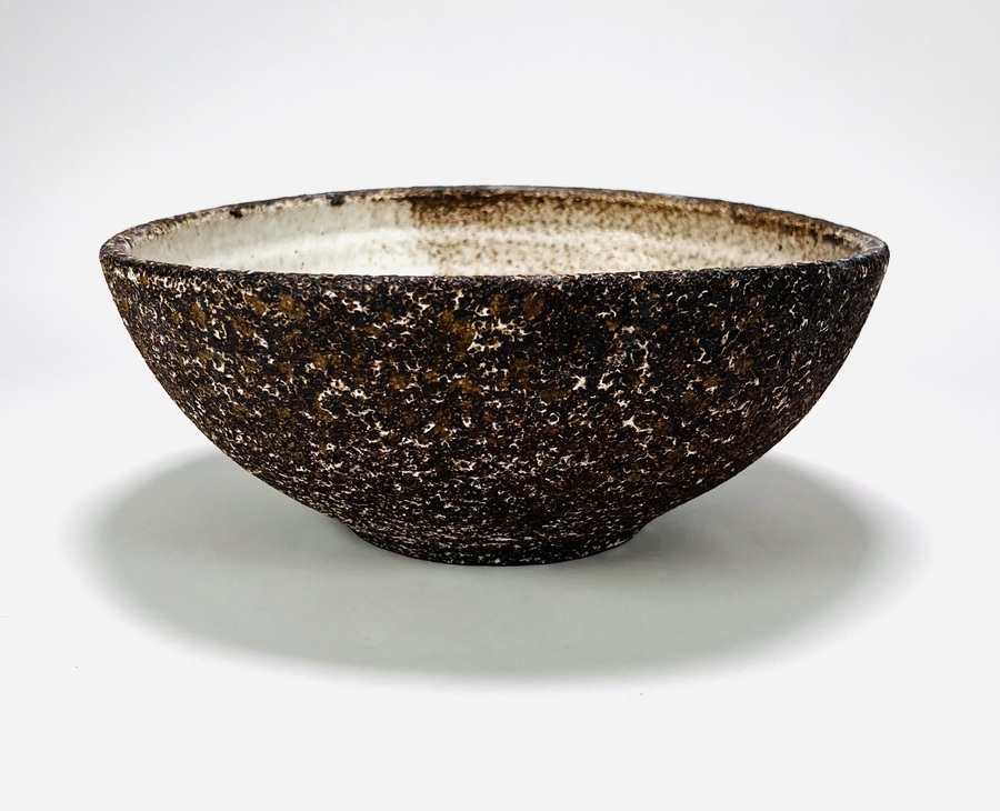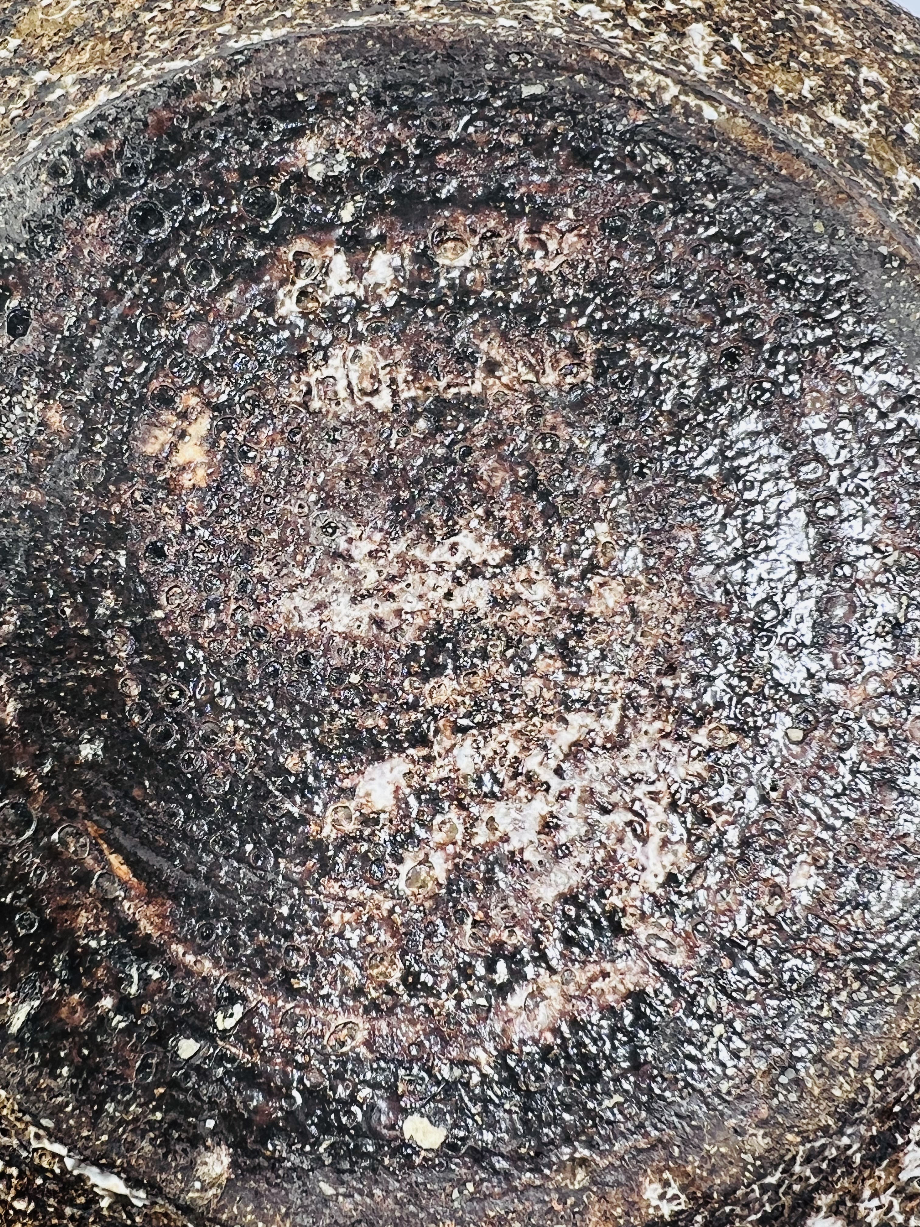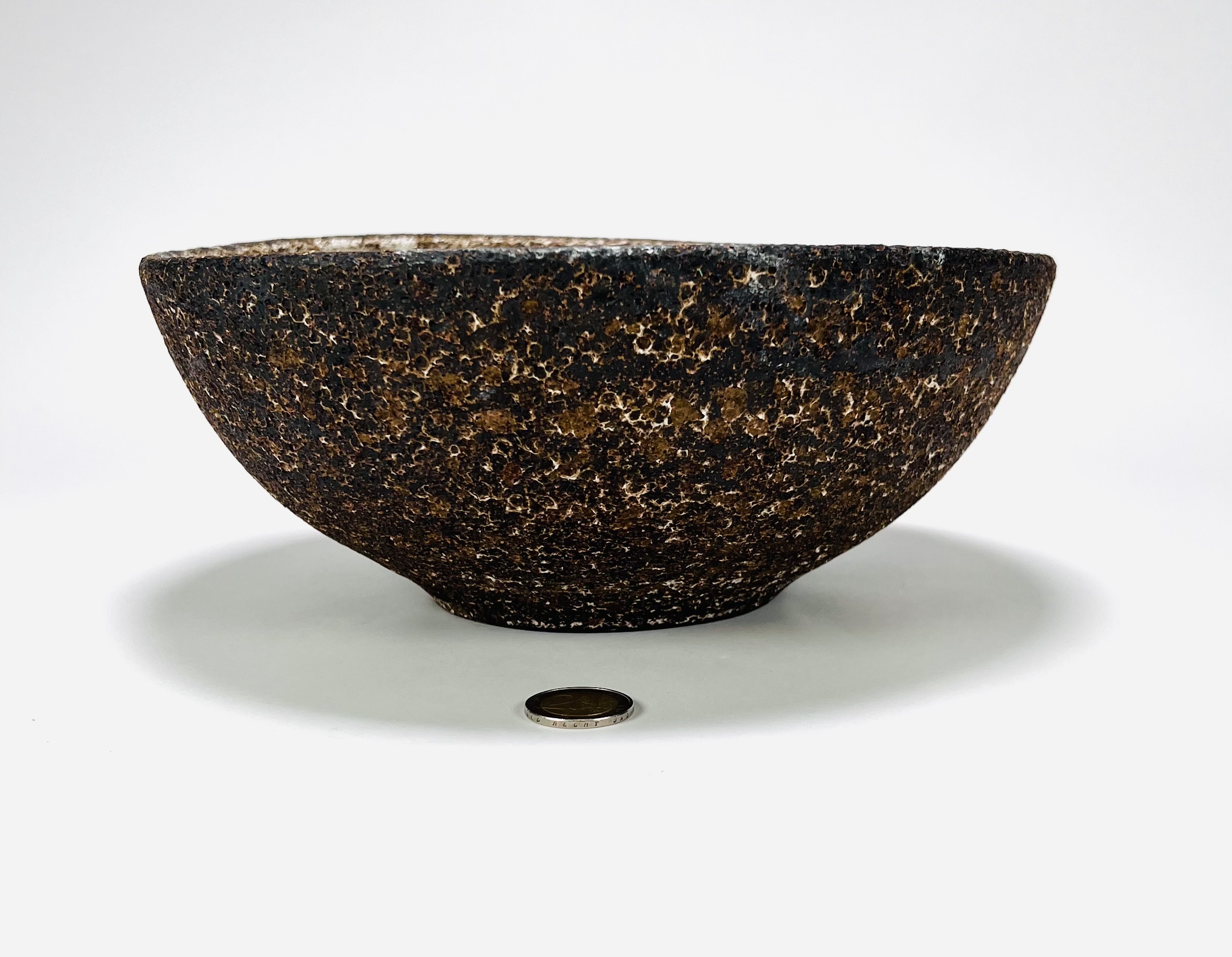 Bruine aardewerken schaal met bruisglazuur door Zaalberg. Aan de onderzijde gemerkt Zaalberg Holland, jaren 70. |