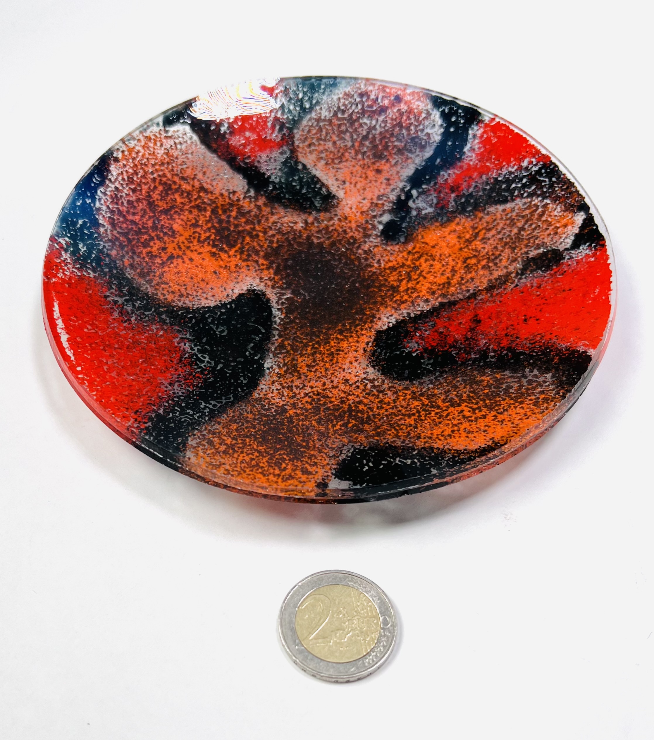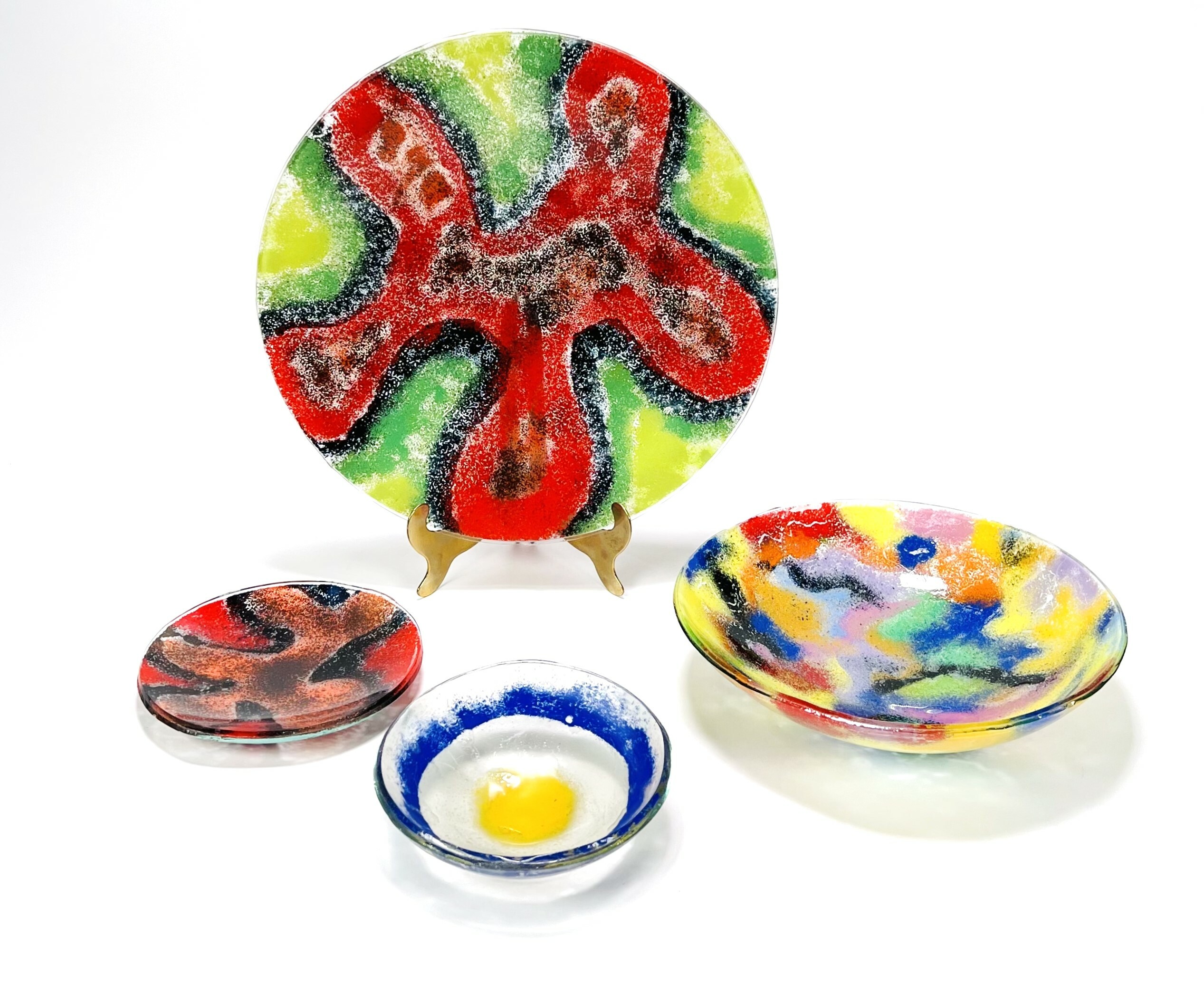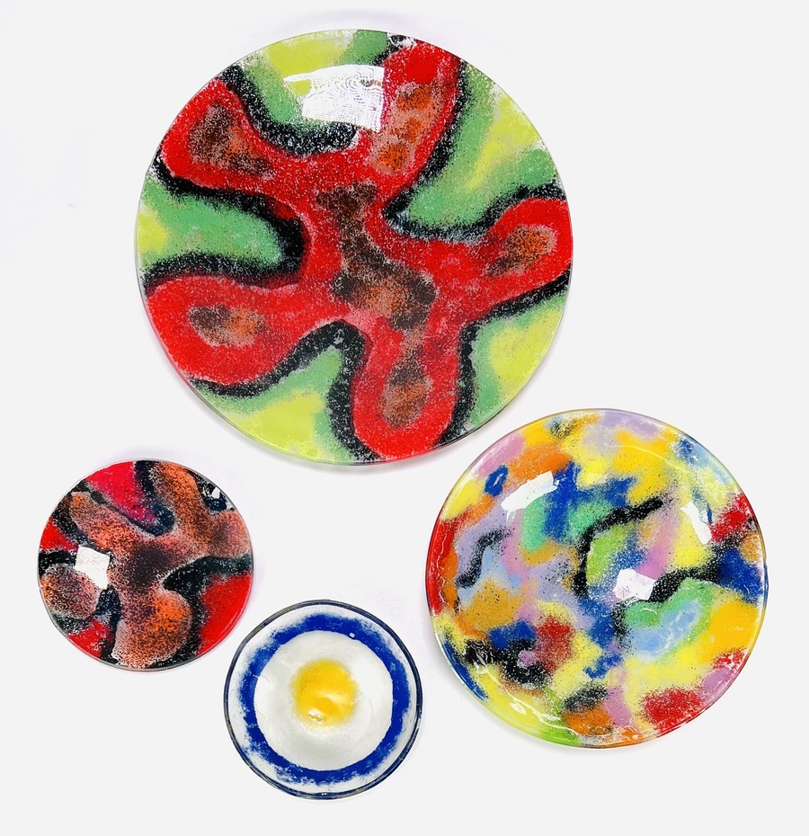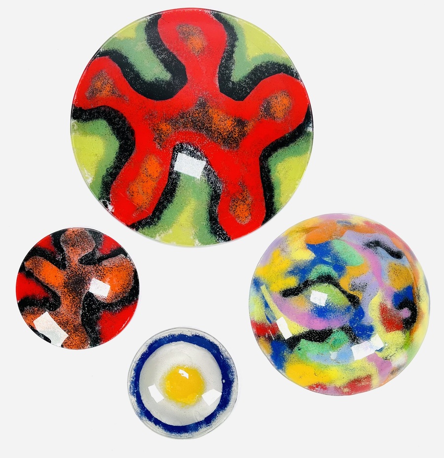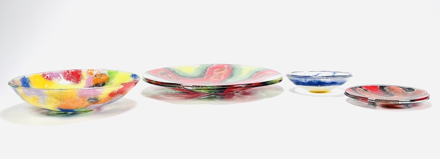 Vier dubbellaags polychroom gedecoreerde glazen schalen in fusion techniek, 21e eeuw. |