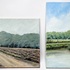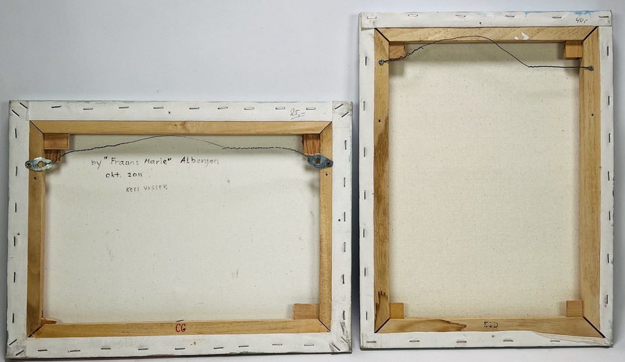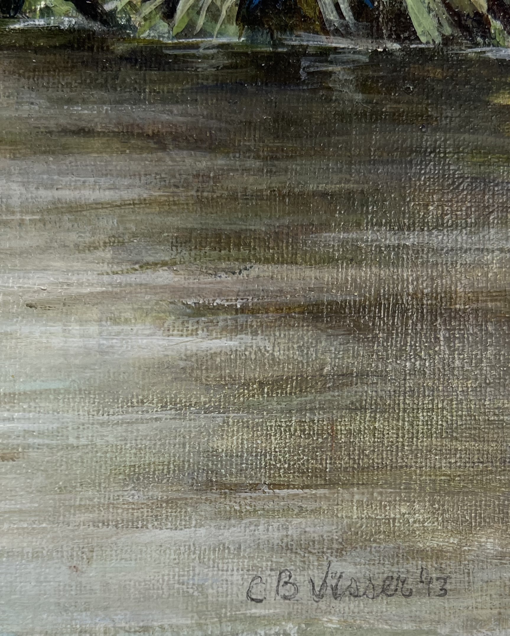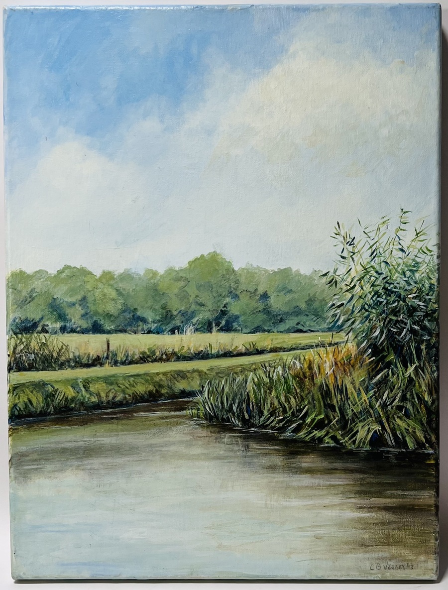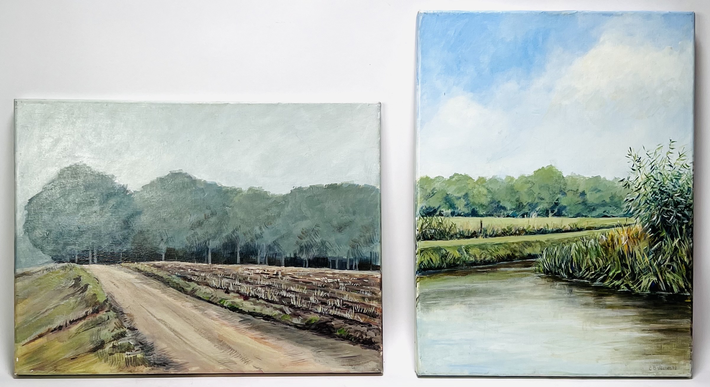 Twee landschappelijke schilderijen van akker met landweg en slootgezicht, acrylverf op linnen. Rechtsonder gesigneerd C.B Visser en gedateerd 1993 en 1994. |