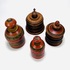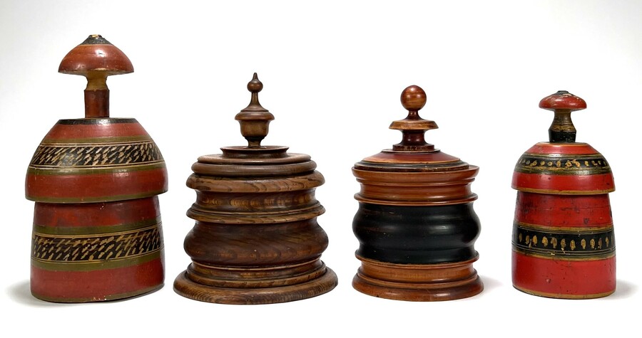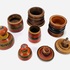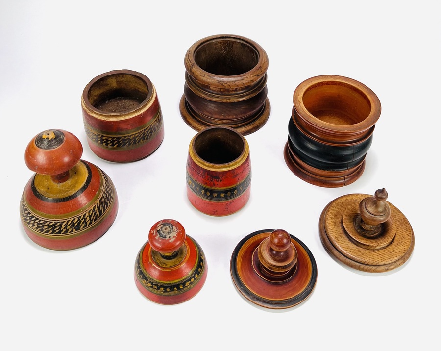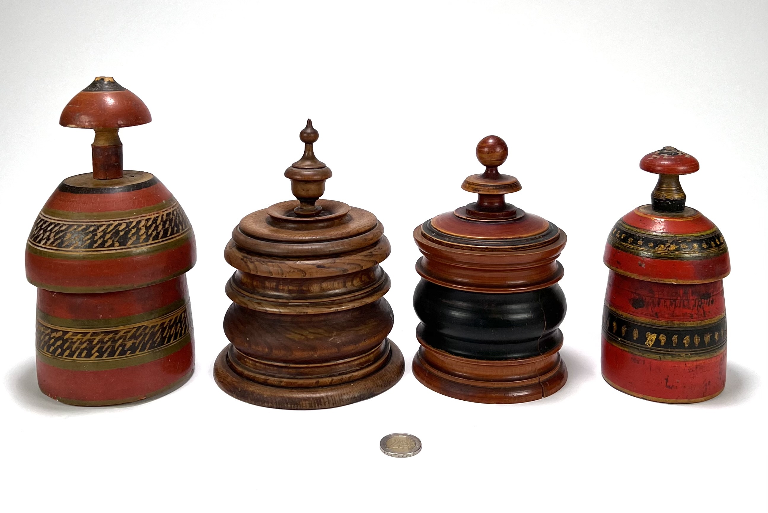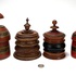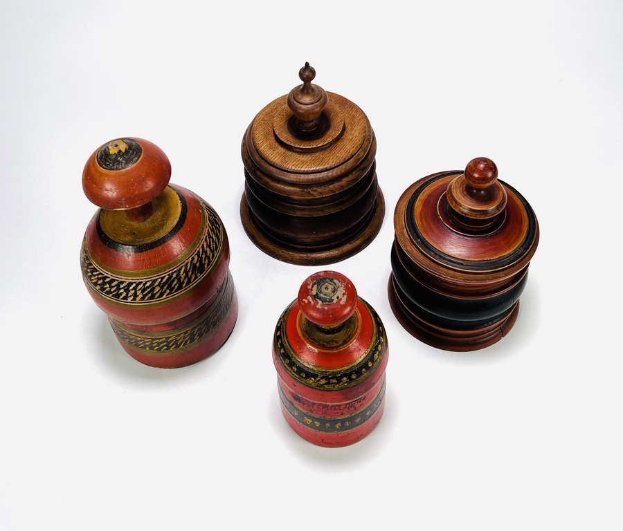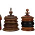 Twee houten gedraaide polychrome huqqs uit Noord-Soedan met paddenstoelvormige greep; een attribuut bij de Soedanese huwelijks ceremonie. Tevens twee tabakspotten. 20e eeuw. |