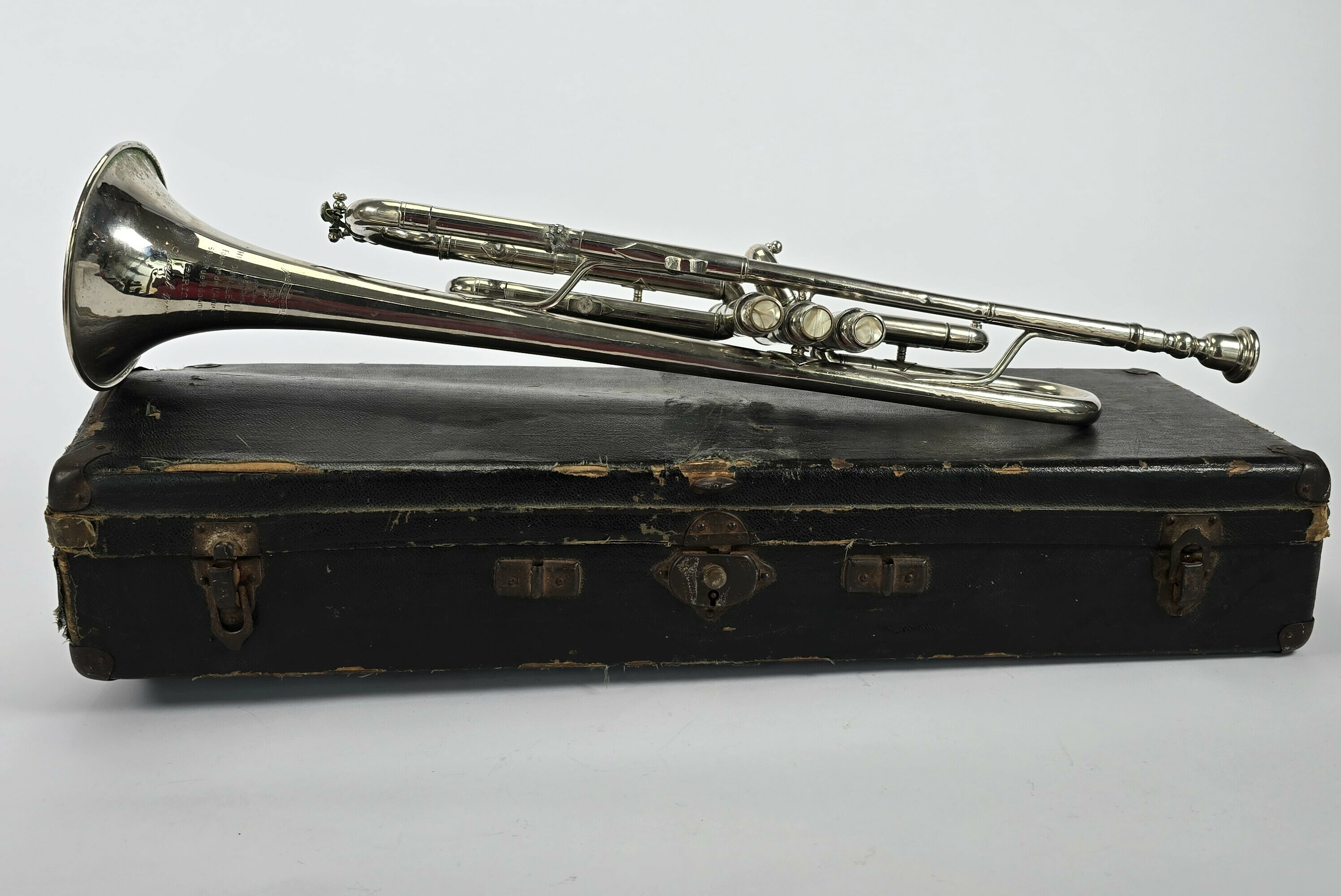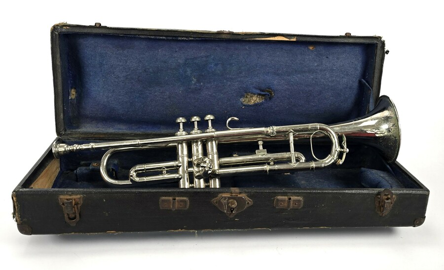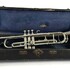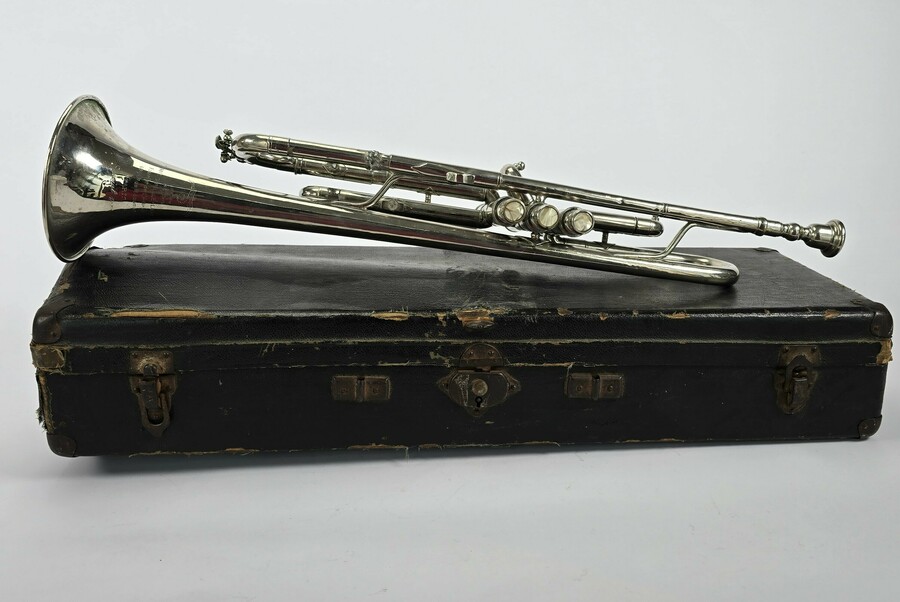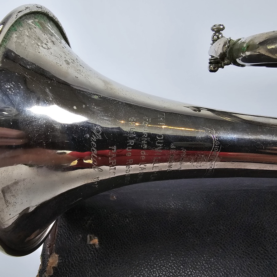 Franse trompet gemaakt door Jerom Thibouville Parijs met parelmoer op de vingerknoppen en in originele koffer. Omstreeks 1900. |