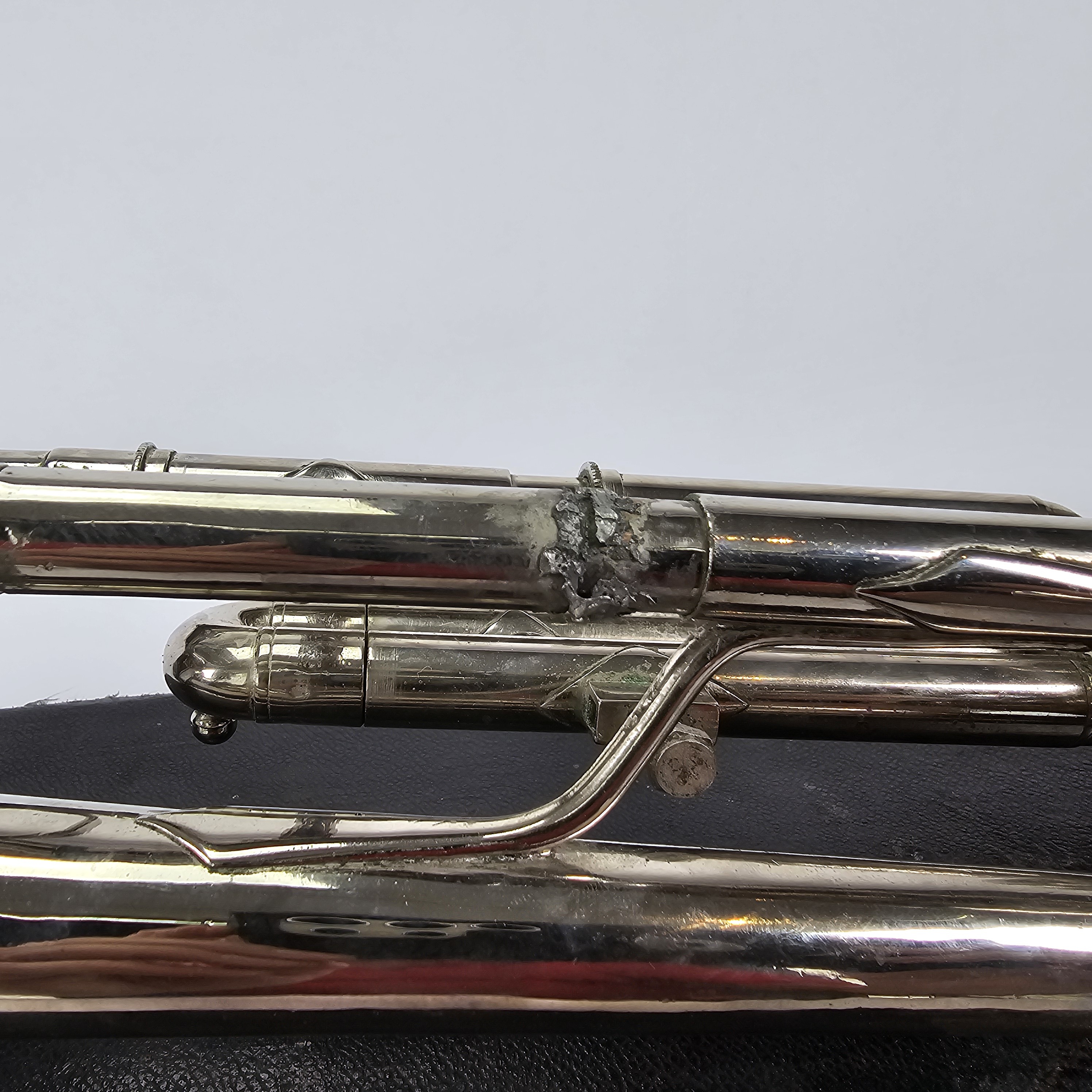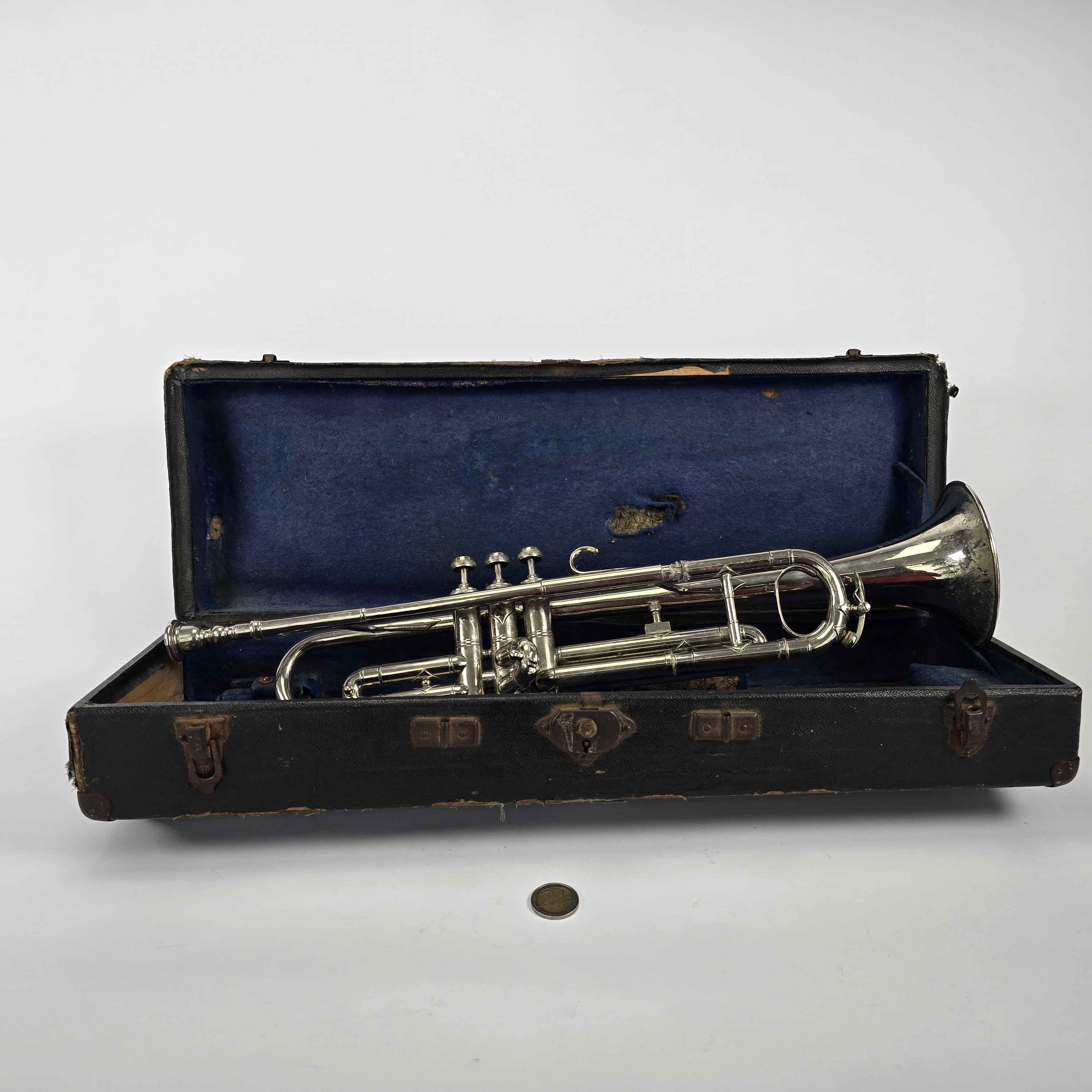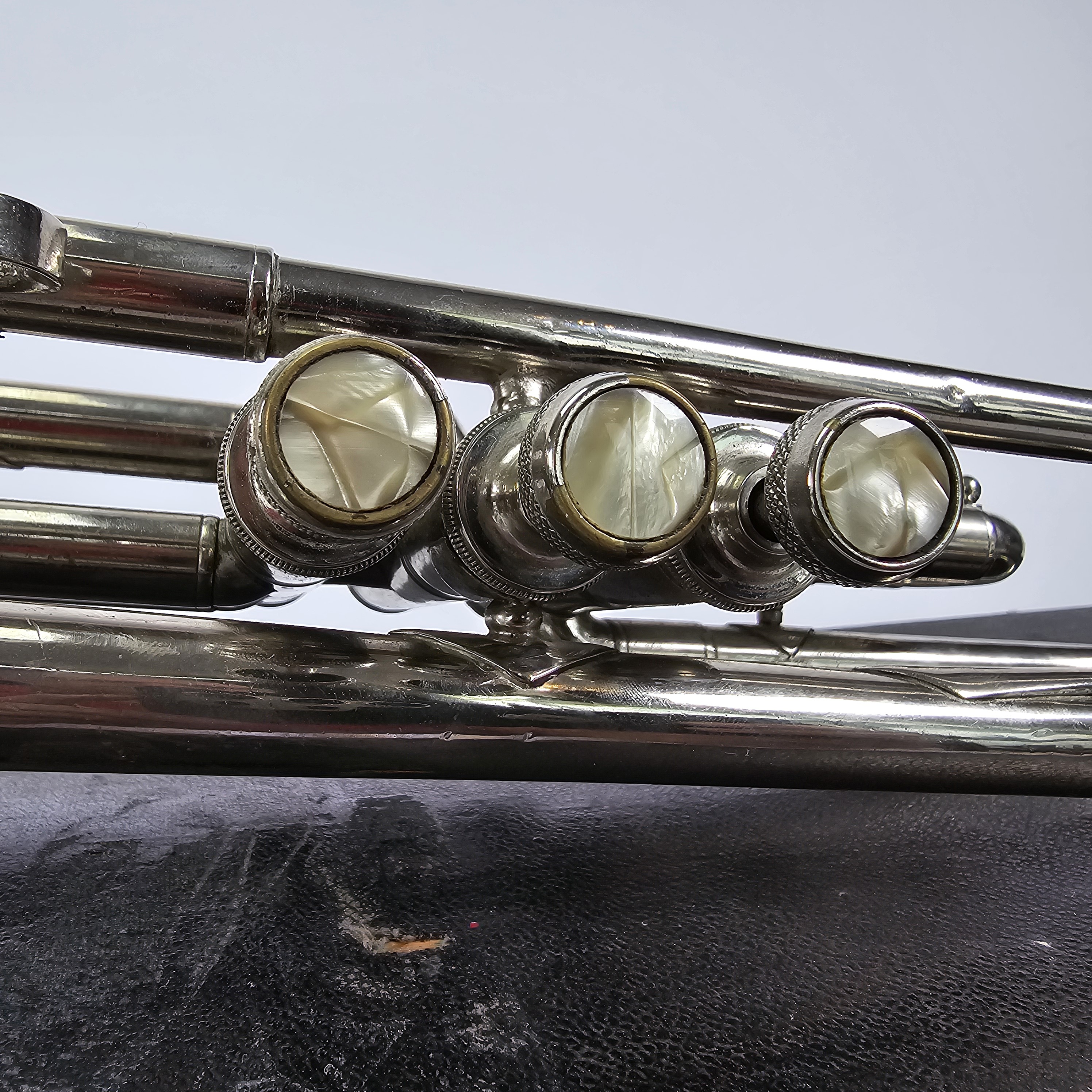 Franse trompet gemaakt door Jerom Thibouville Parijs met parelmoer op de vingerknoppen en in originele koffer. Omstreeks 1900. |