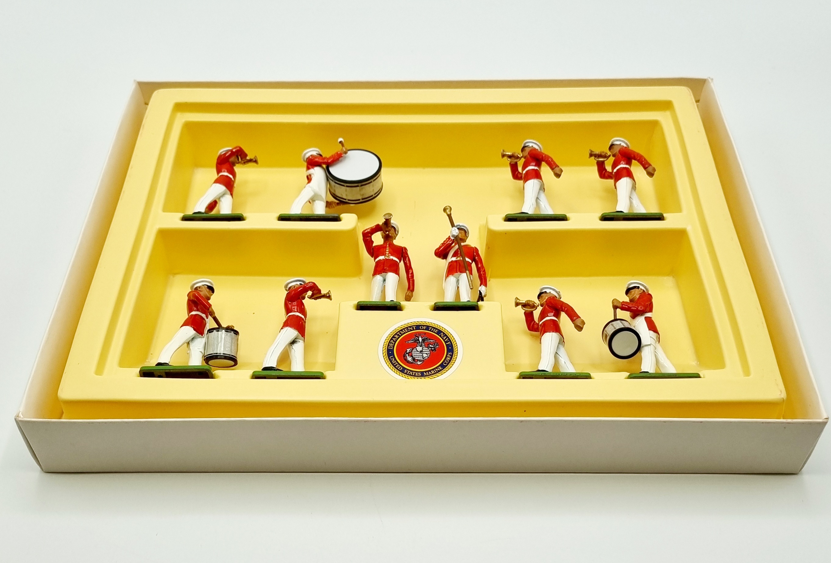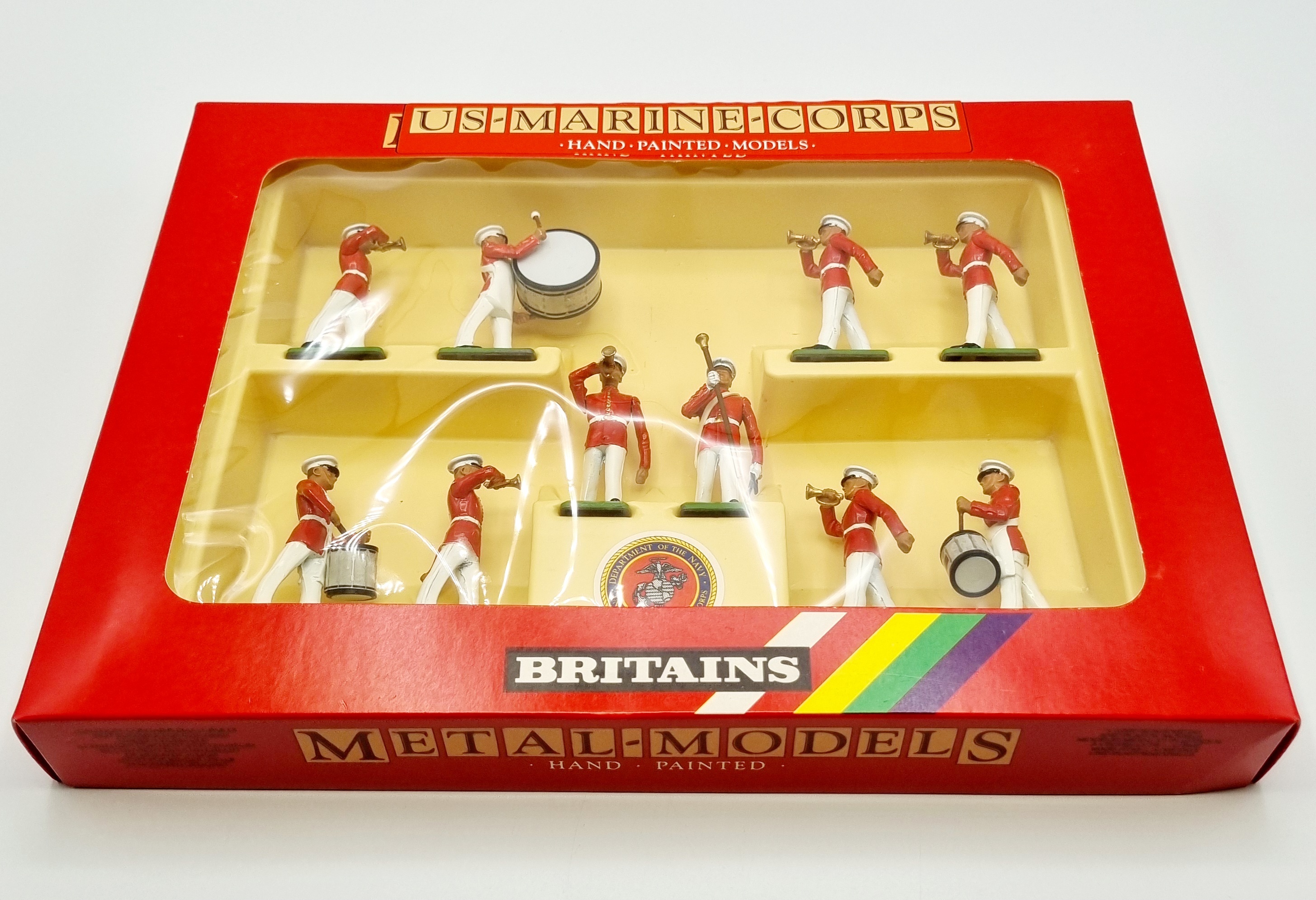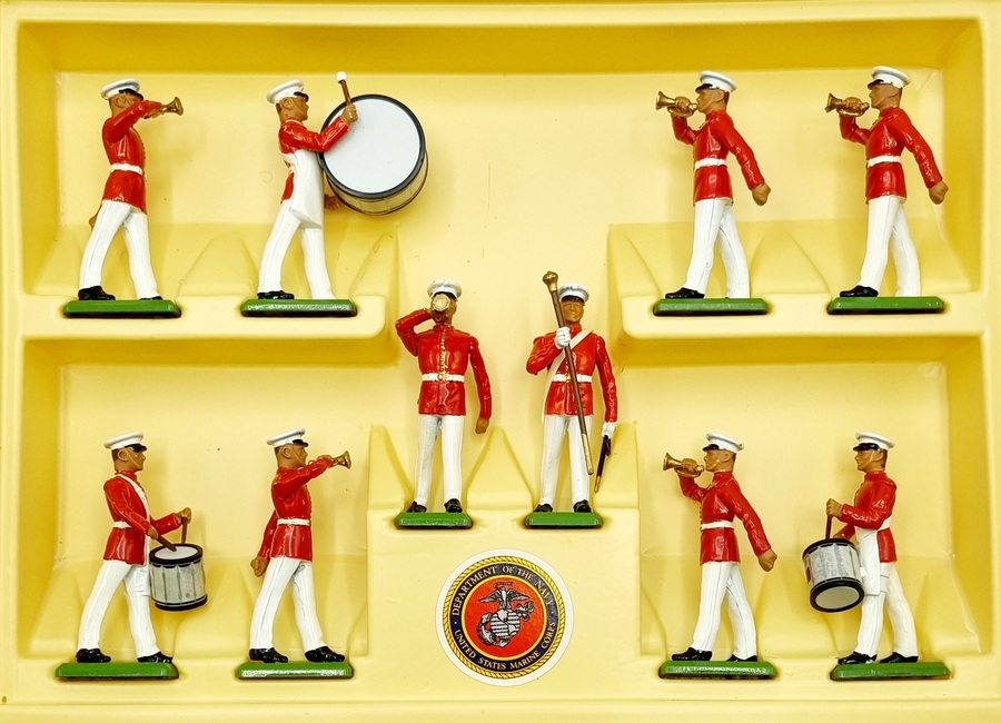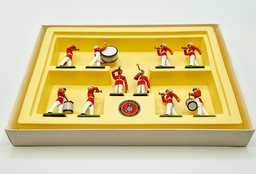 Uit de Britains Metal-Models serie een handbeschilderd militair orkest bestaande uit tien muzikanten van het U.S. Marine Corps in originele rode vensterdoos. Catalogus nummer 7305 uit 1987. |
