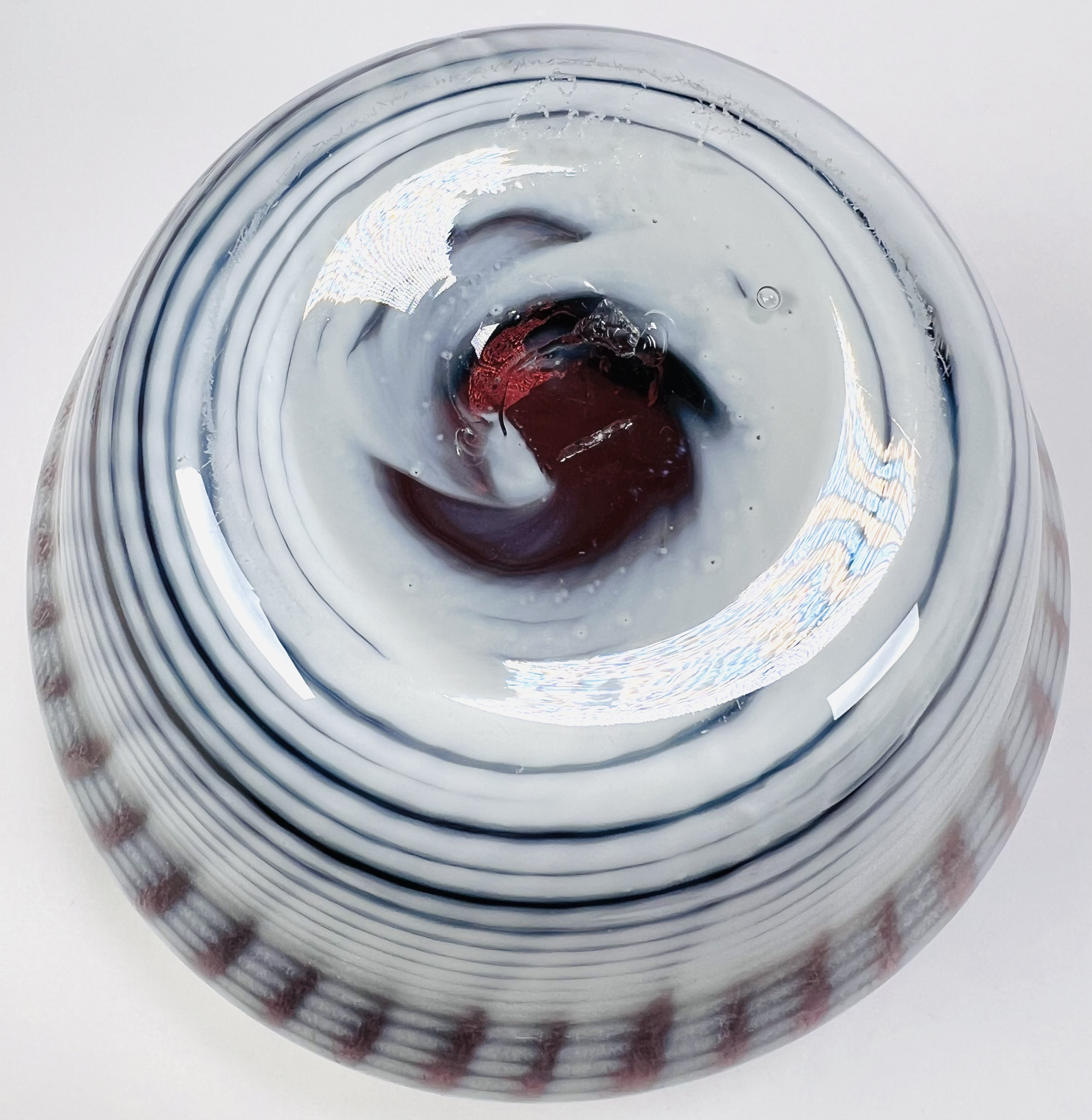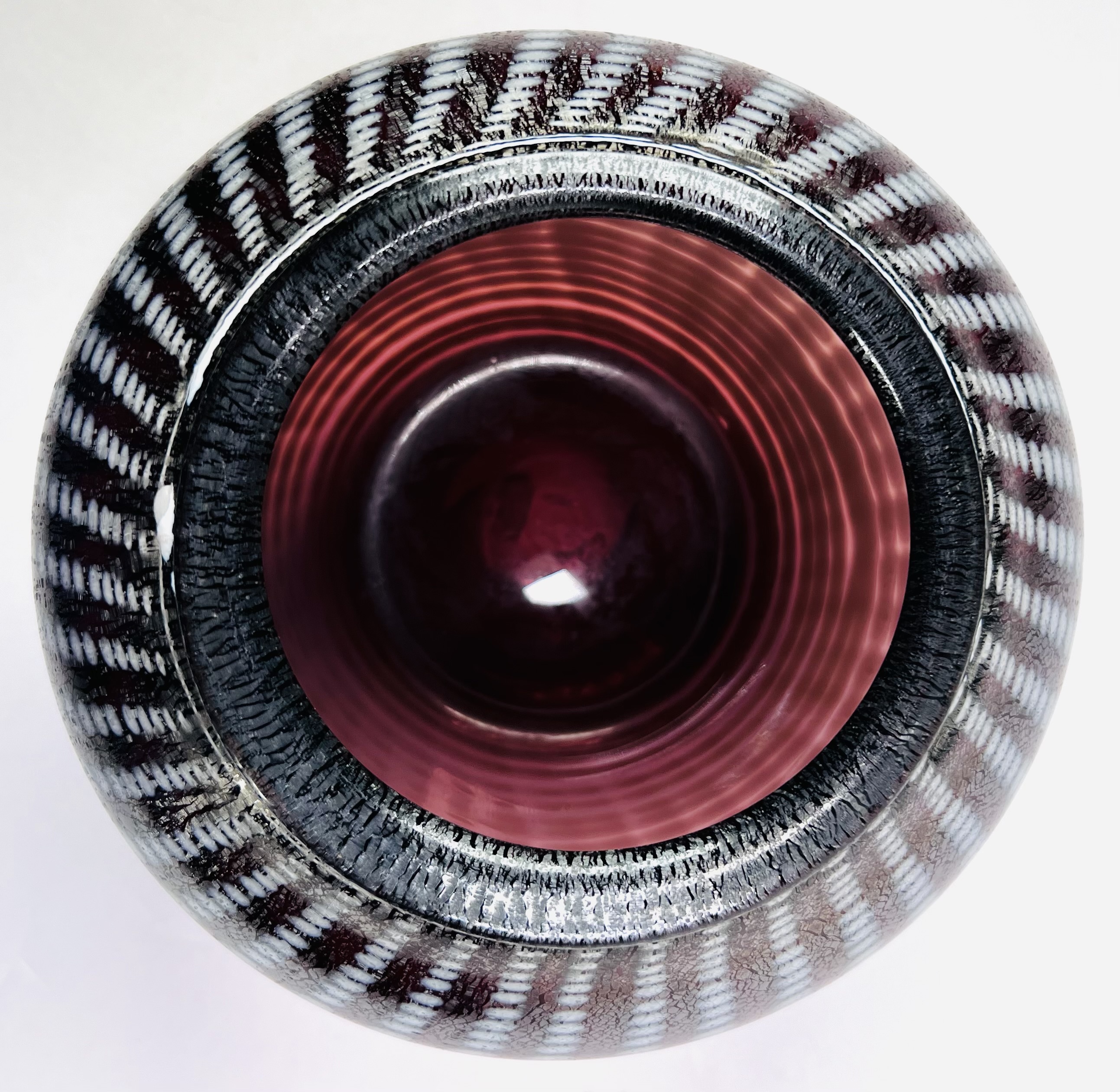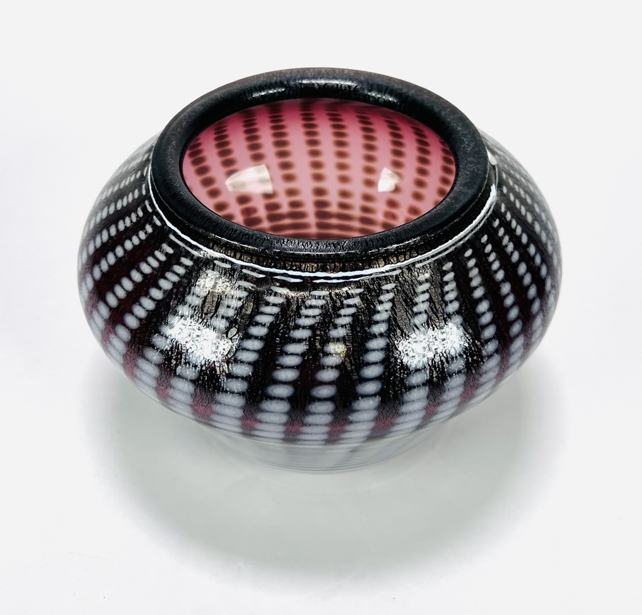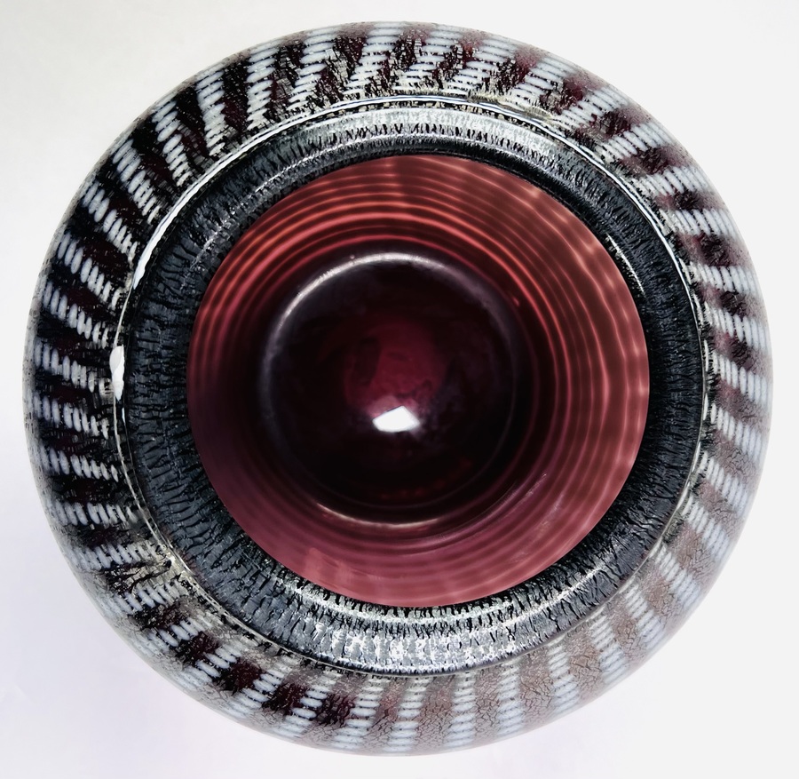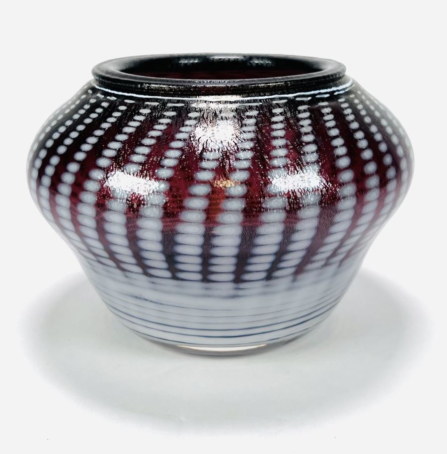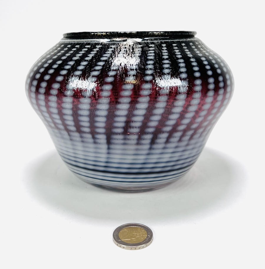 Glazen mondgeblazen vaas met witte punt decor en voorzien van tincraquelé structuur. Aan de onderzijde pontil aanwezig, tevens gegraveerd Cseh en 79, 20e eeuw. |