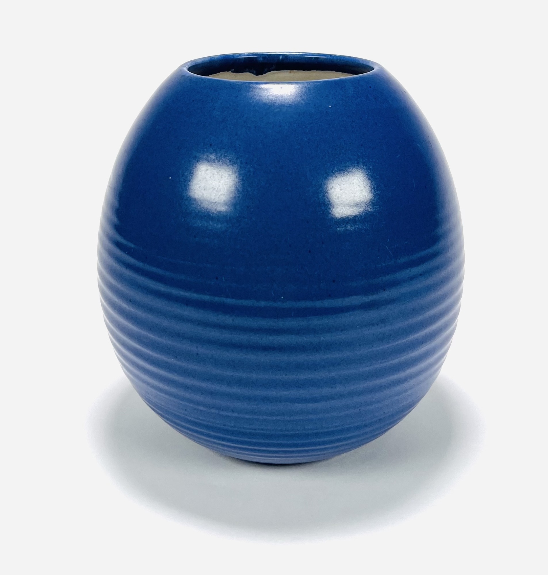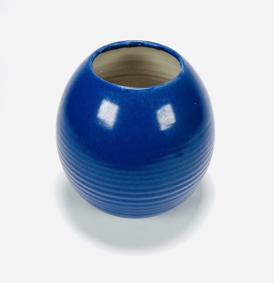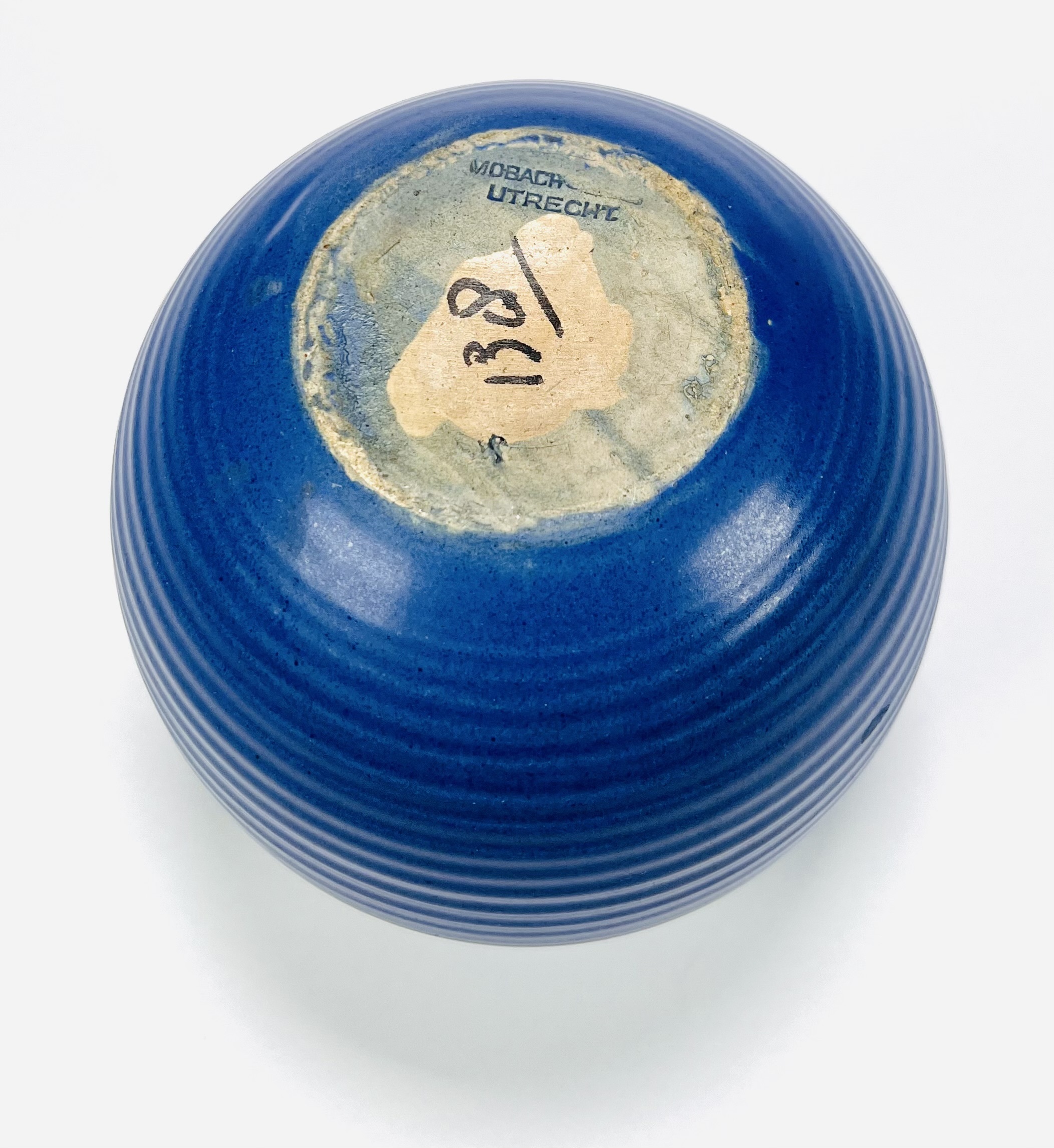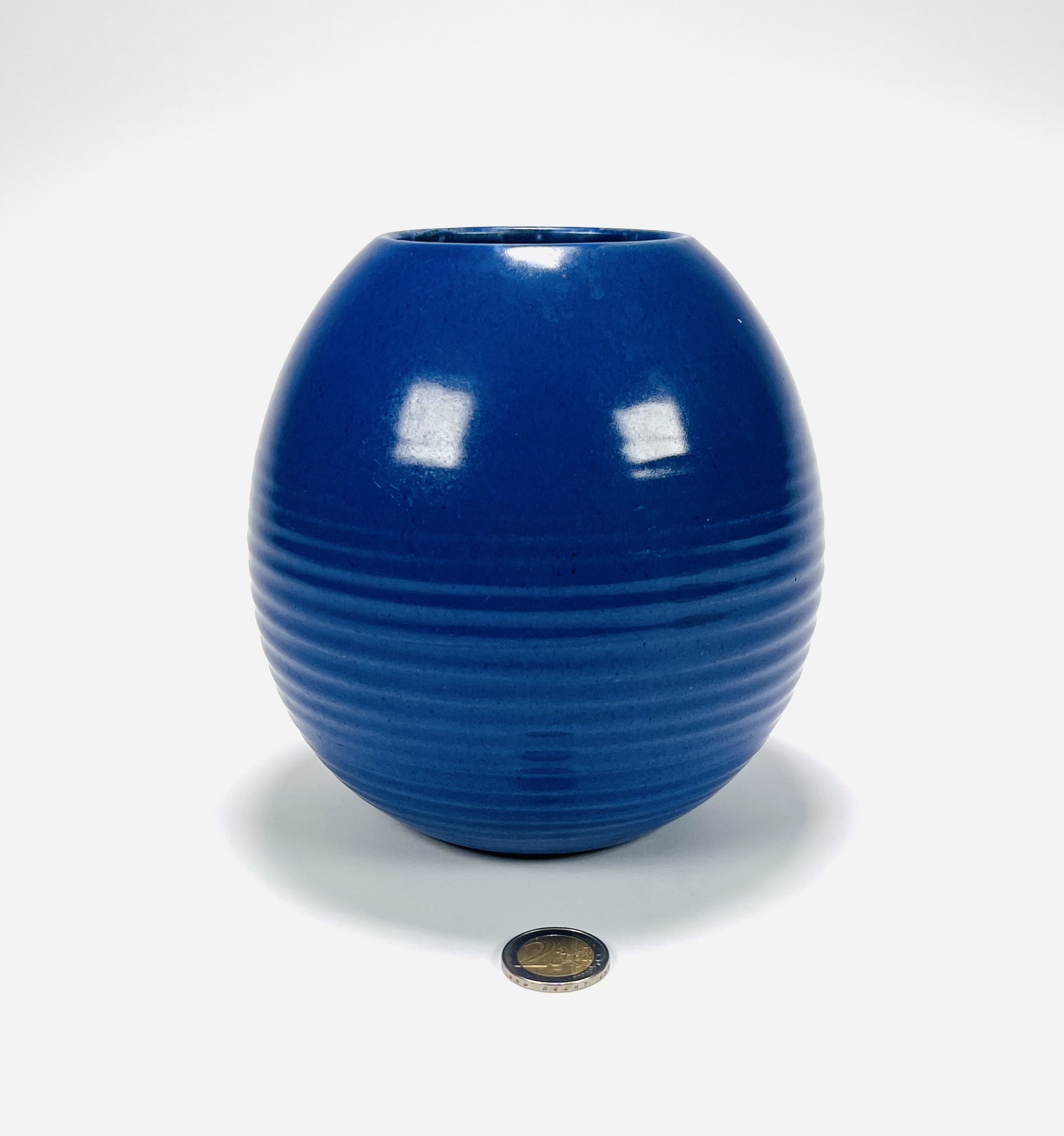 Blauwe geribbelde keramieken vaas door Mobach Utrecht. Aan de onderzijde gemerkt en vermelding van modelnummer, derde kwart 20e eeuw. |