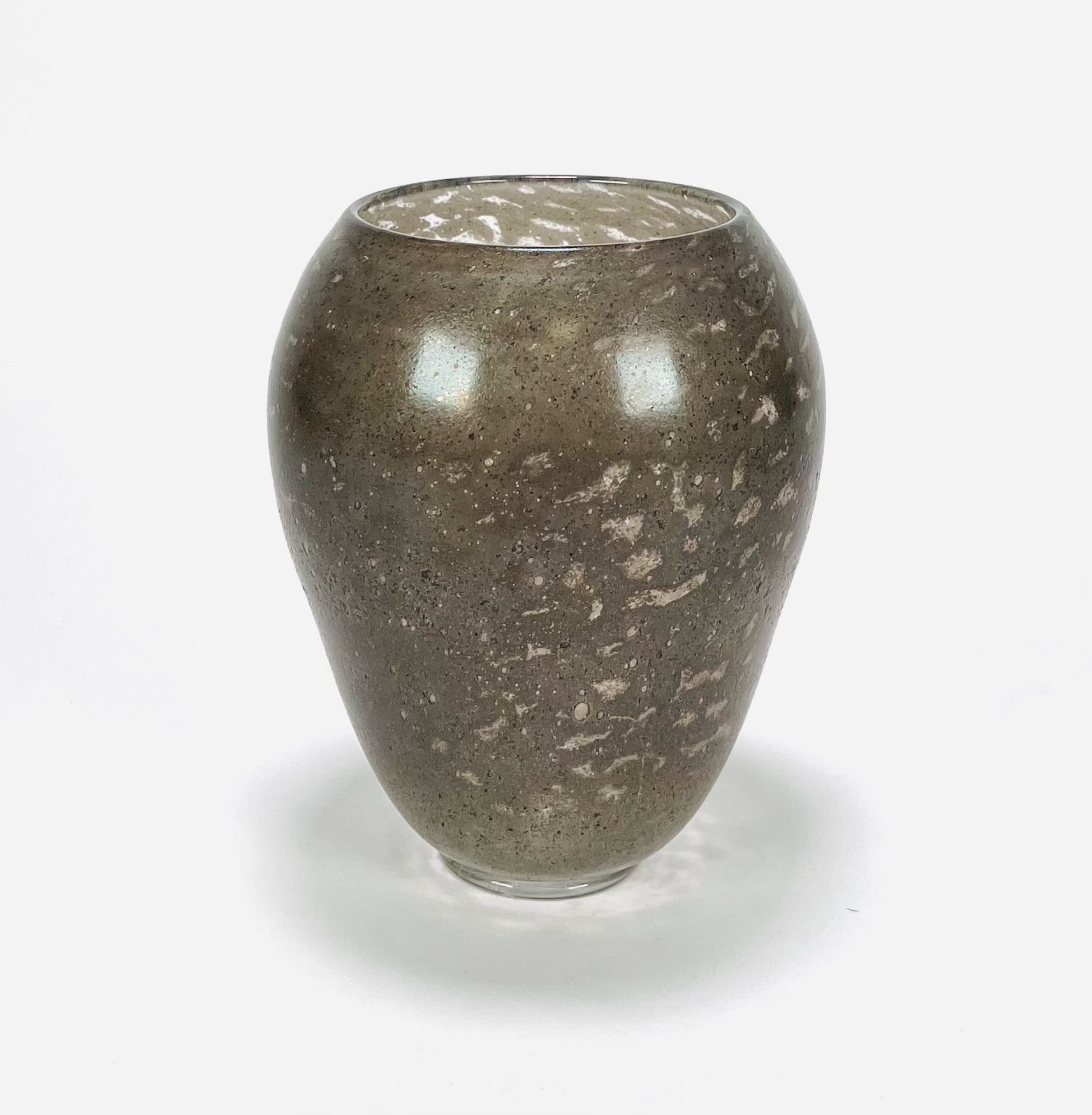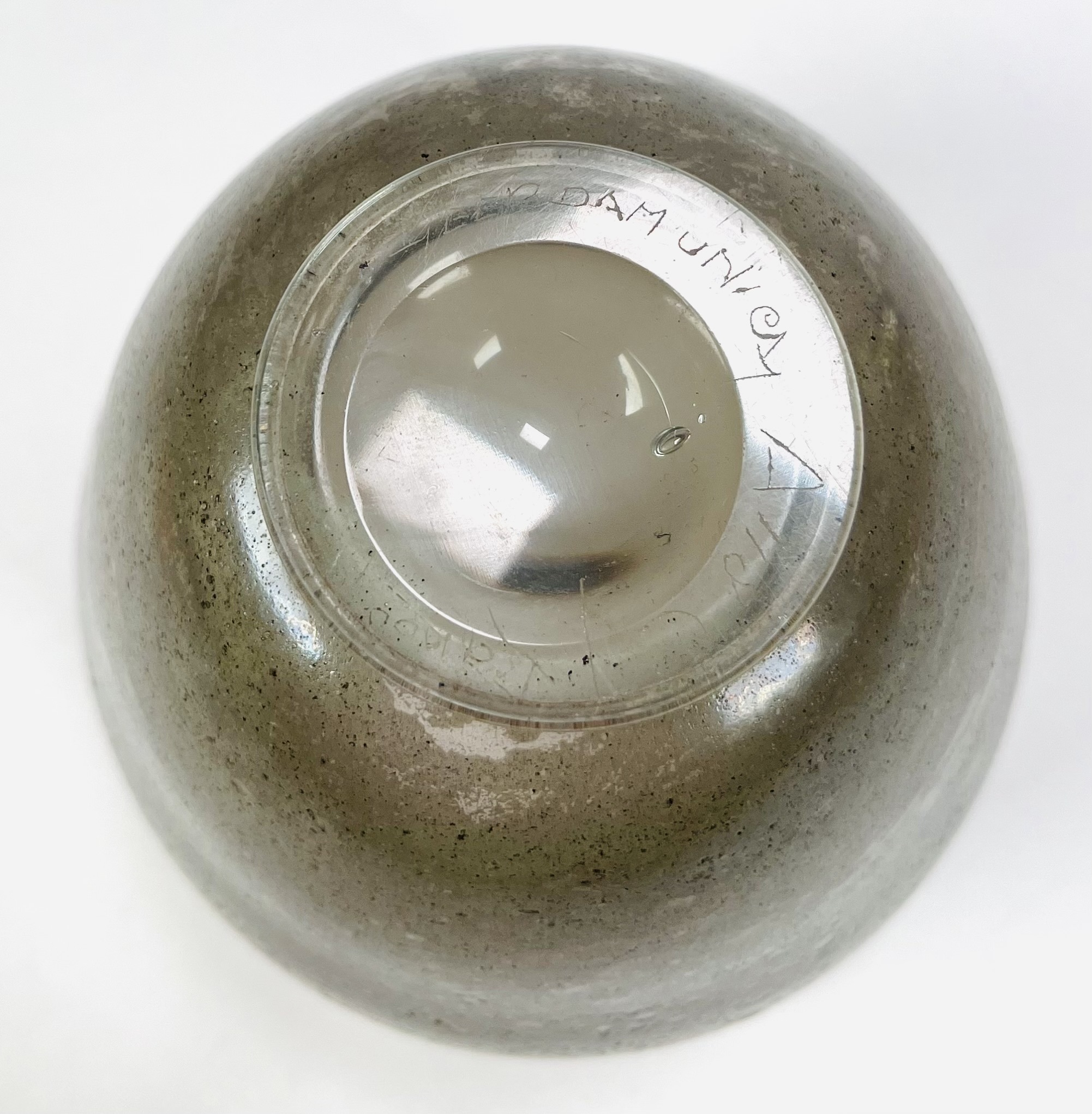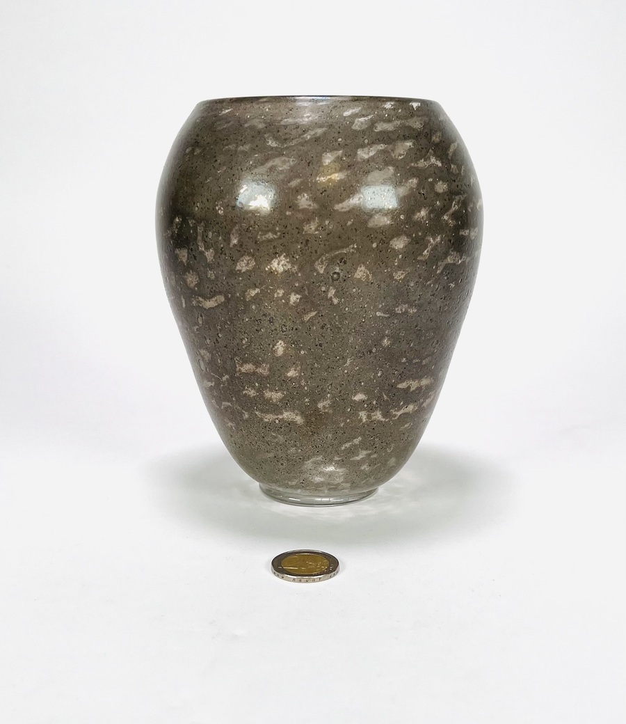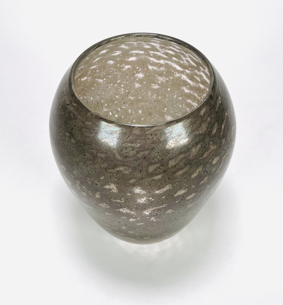 Grijze gevlekte vrijgeblazen kristallen unica vaas naar ontwerp van Christiaan Johannes Lanooy, modelnummer A118. Aan de onderzijde gesigneerd C.J. Lanooy, vermelding modelnummer en Leerdam Unica. Uitgevoerd door Glasfabriek Leerdam omstreeks 1927. |