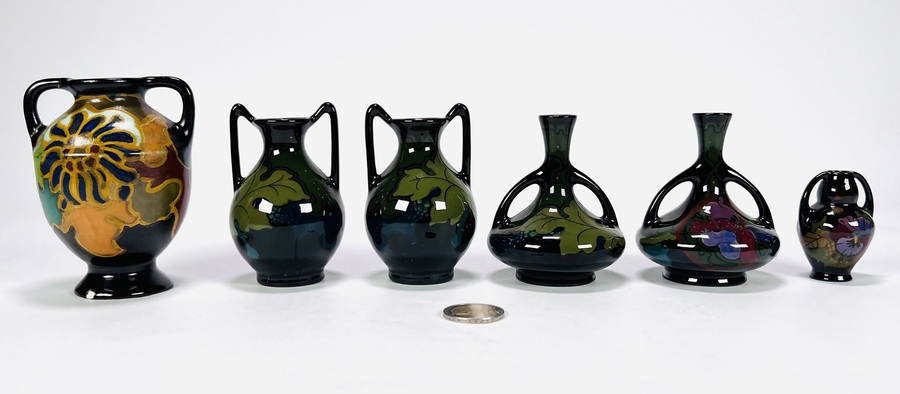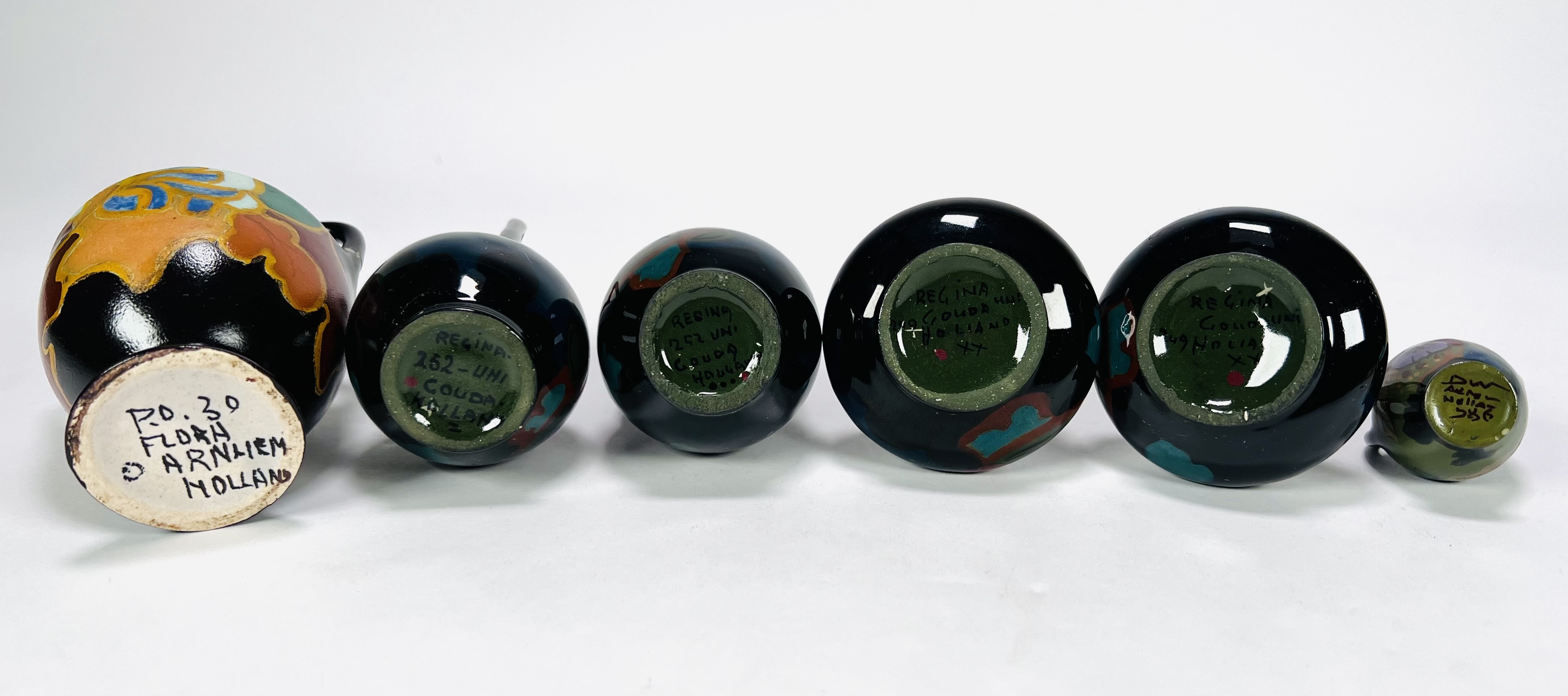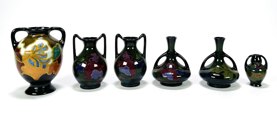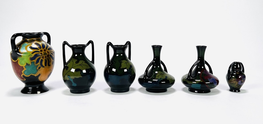 Convoluut met zes miniatuur Art Nouveau Gouda plateel vaasjes, vaasje aan de onderzijde gemerkt Regina met modelnummers. Tevens een miniatuur vaas Flora Arnhem. Eerste helft 20e eeuw. |