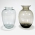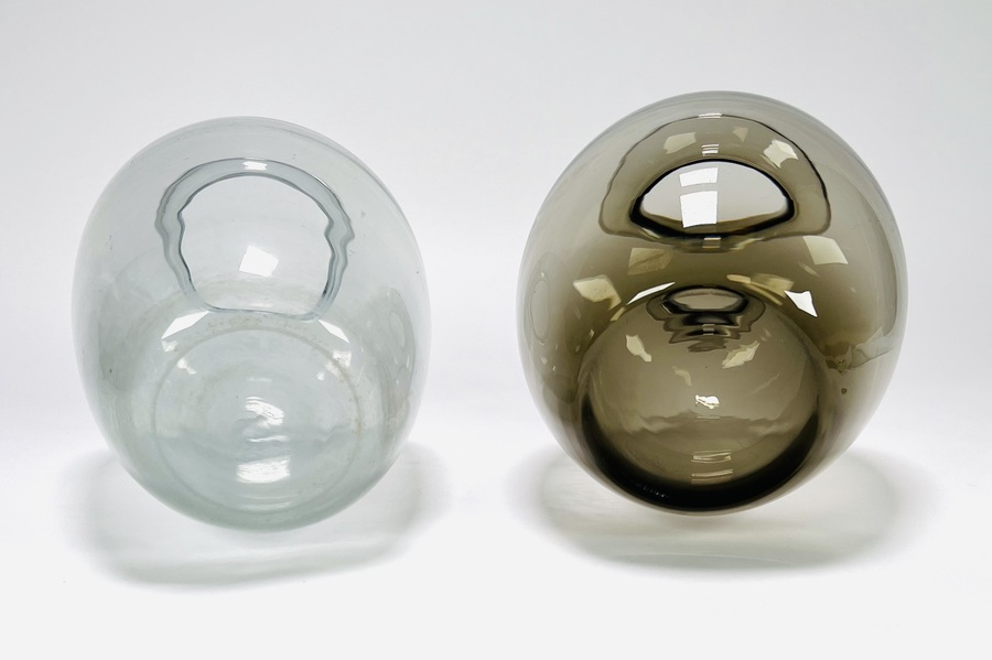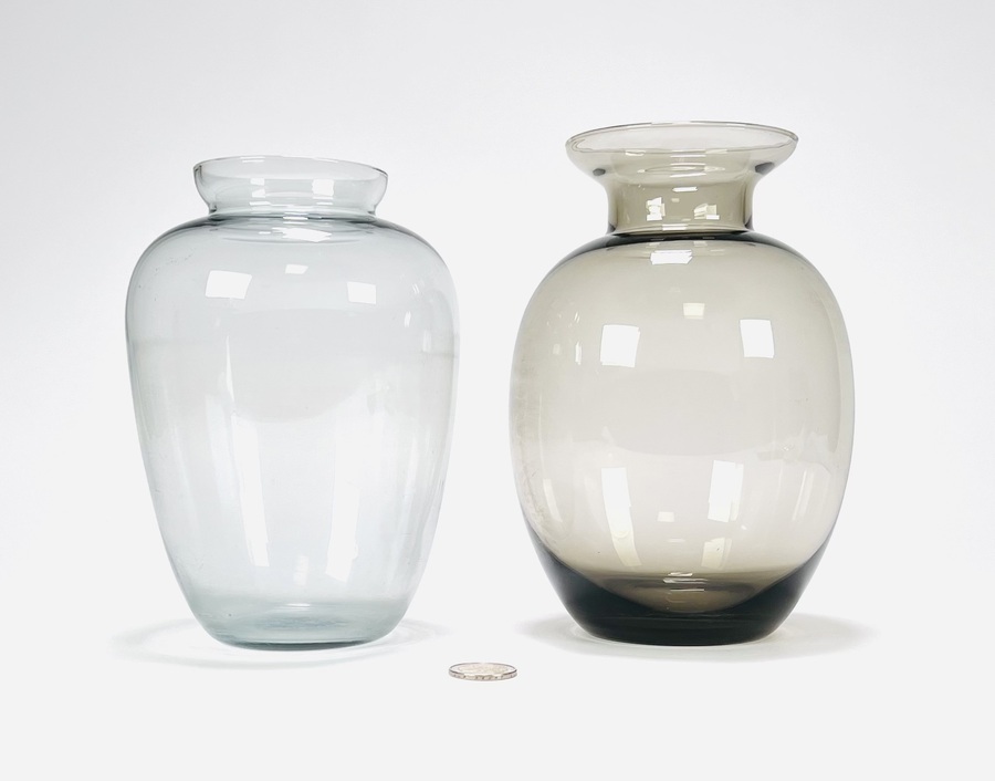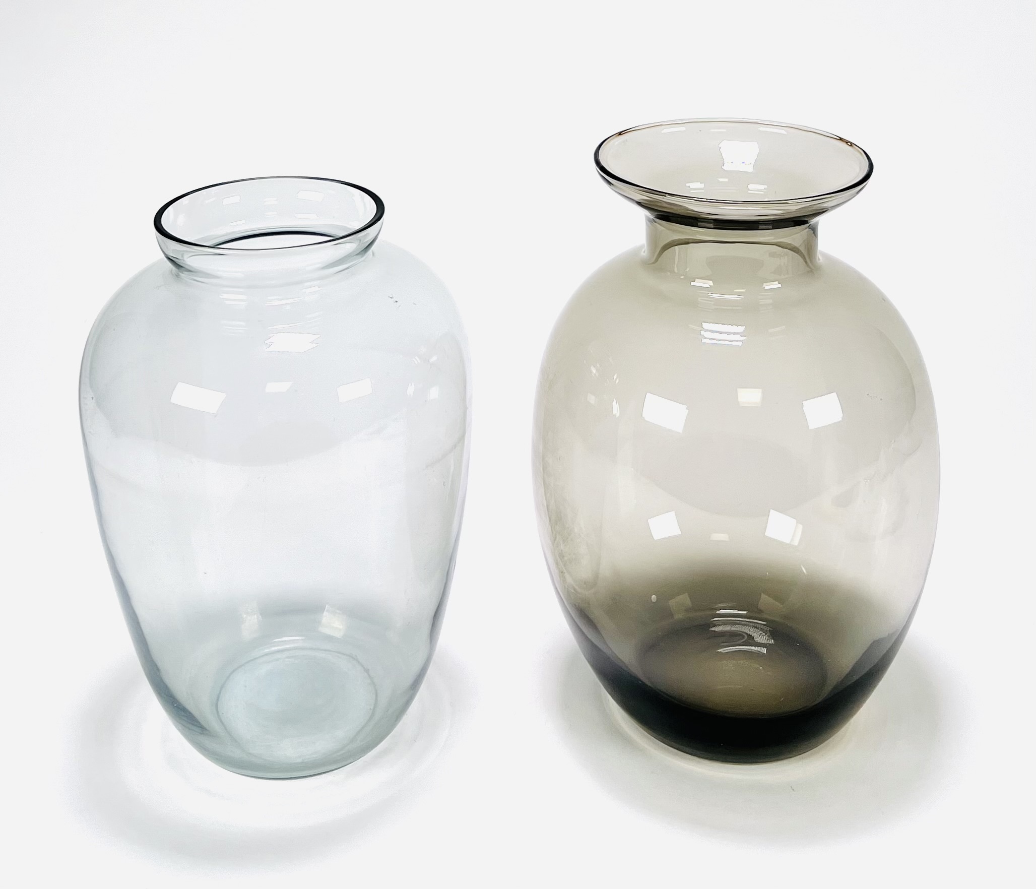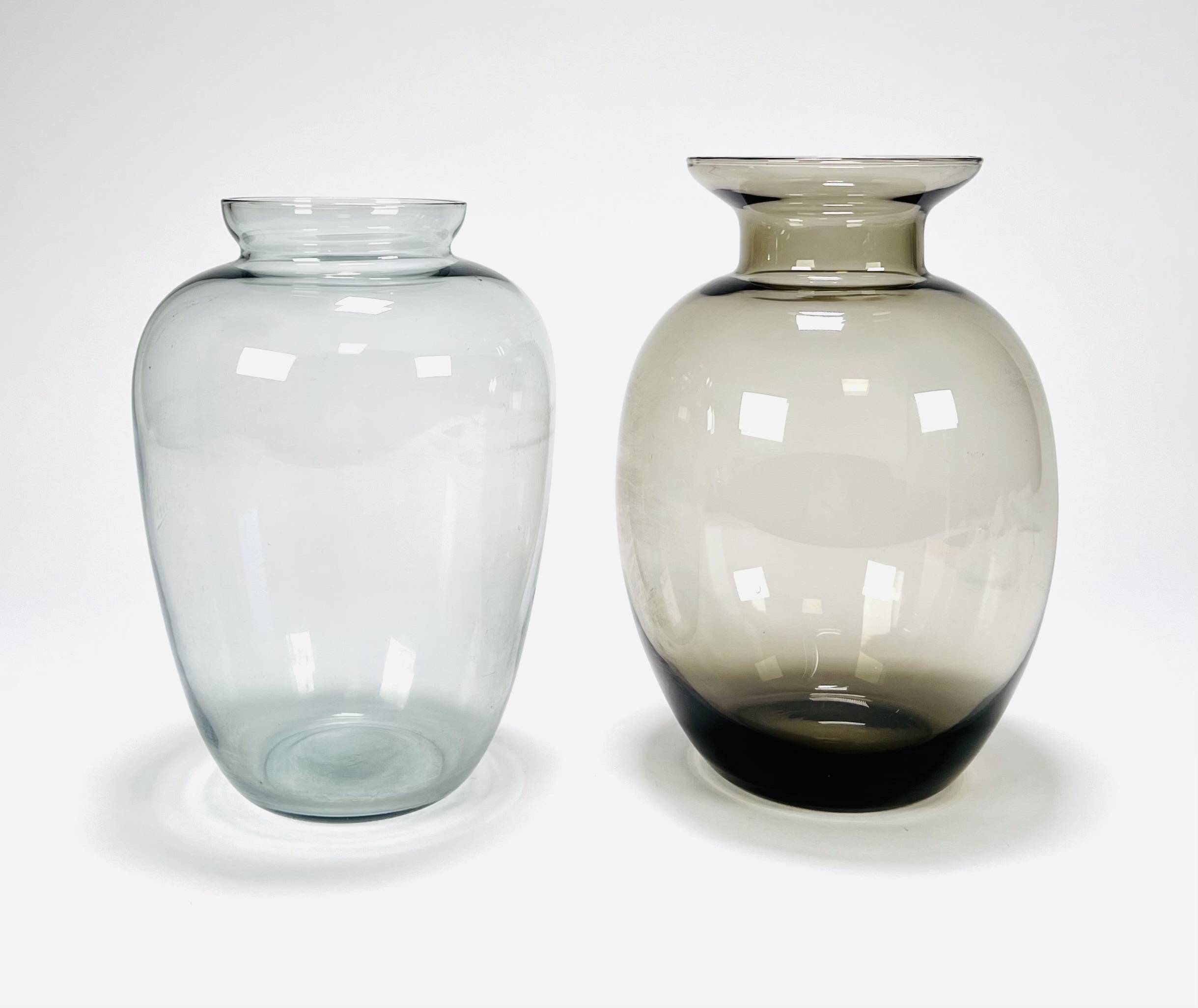 Twee vazen naar ontwerp van Andries Dirk Copier. Een fumékleurige vaas in gladde optiek met modelnummer GL1750 en een blauwgrijze vaas met modelnummer KN2099. Gefabriceerd doornGlasfabriek Leerdam, midden 20e eeuw. |