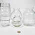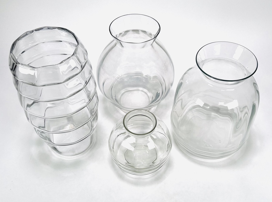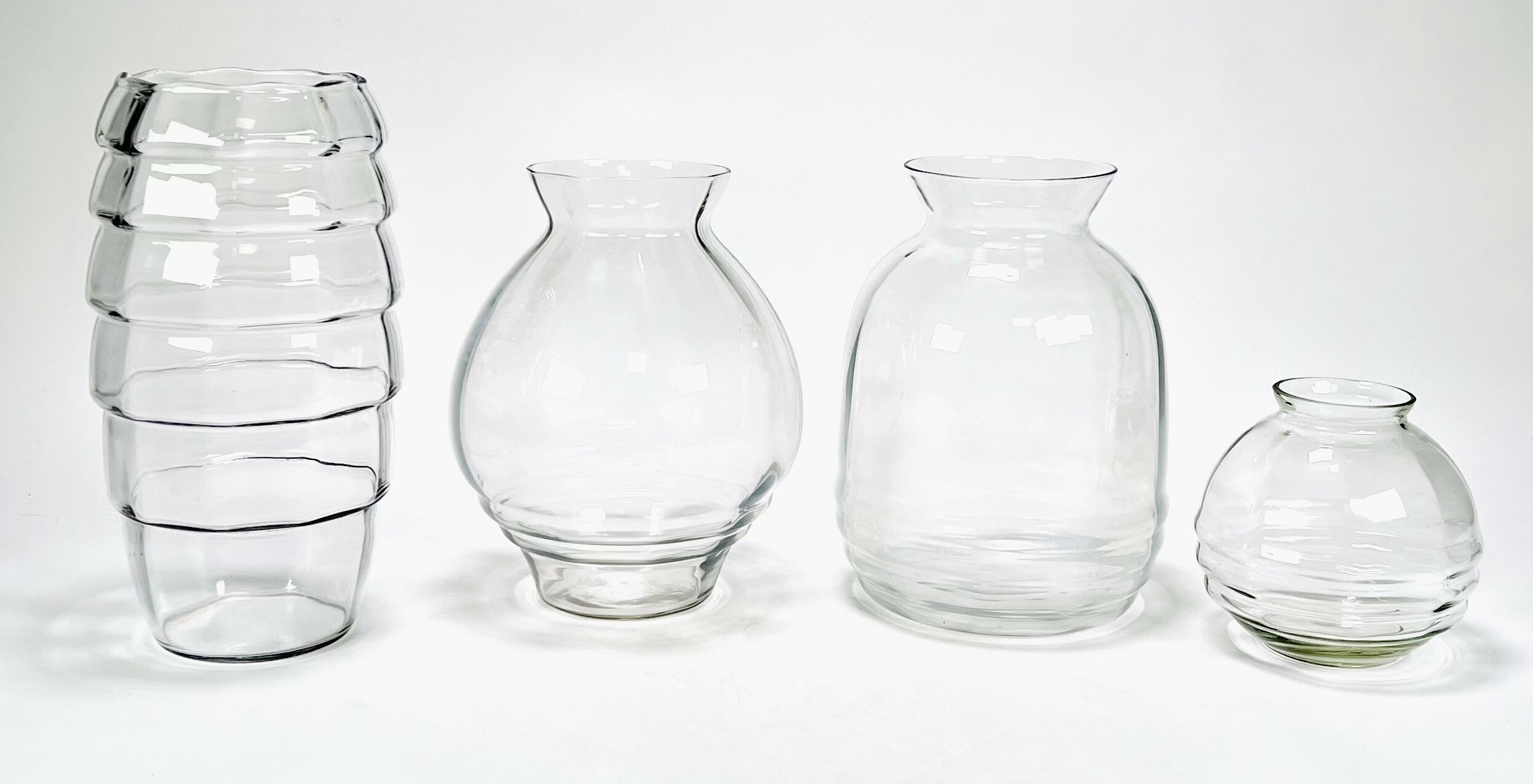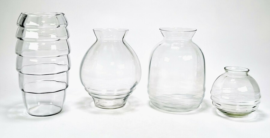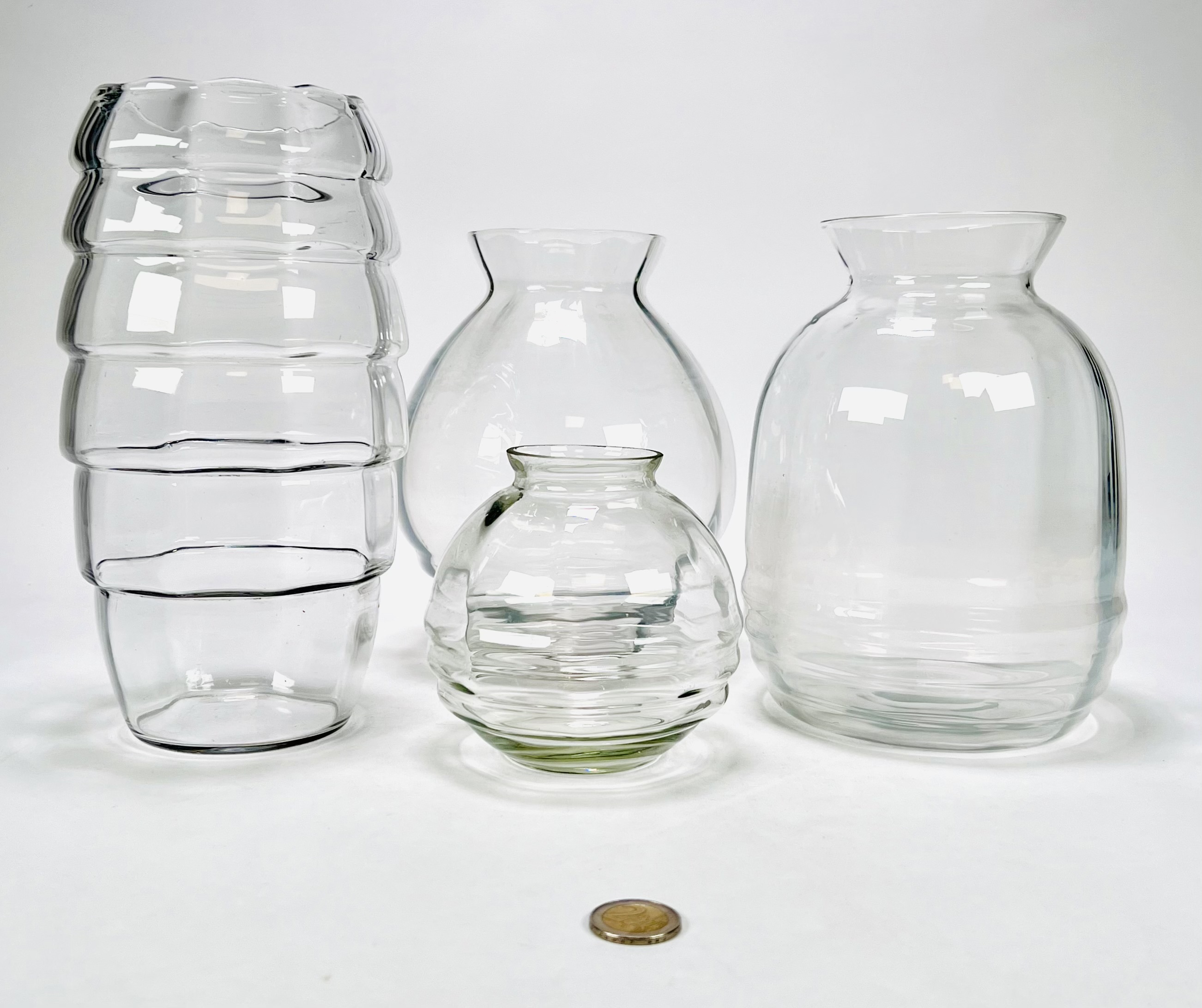 Vier helderglazen Art Deco vazen. Grotere met horizontale ribbel vaas betreft Doyen België, overige vazen glasfabriek Leerdam. Jaren 30. |