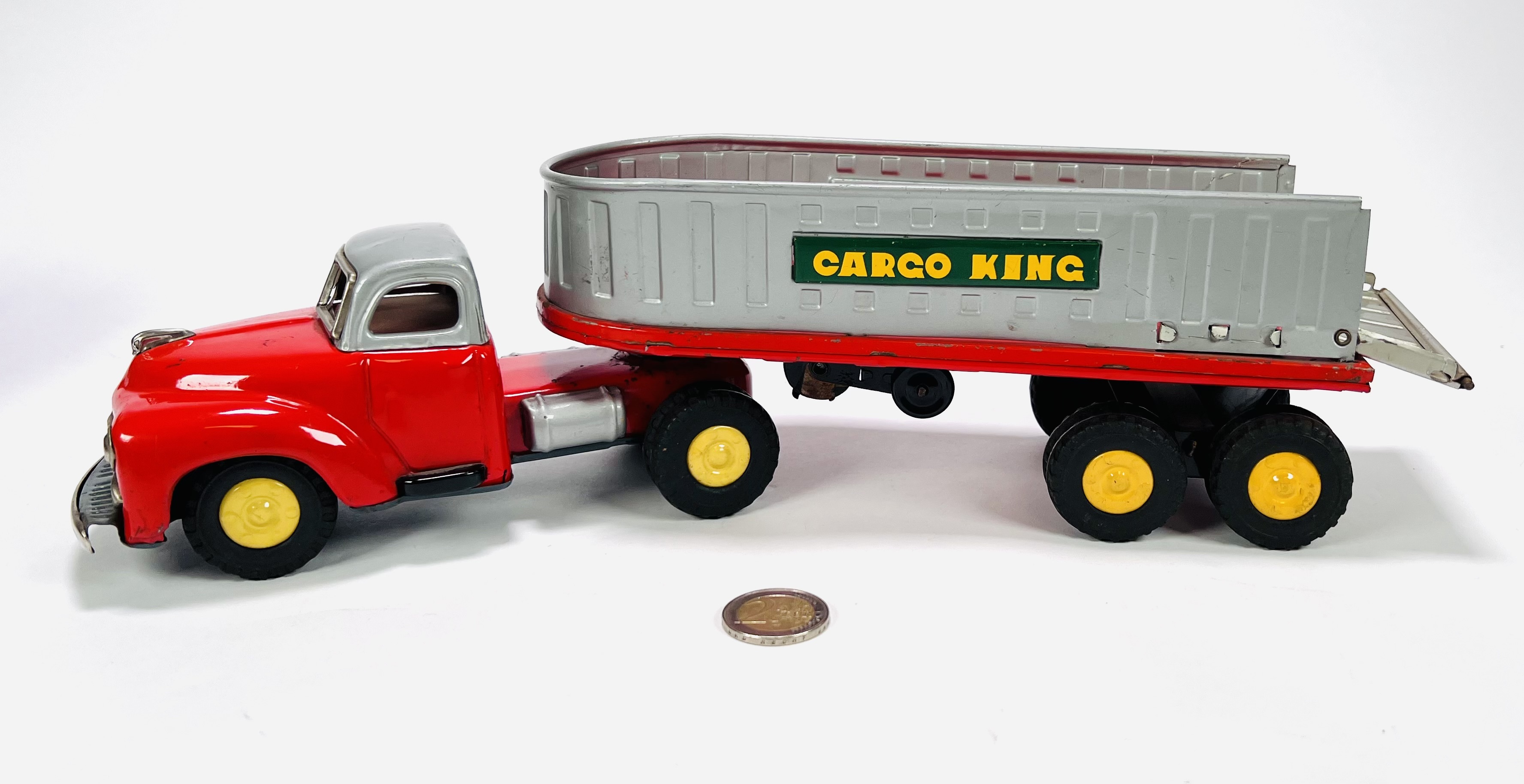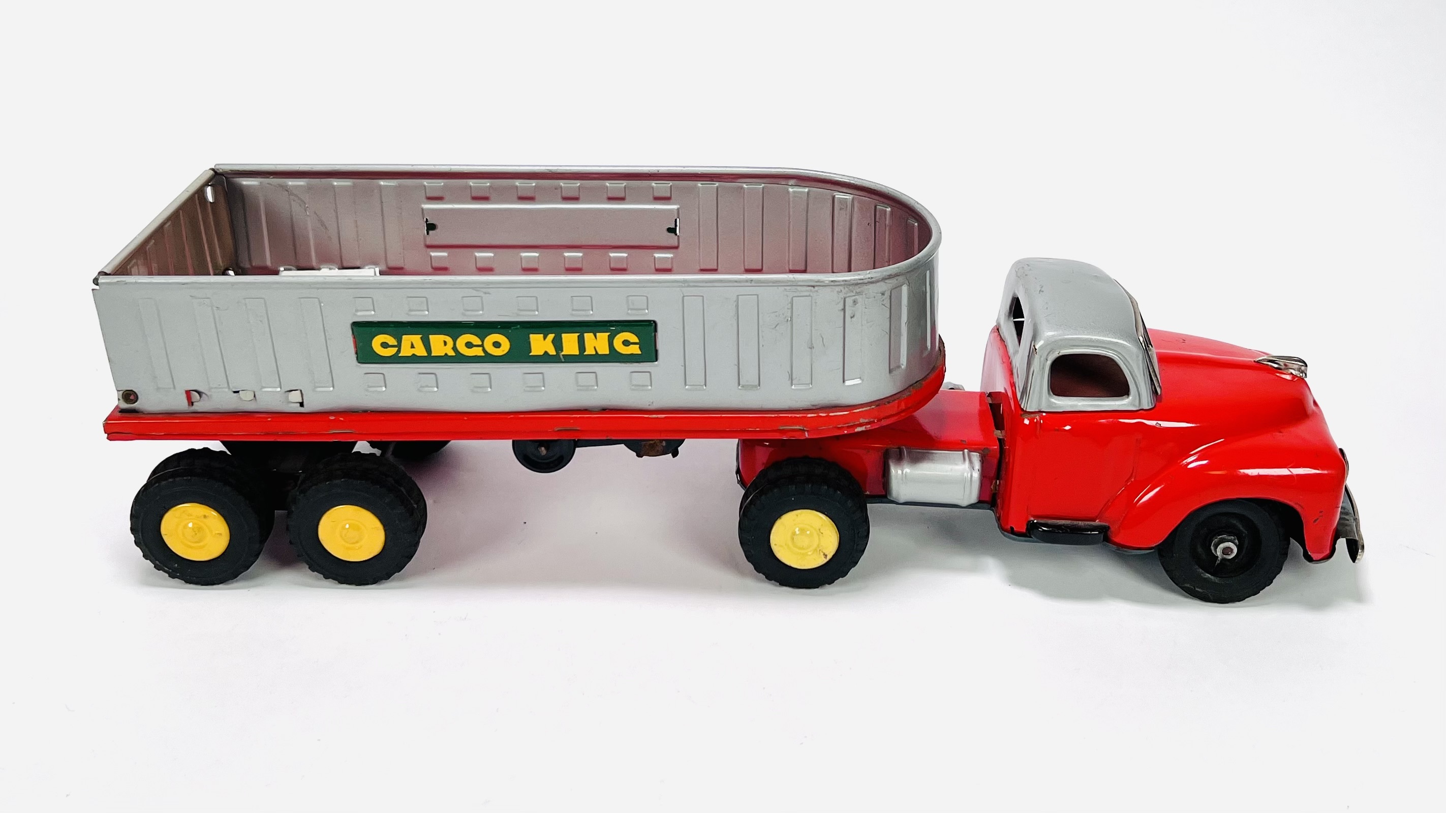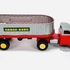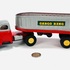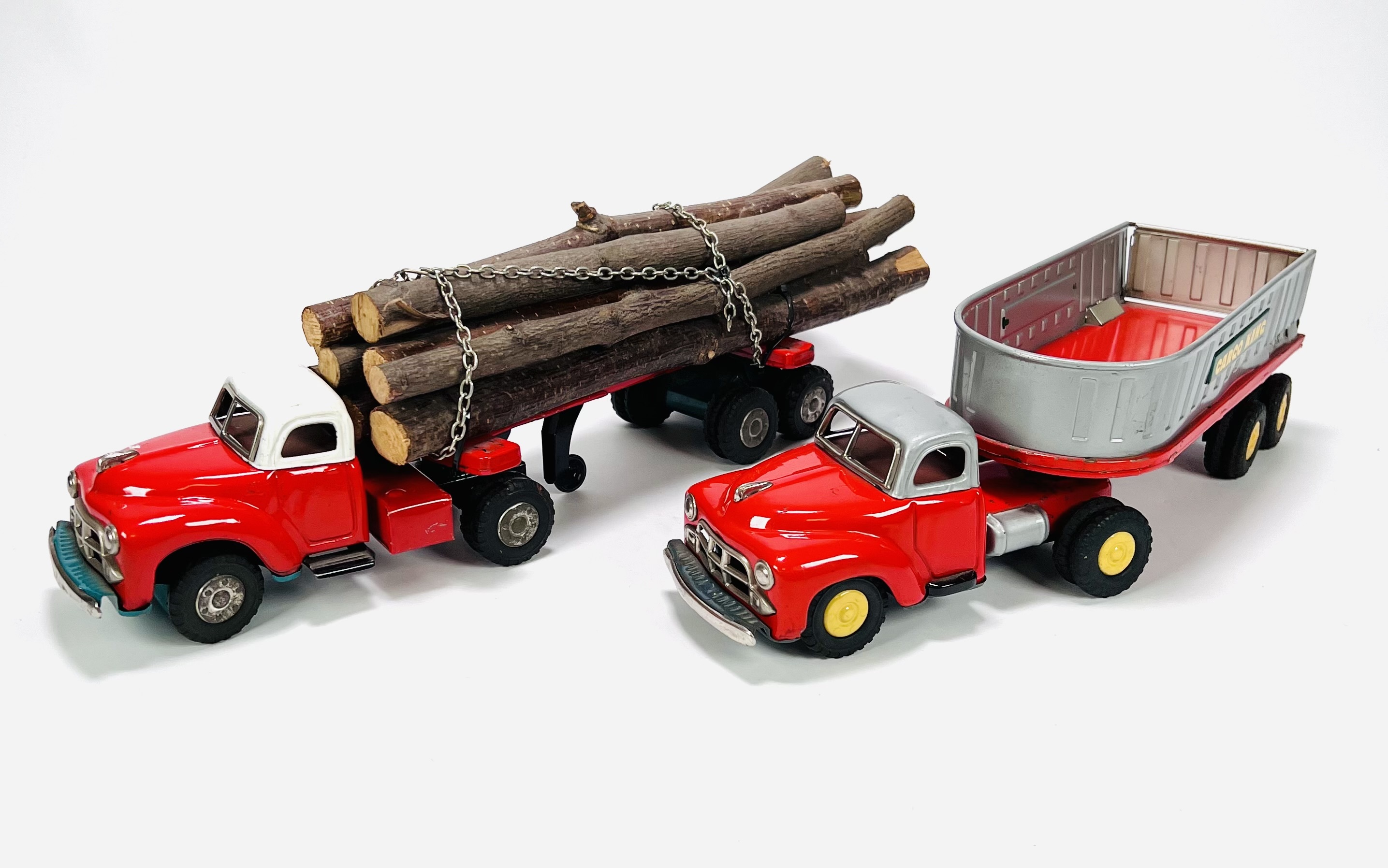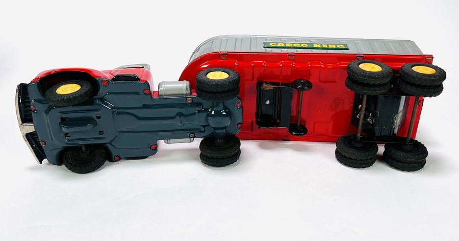 Twee blikken vrachtauto's met oplegger door fabrikant Yamazaki. Aan de onderzijde gemerkt Made in Japan, jaren 60. |