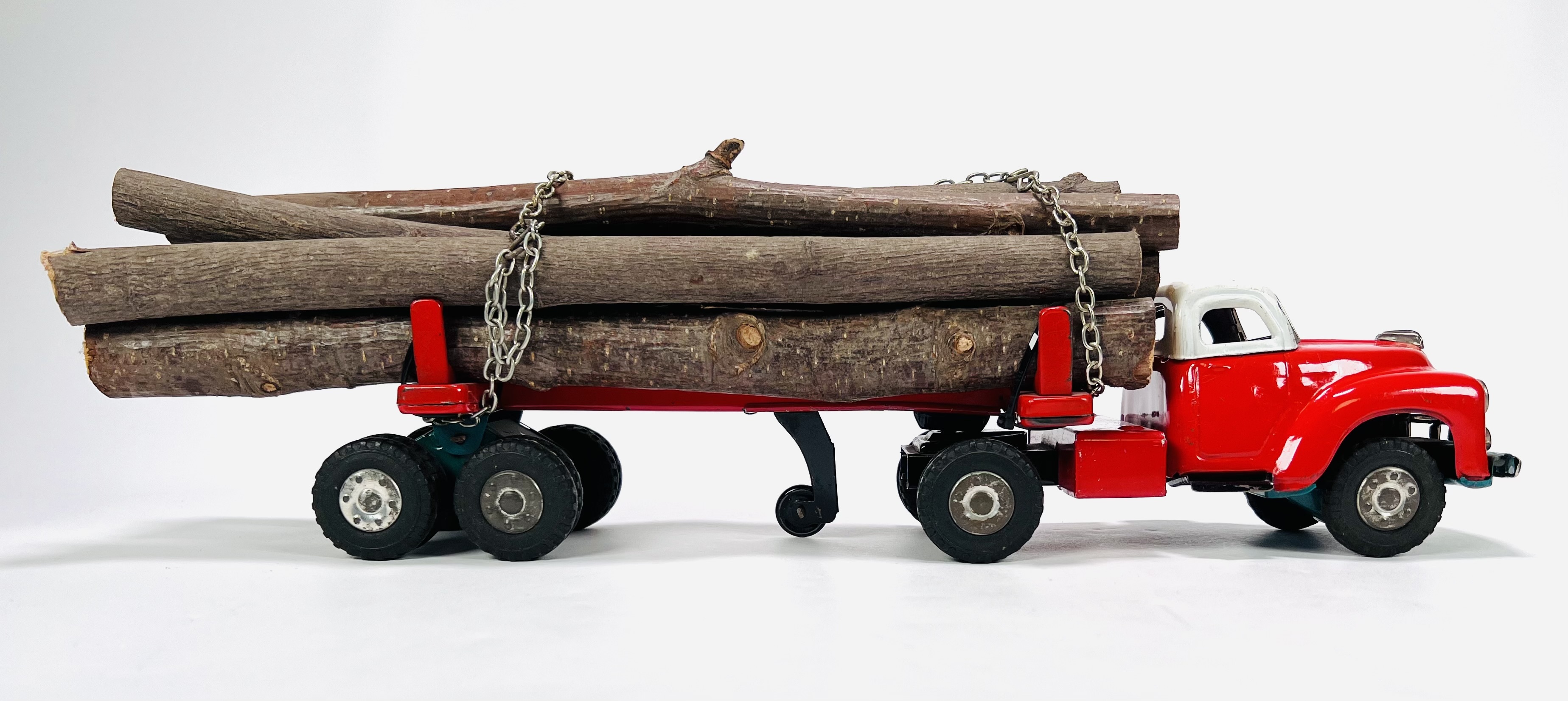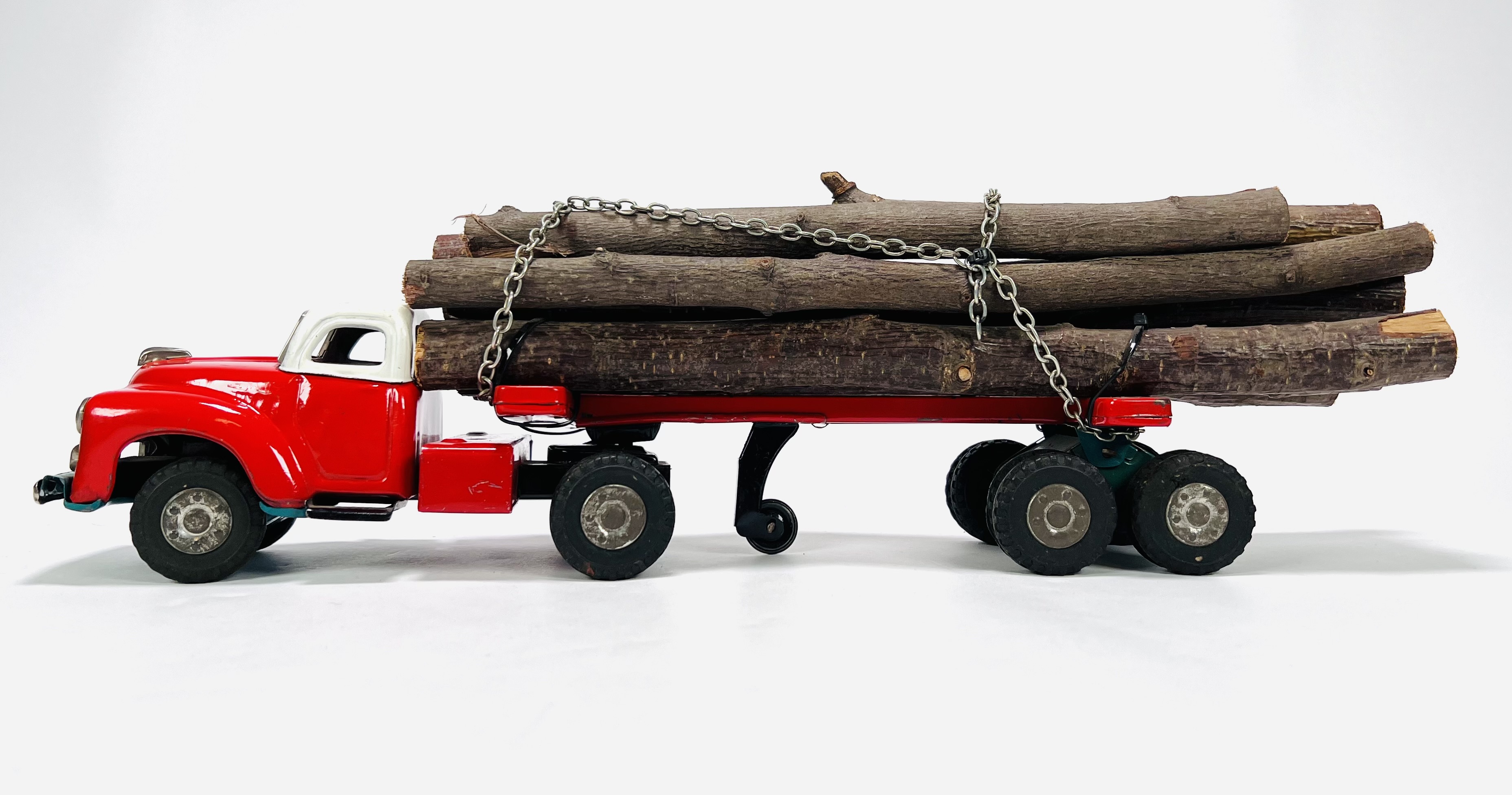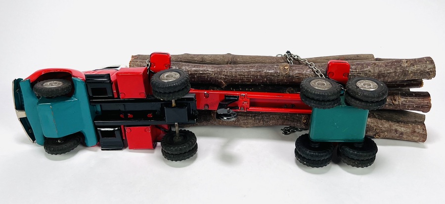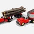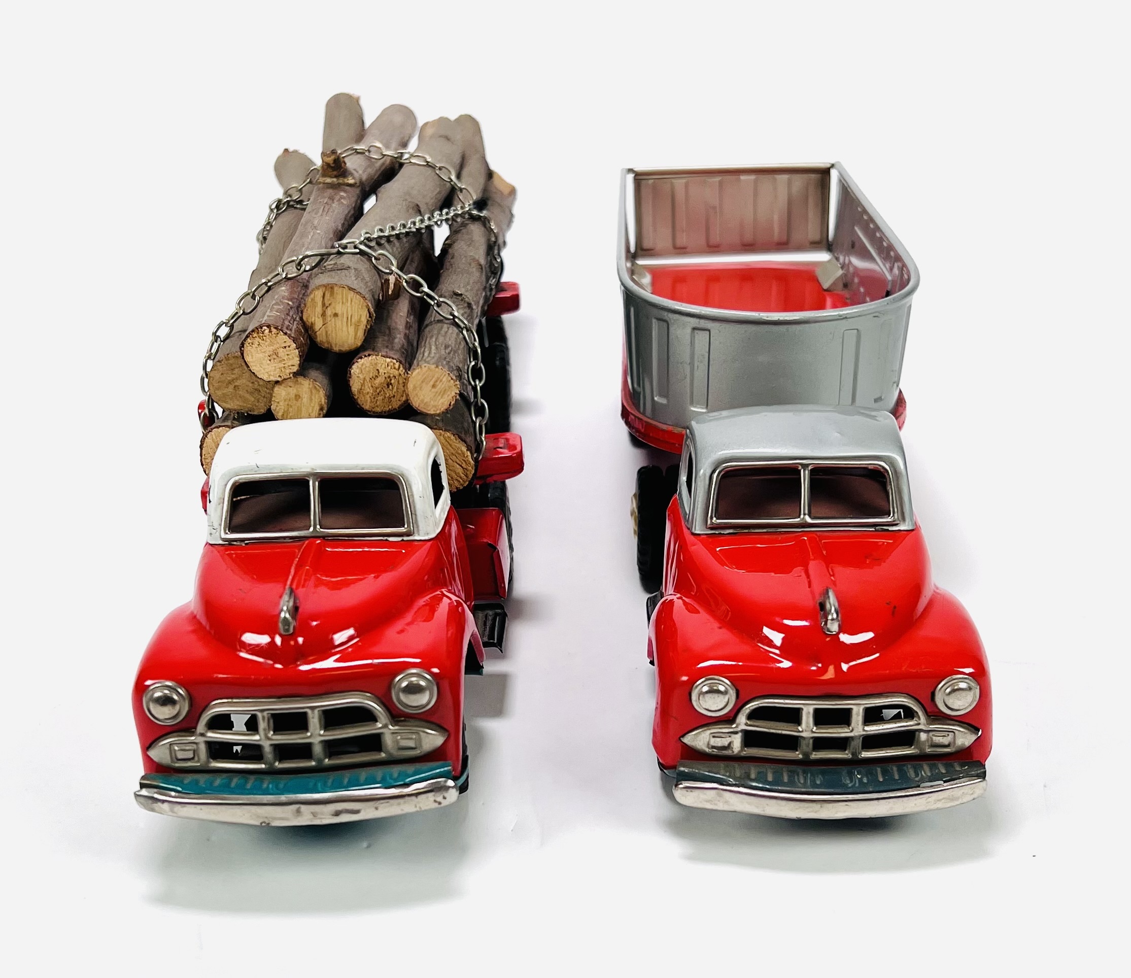 Twee blikken vrachtauto's met oplegger door fabrikant Yamazaki. Aan de onderzijde gemerkt Made in Japan, jaren 60. |