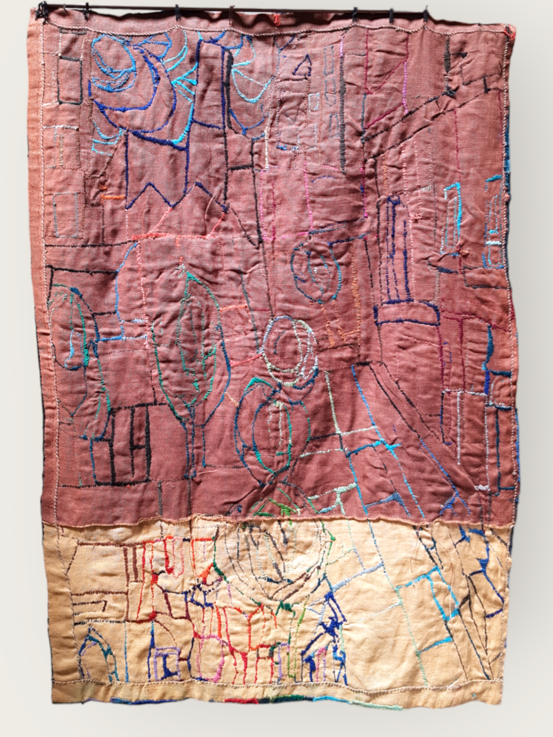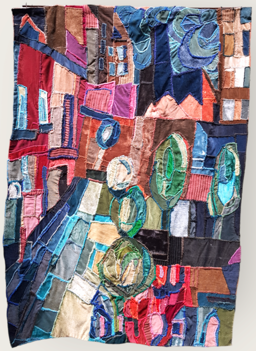Textielen wandkleed met decor van huizen door Maya Wildevuur (1944-2023). Vierde kwart 20e eeuw. |