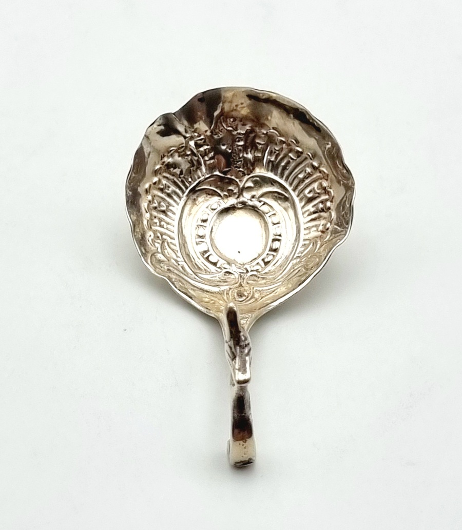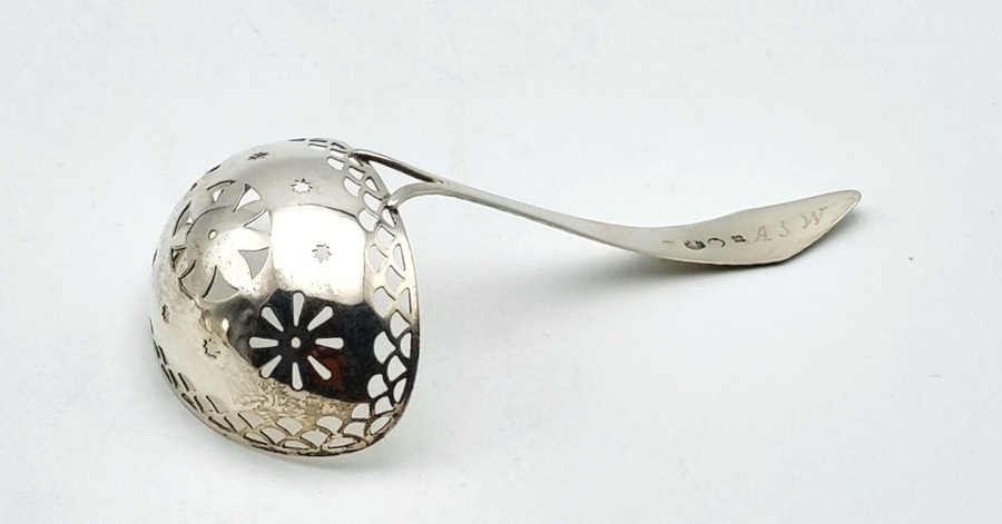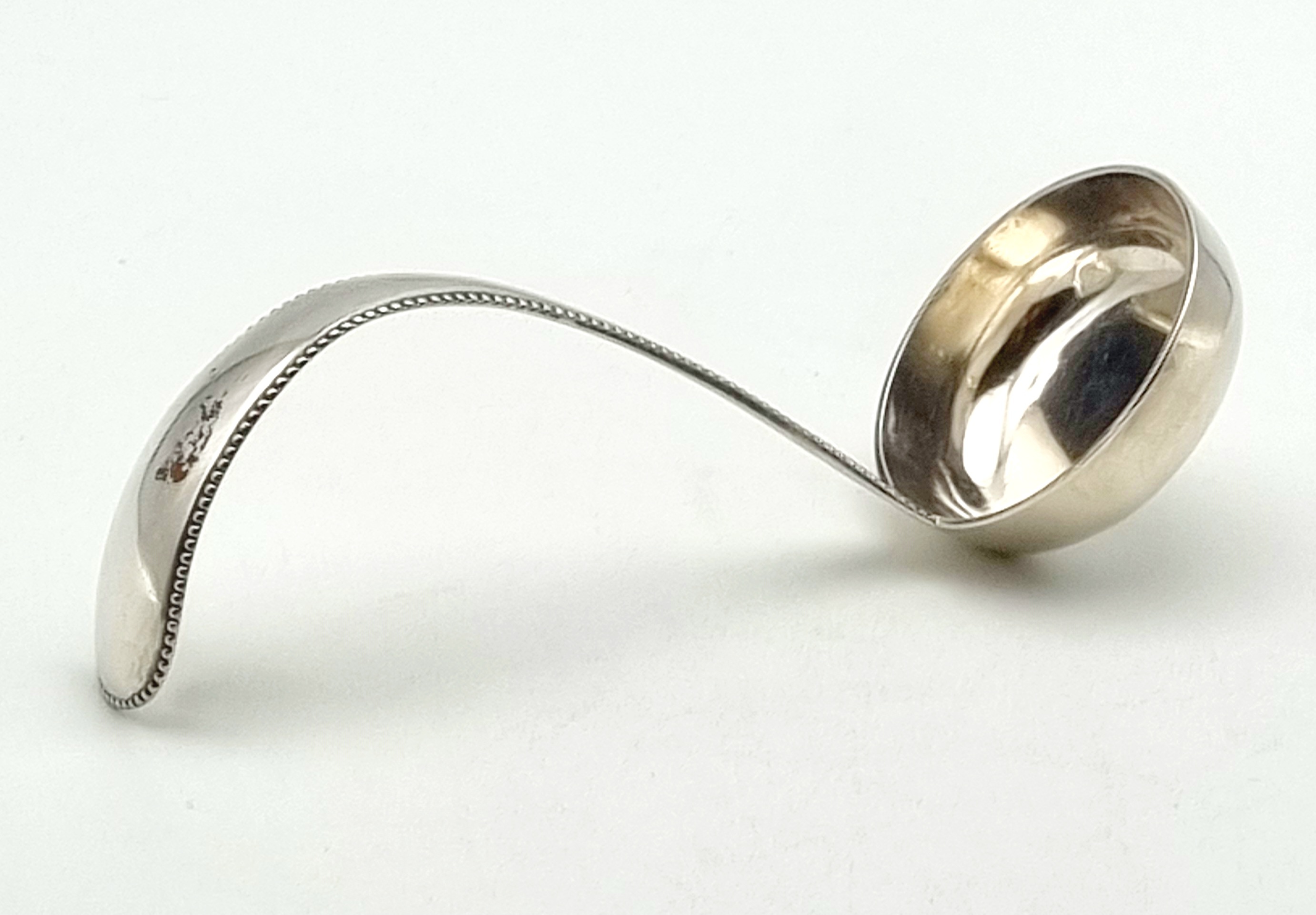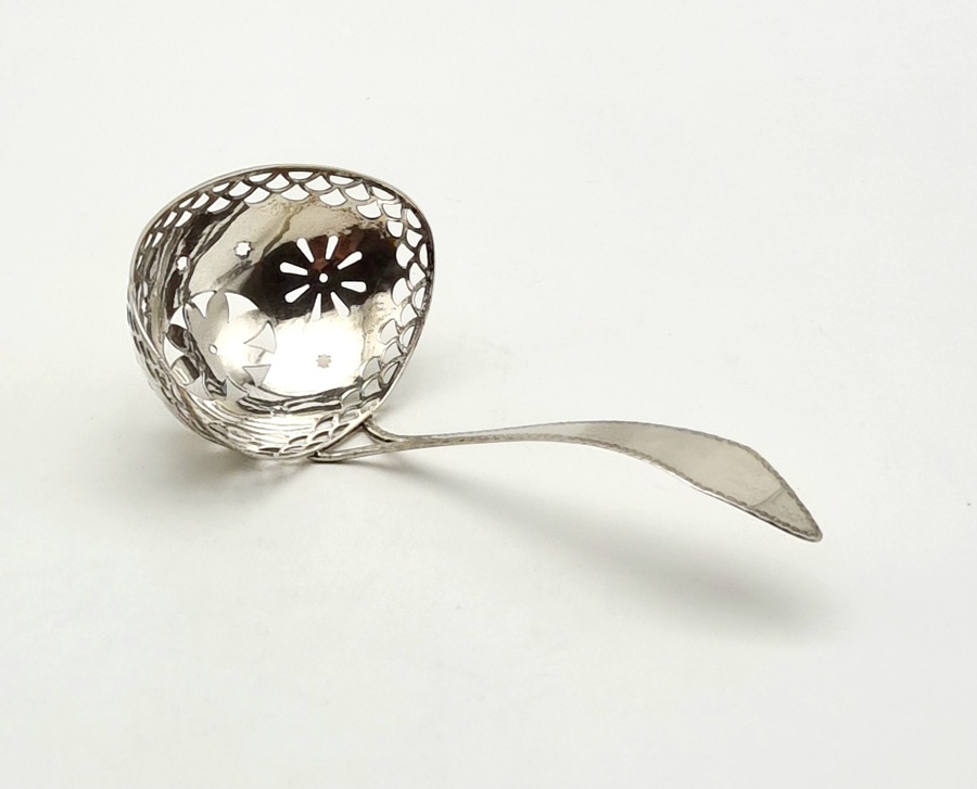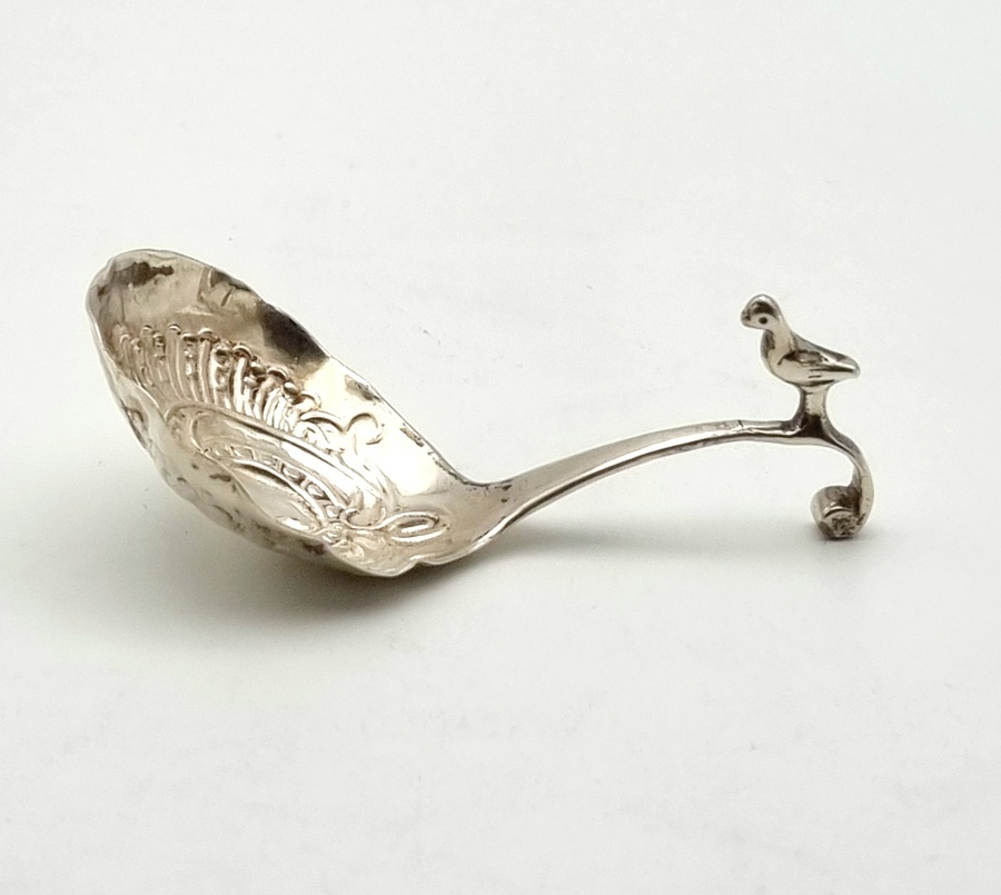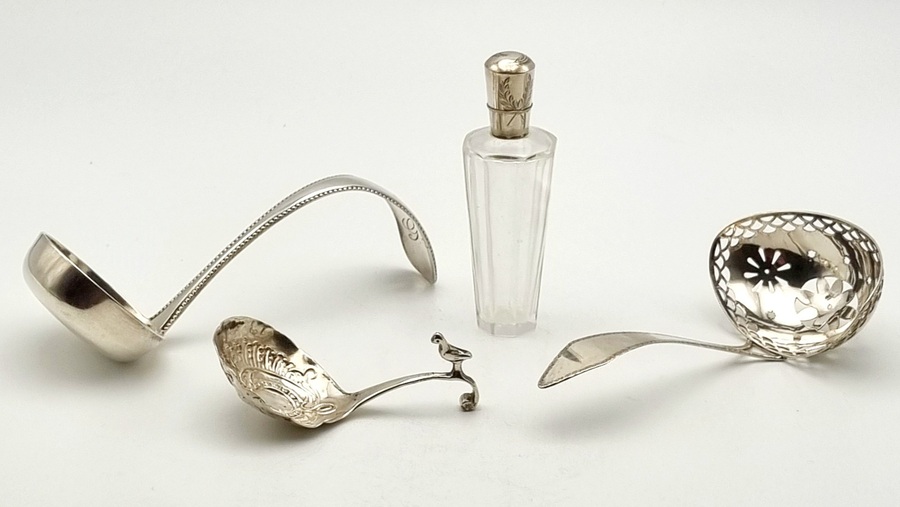 Convoluut zilver met een parfumflesje gemerkt met zwaardje, roomlepel met vogel getoetst op zilver, poederstrooier gemerkt onduidelijk meesterteken, lopende leeuw 2, minervakop en jaarletter H (1817), roomlepel gemerkt meesterkeur AK*47, lopende leeuw 2, minervakop en jaarletter H (1892). |