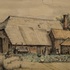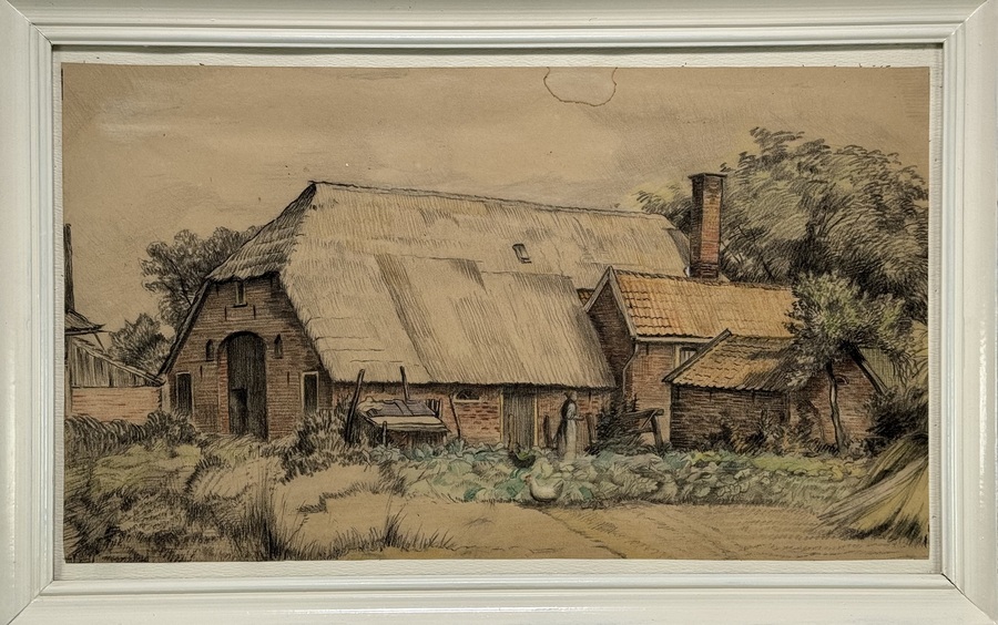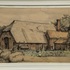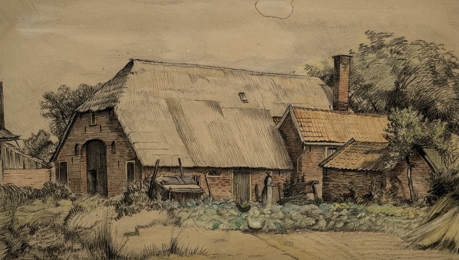 Tekening van boerderij met erf en boerin. Anoniem, midden 20e eeuw. |