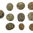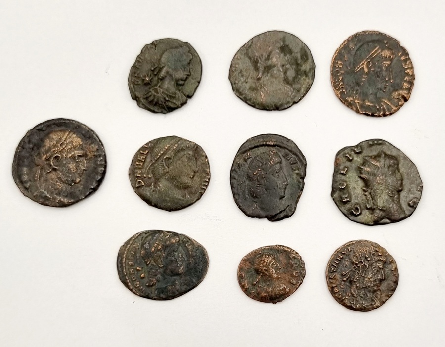 Tien Romeinse bronzen munten, 2e-4e eeuw na Christus. |