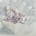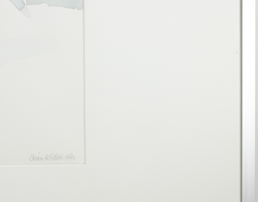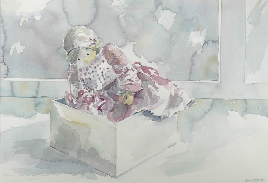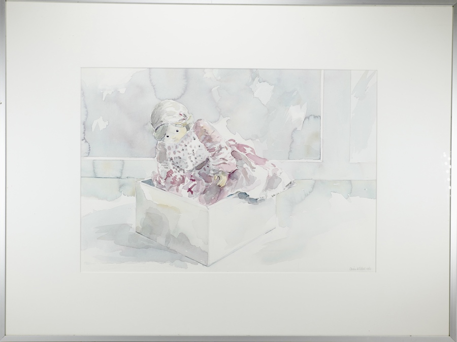 Aquarel van een pop in doos door Arien de Groot. Rechtsonder met potlood gesigneerd en gedateerd 1987. |