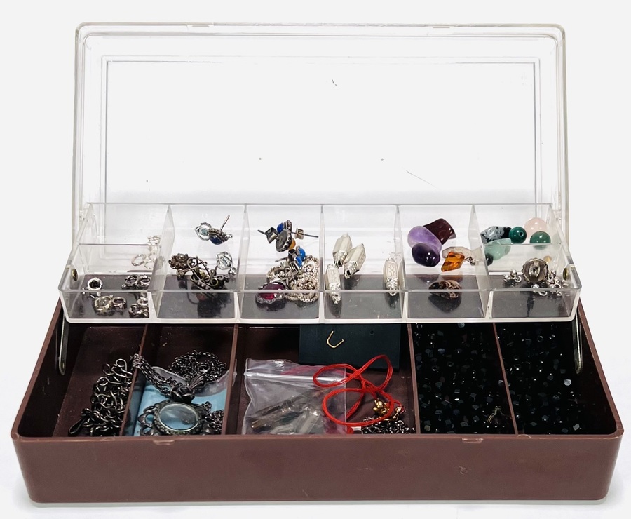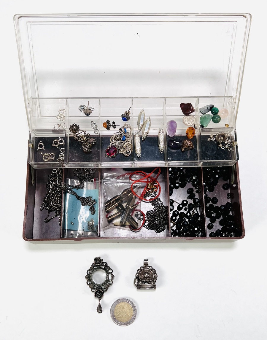 Bijouteriedoos met sluitingen, kralen, ketting, oorbellen en meer. 20e eeuw. |