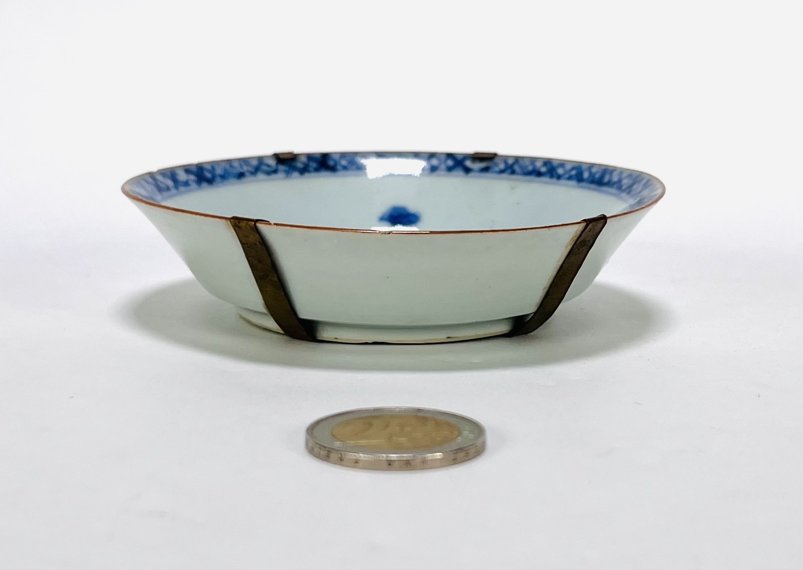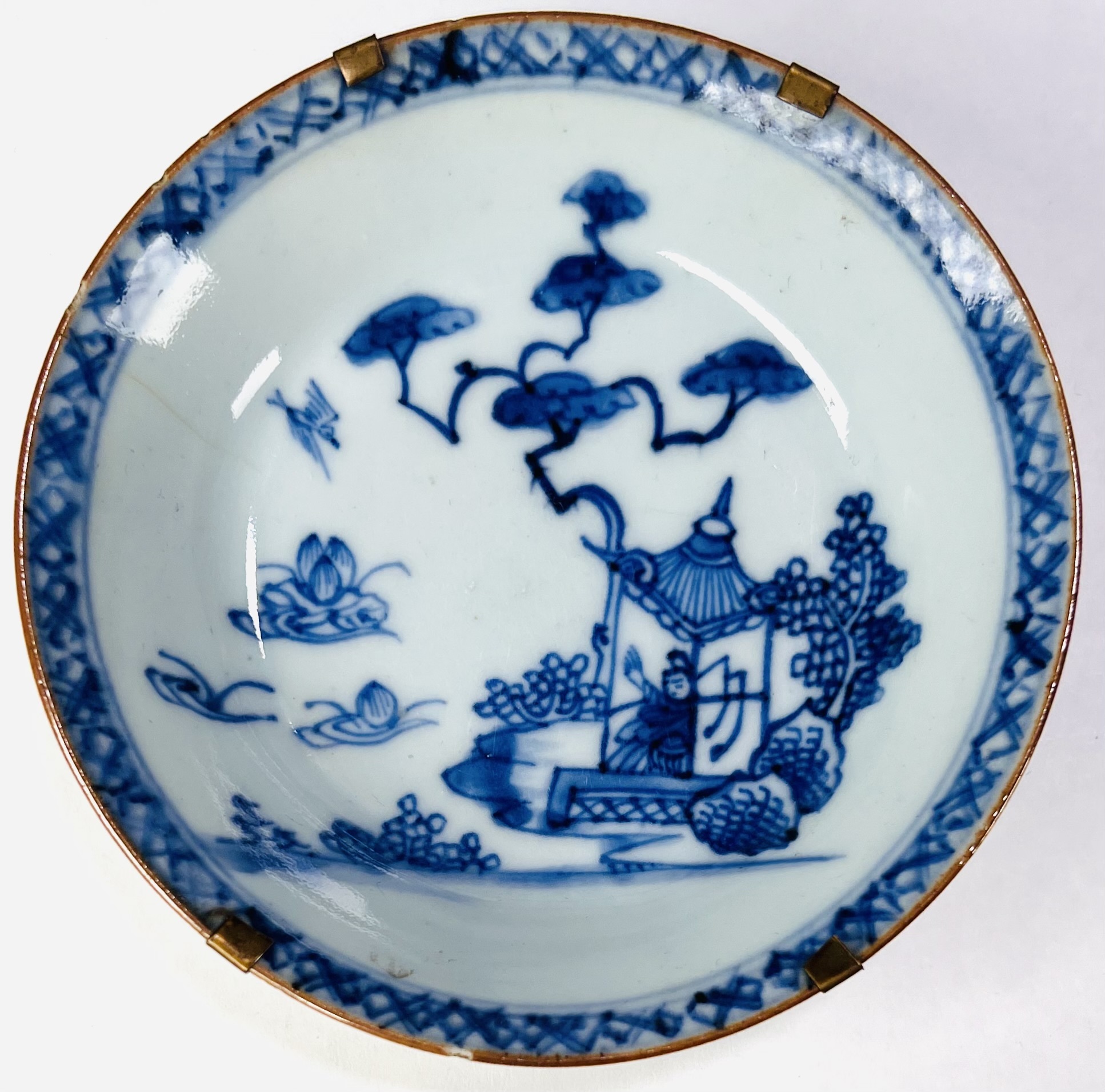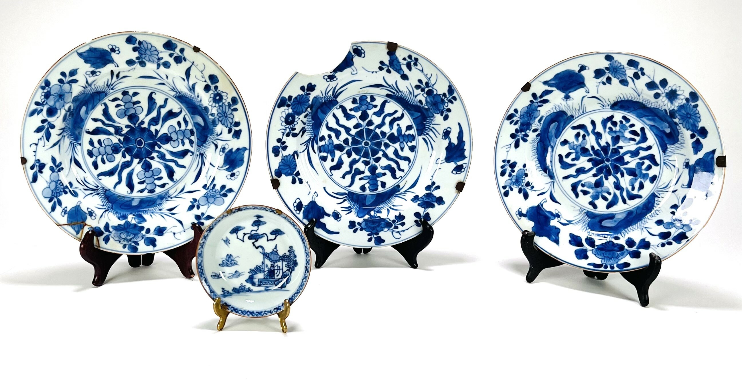 Drie Chinees porseleinen borden met capucijnerrand en floraal geschilderd decor, 18e eeuw. Daarbij een porseleinen schaaltje met tuindecor en pagode met capucijnerrand, 18e eeuw. |