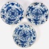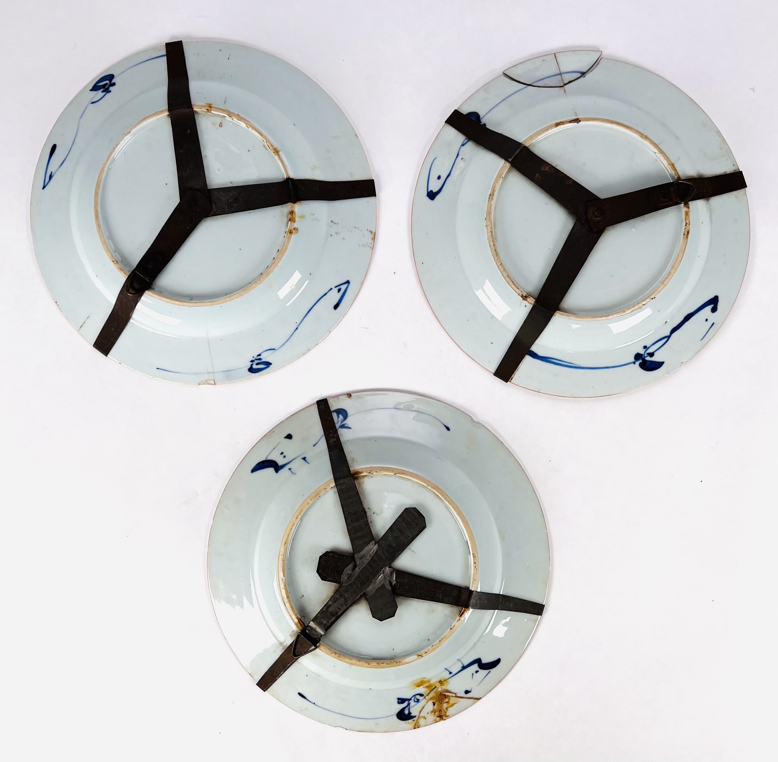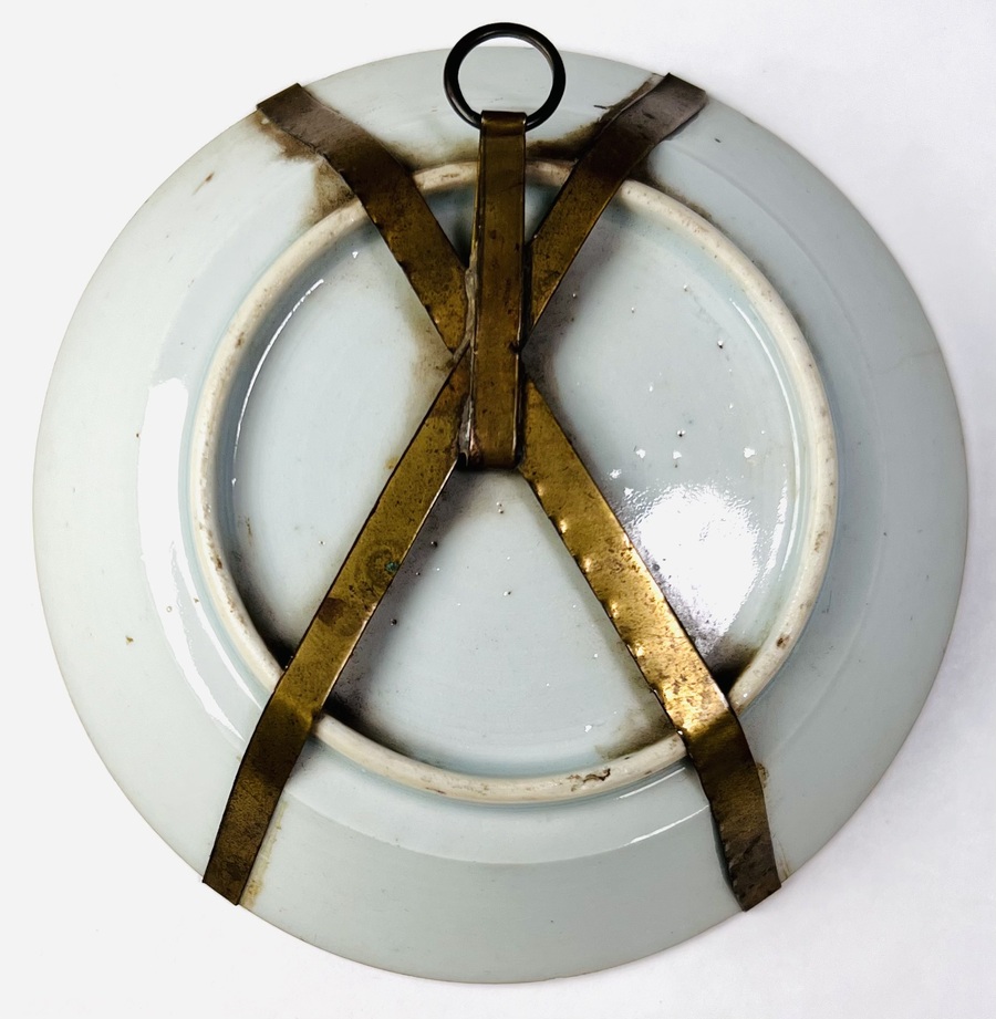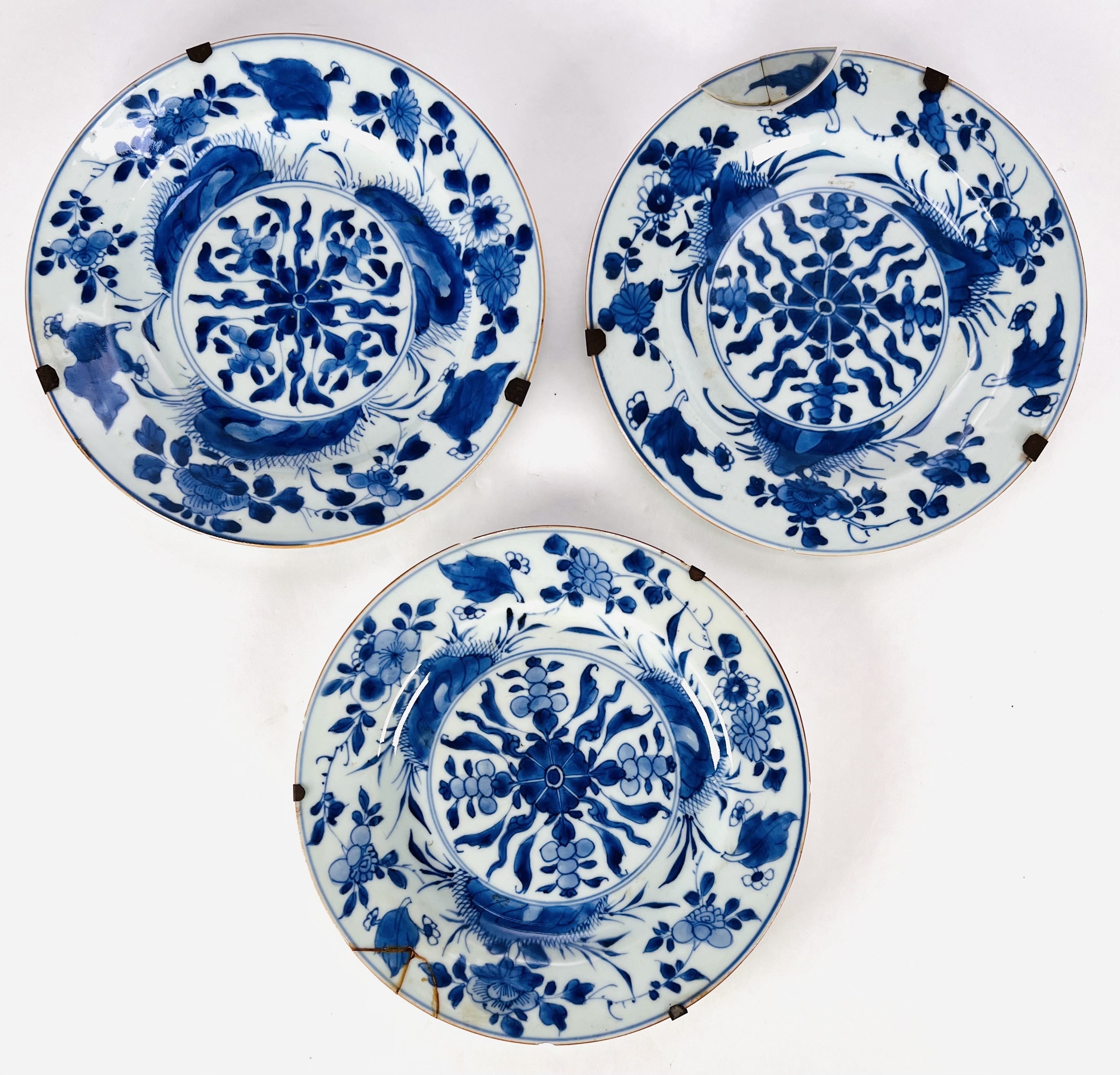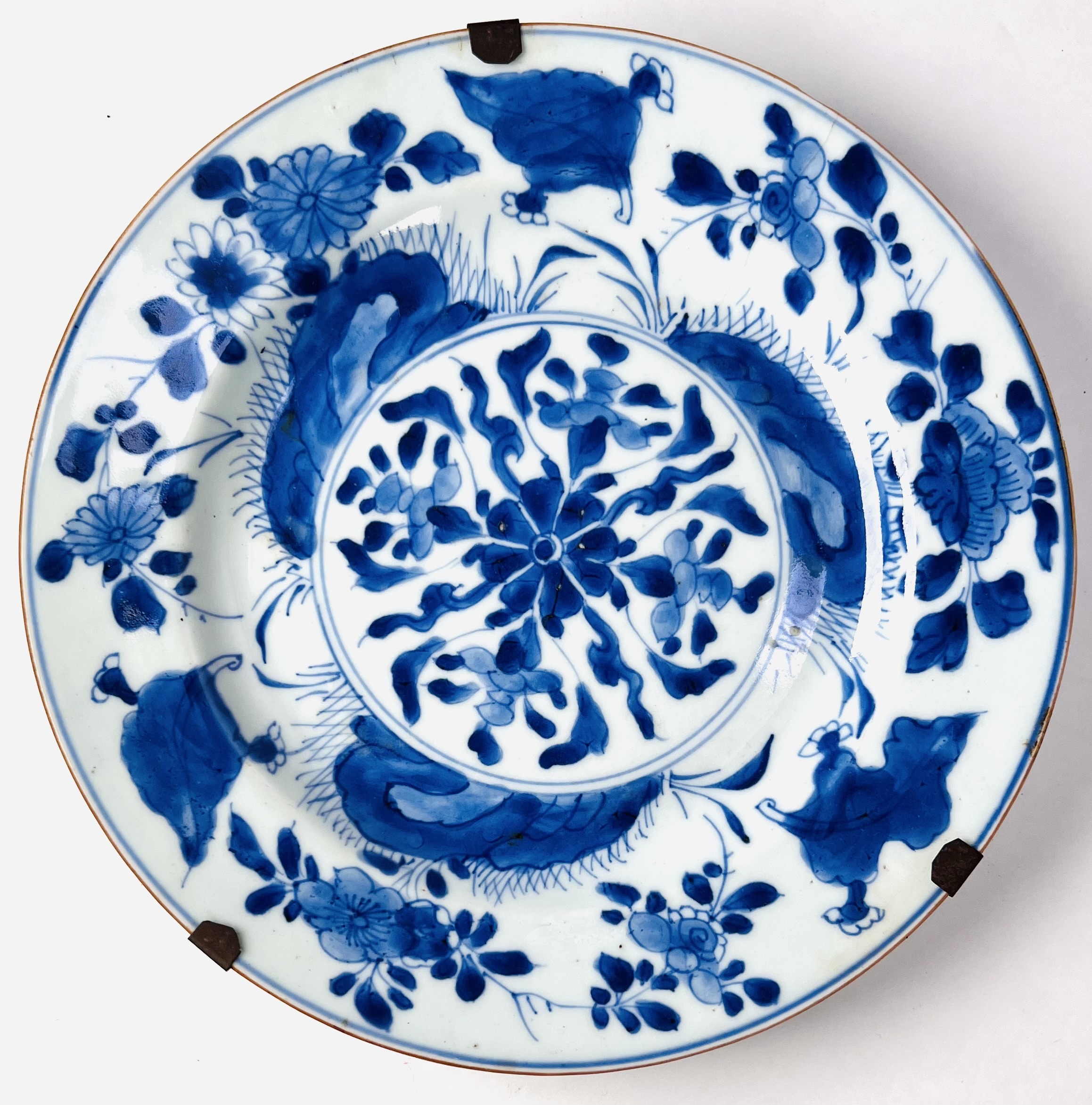 Drie Chinees porseleinen borden met capucijnerrand en floraal geschilderd decor, 18e eeuw. Daarbij een porseleinen schaaltje met tuindecor en pagode met capucijnerrand, 18e eeuw. |