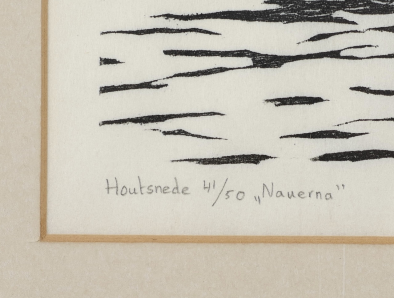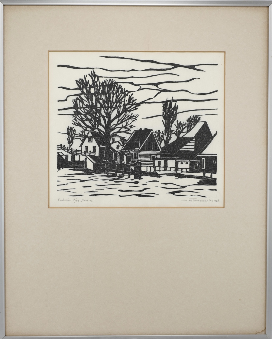 Houtsnede op Japans rijstpapier getiteld “Nauerna” door Selma Timmerman. Rechtsonder gesigneerd met potlood, datering 1978 en oplagenummer 41/50. |