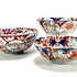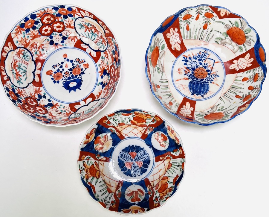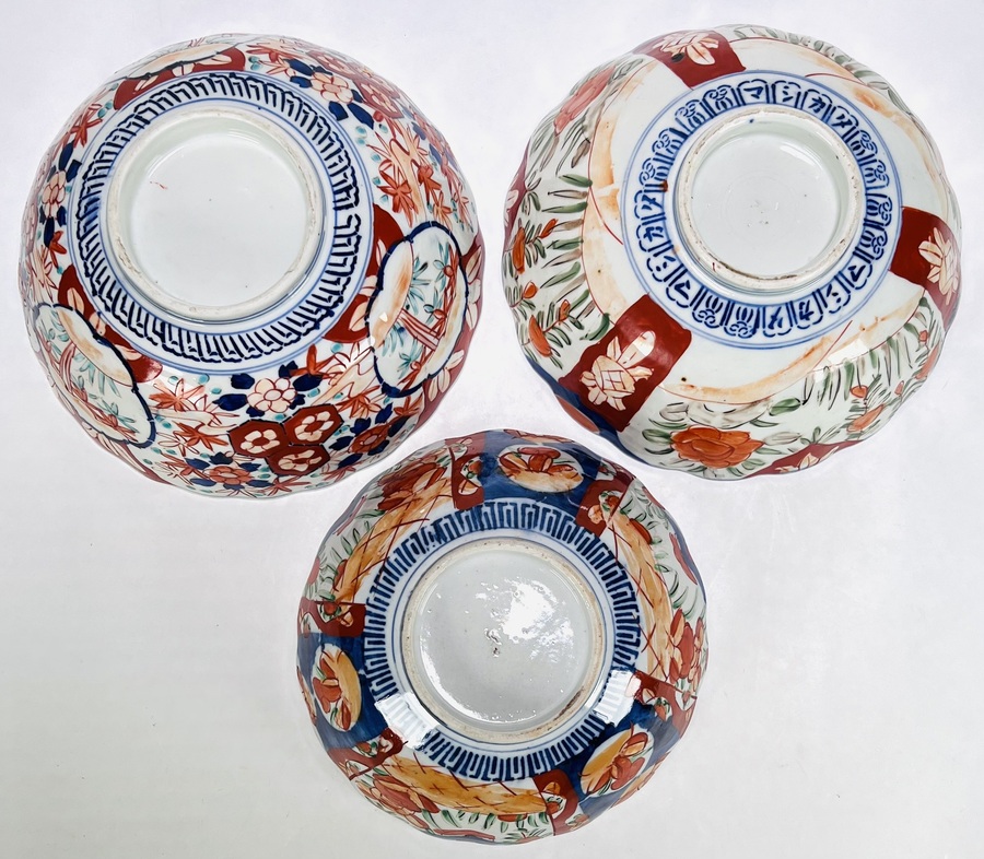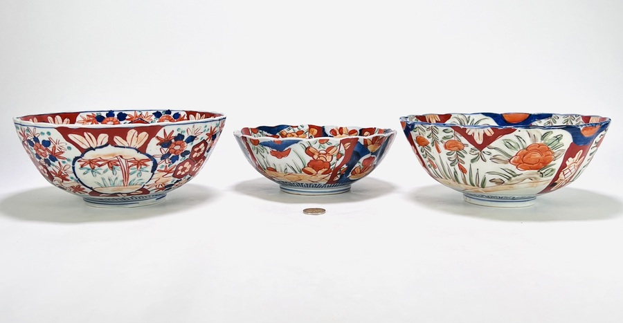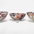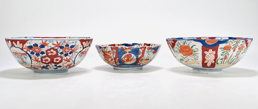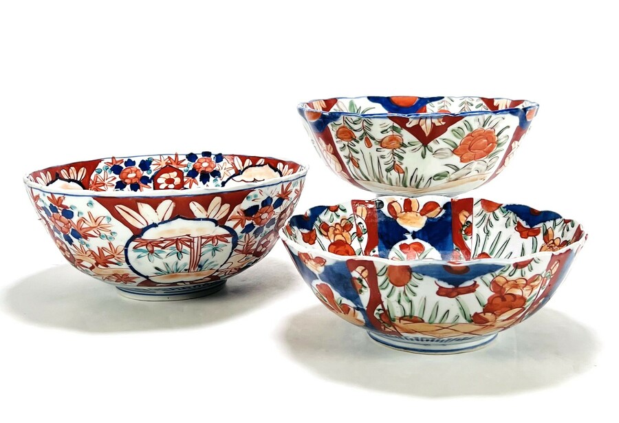 Drie porseleinen Japanse Imari kommen met licht geschulpte rand voorzien van handbeschilderd floraal decor. Begin 20e eeuw. |