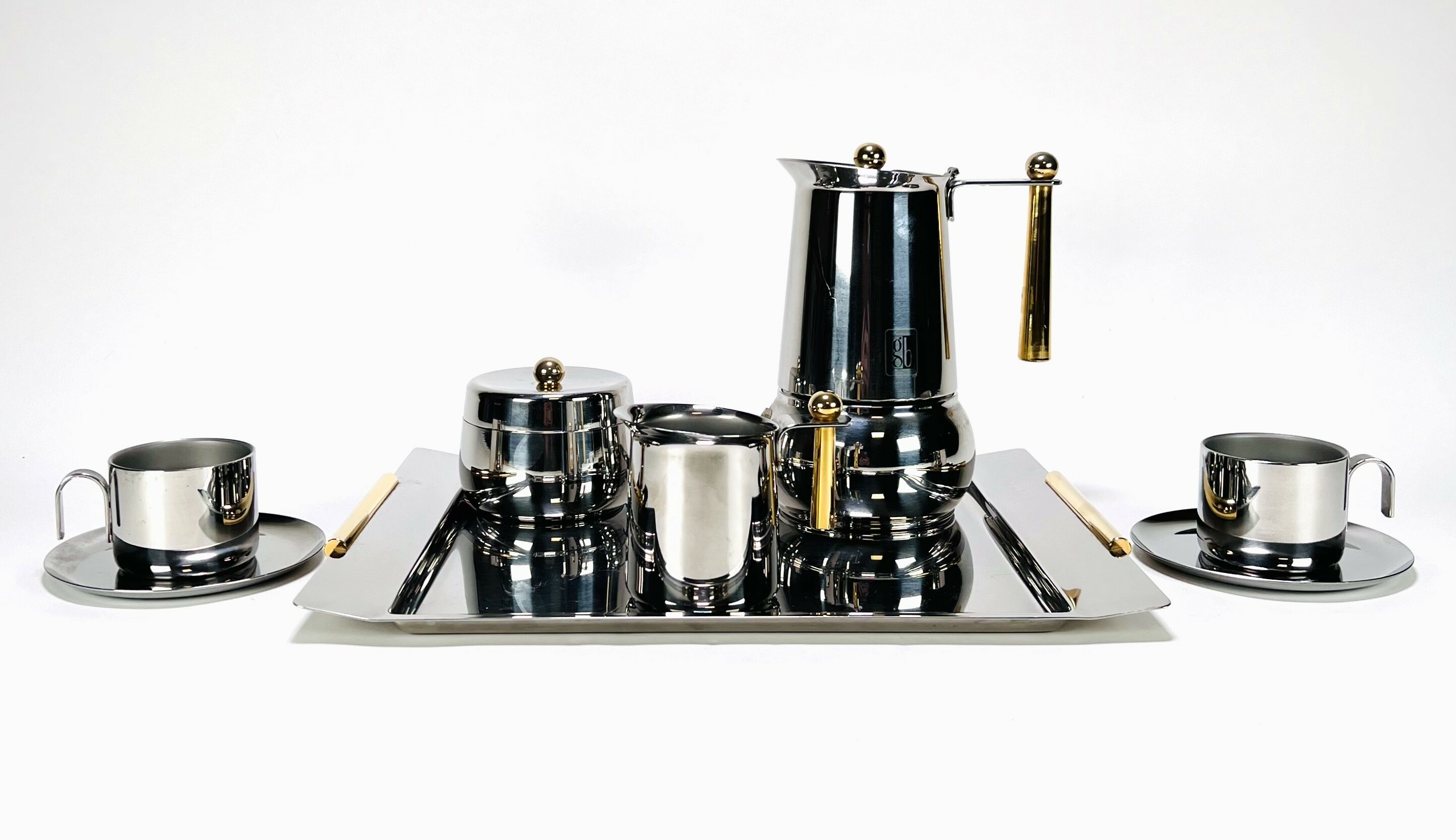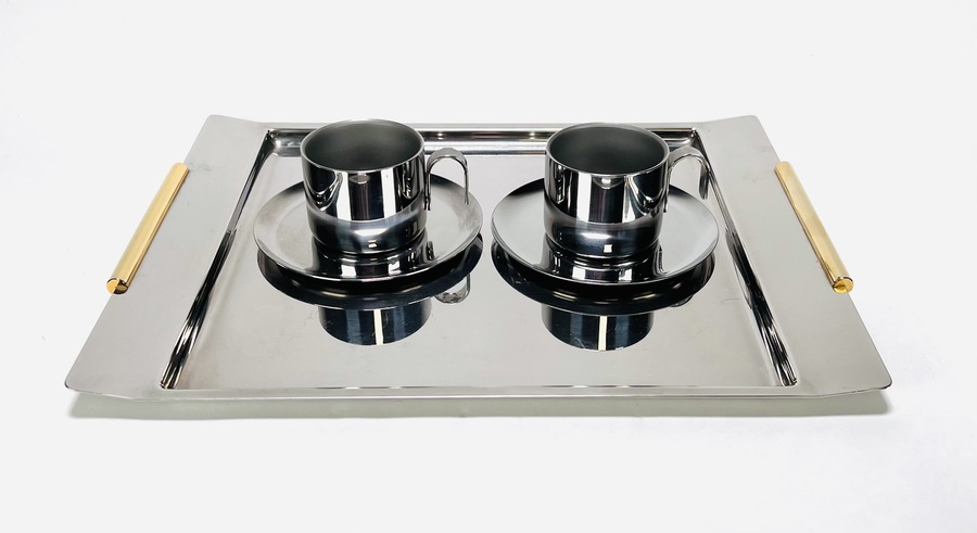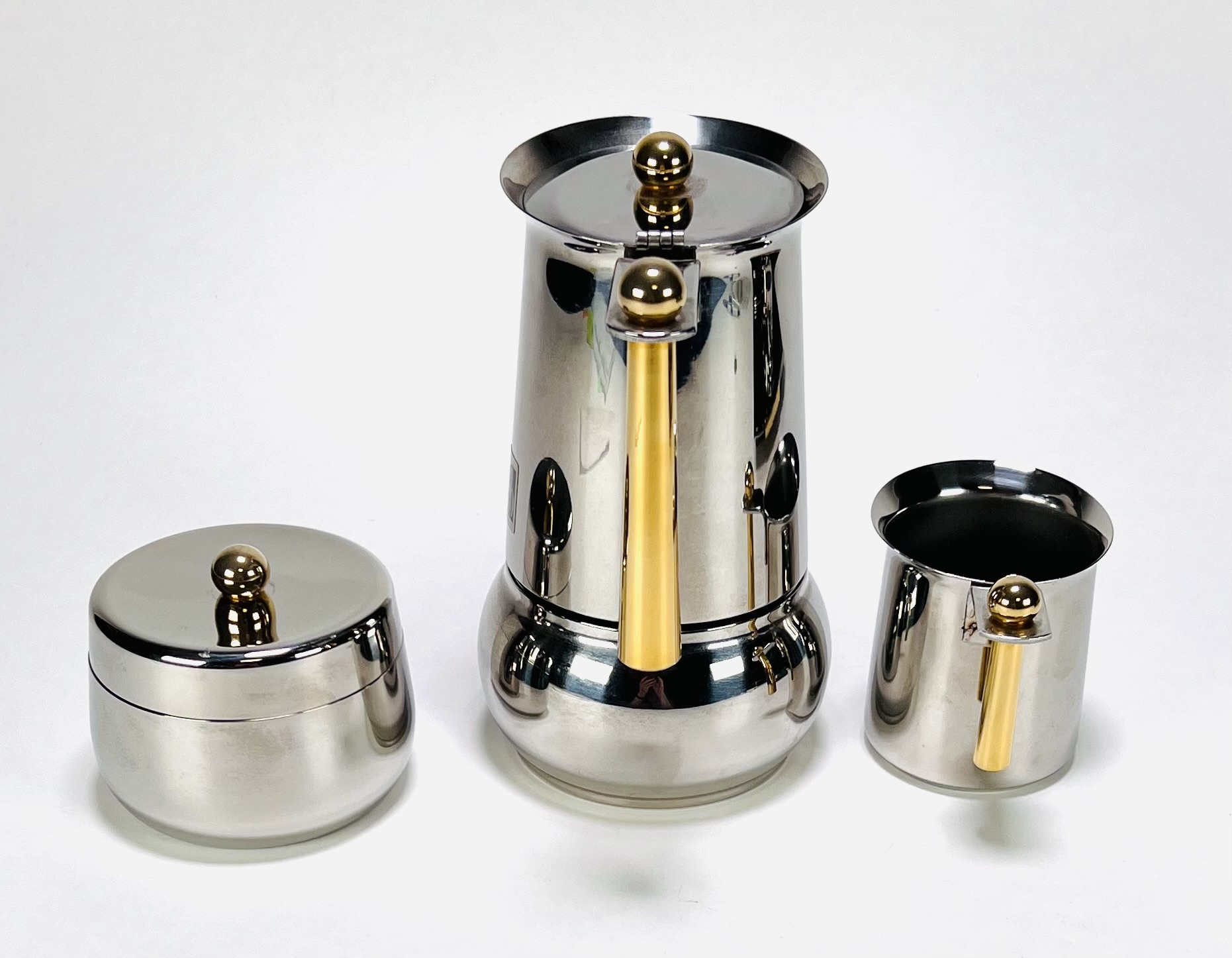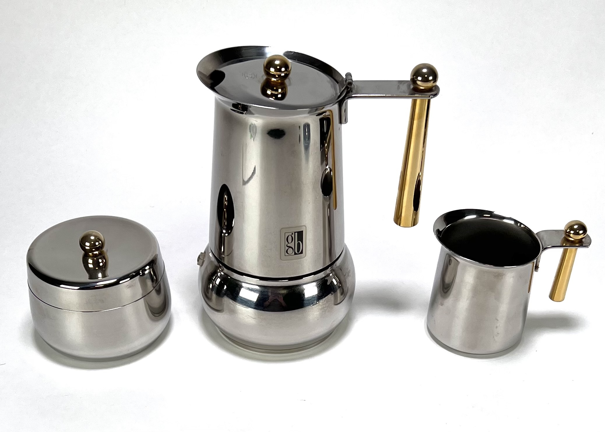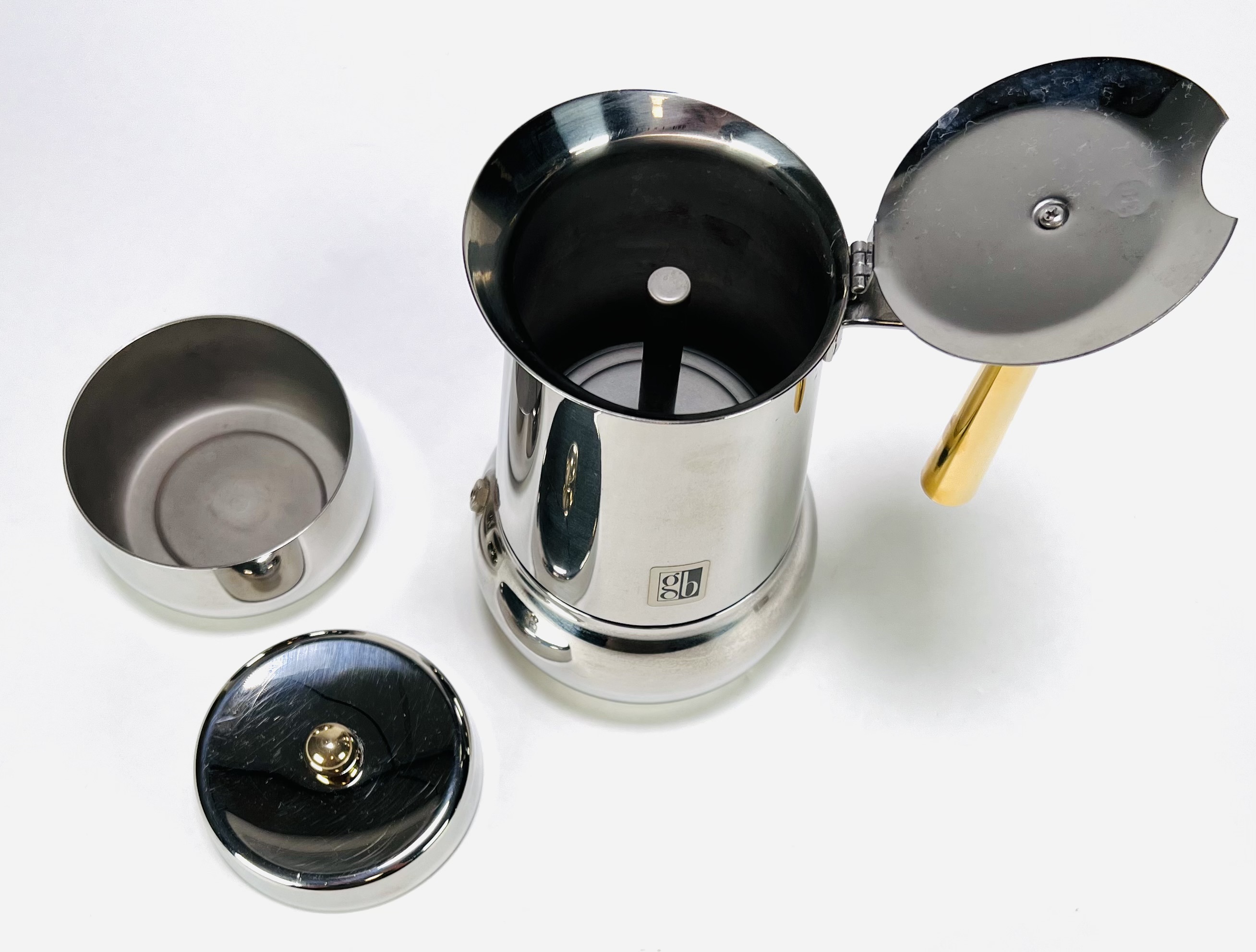 Italiaanse chromen koffieset met vergulde elementen van Guido Bergna (Gb) met percolator, suiker- en melkkan, twee espresso kopjes en bijbehorend dienblad. Aan de onderzijde gemerkt, Made in Italy, GB en inox 18-10, deksel percolator DE (Douwe Egberts) gemerkt. Jaren 80/90. |