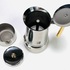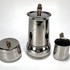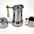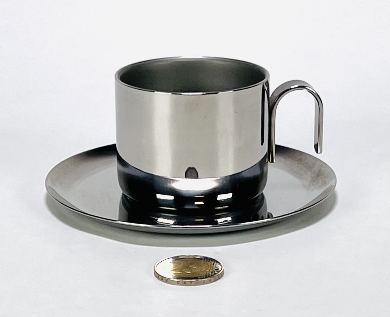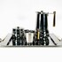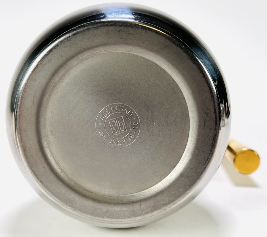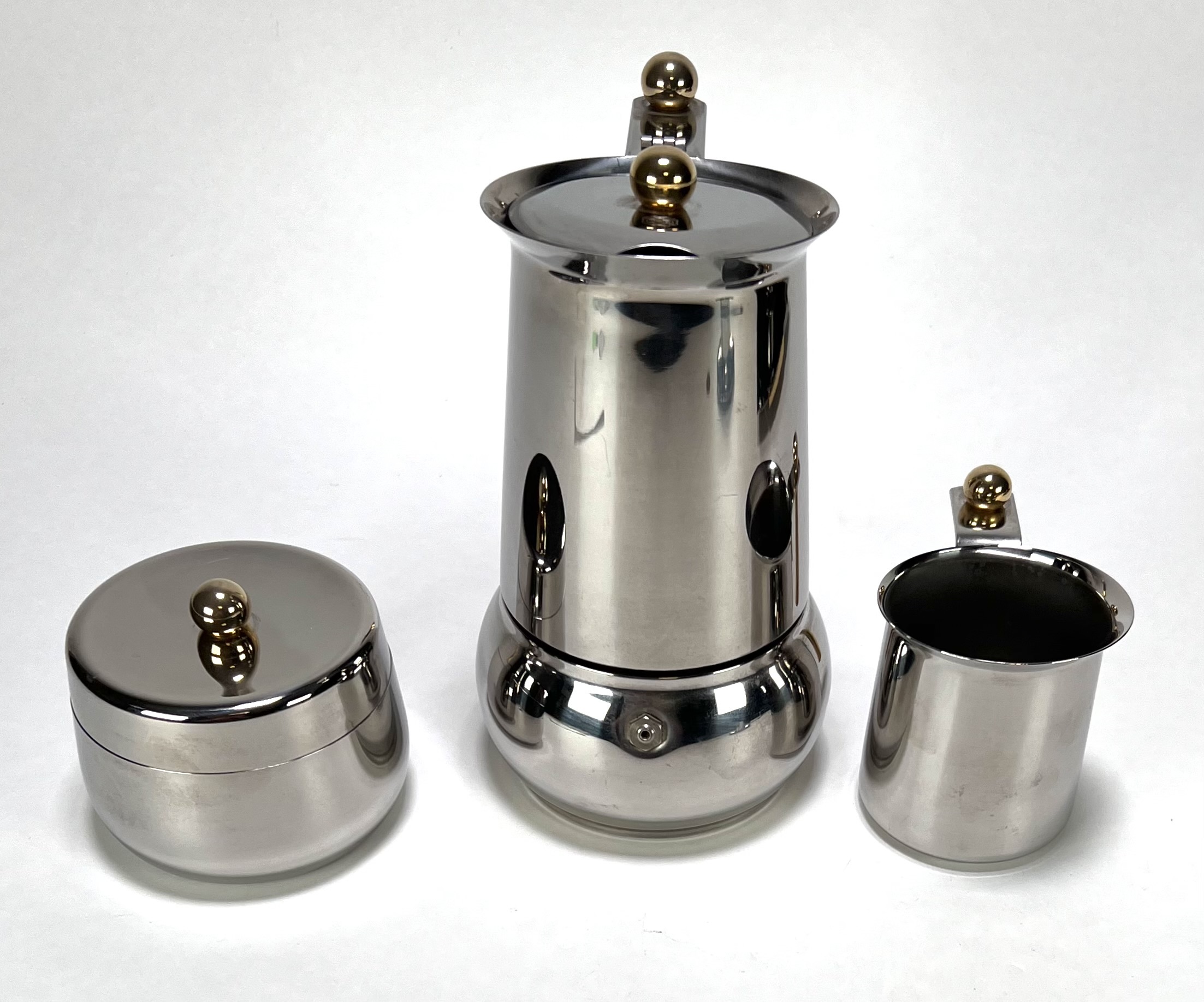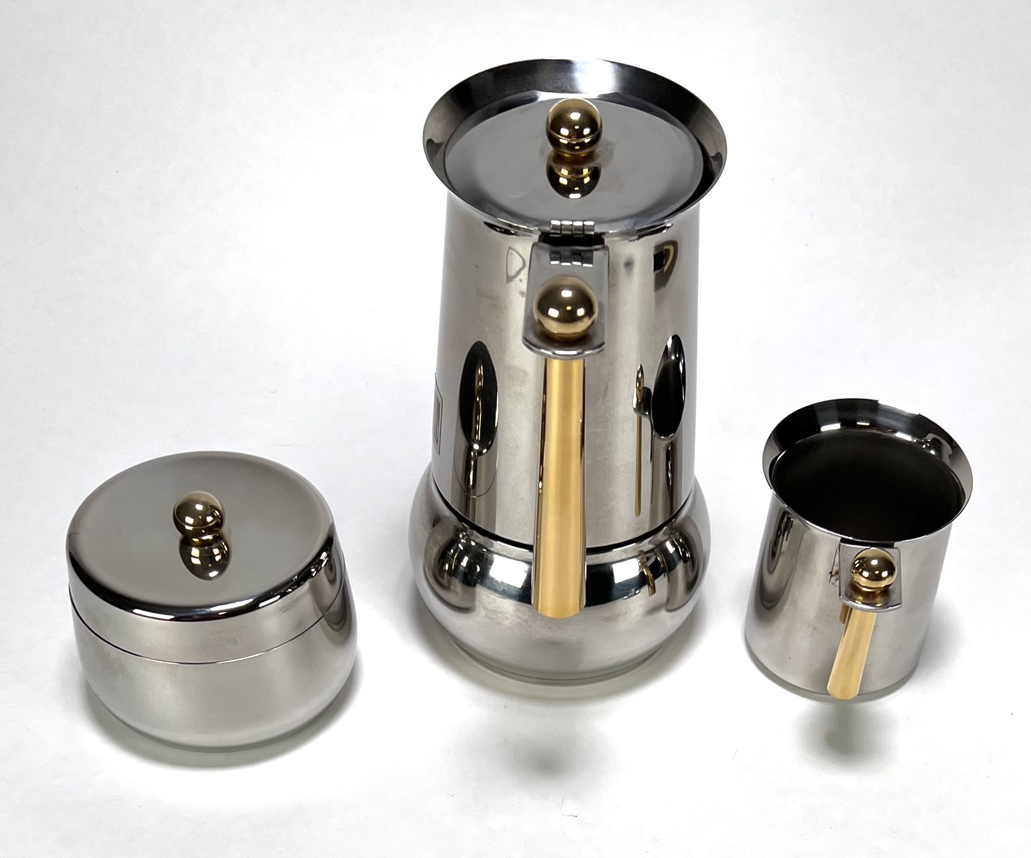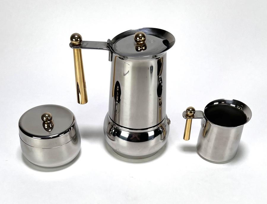 Italiaanse chromen koffieset met vergulde elementen van Guido Bergna (Gb) met percolator, suiker- en melkkan, twee espresso kopjes en bijbehorend dienblad. Aan de onderzijde gemerkt, Made in Italy, GB en inox 18-10, deksel percolator DE (Douwe Egberts) gemerkt. Jaren 80/90. |
