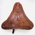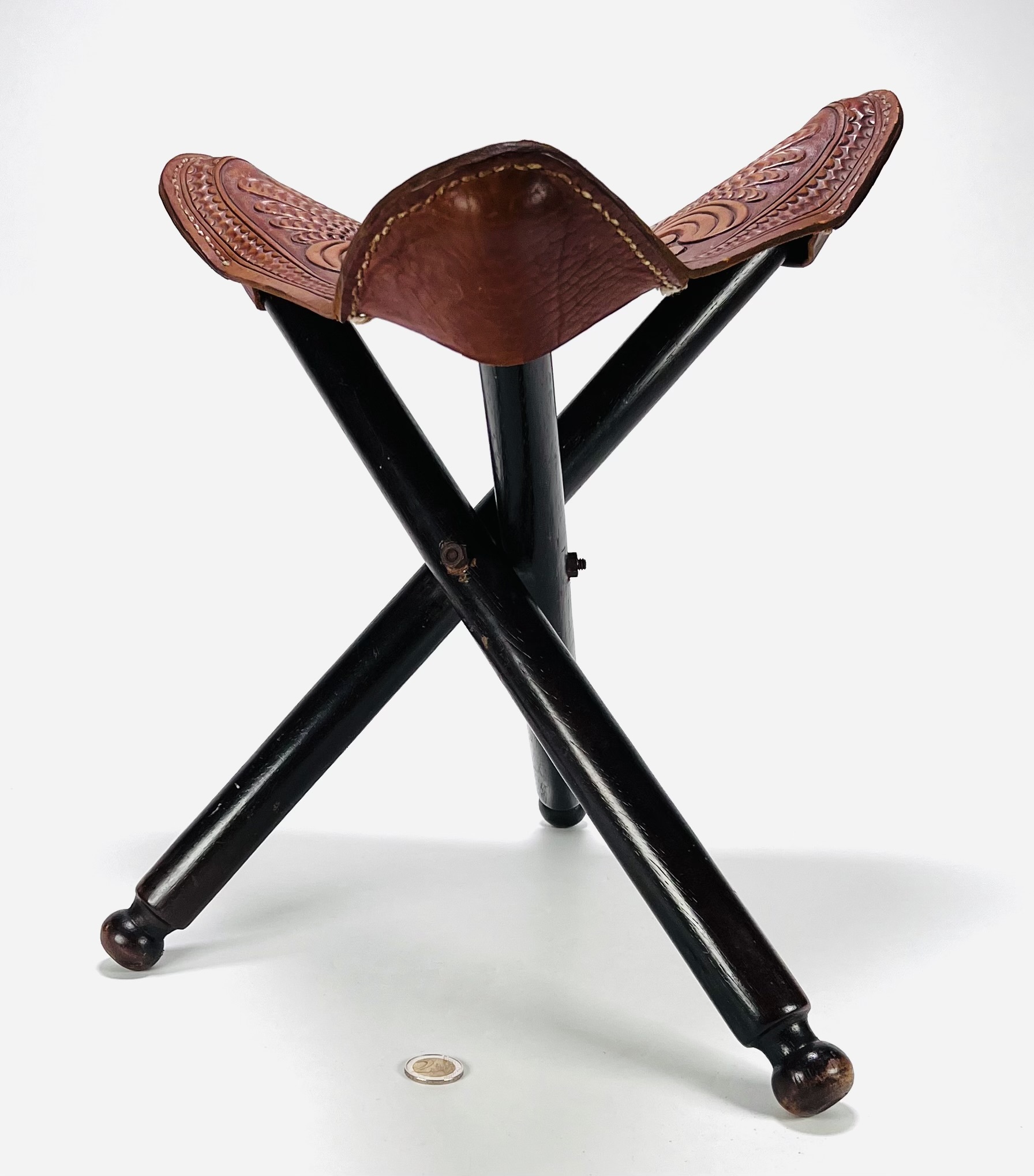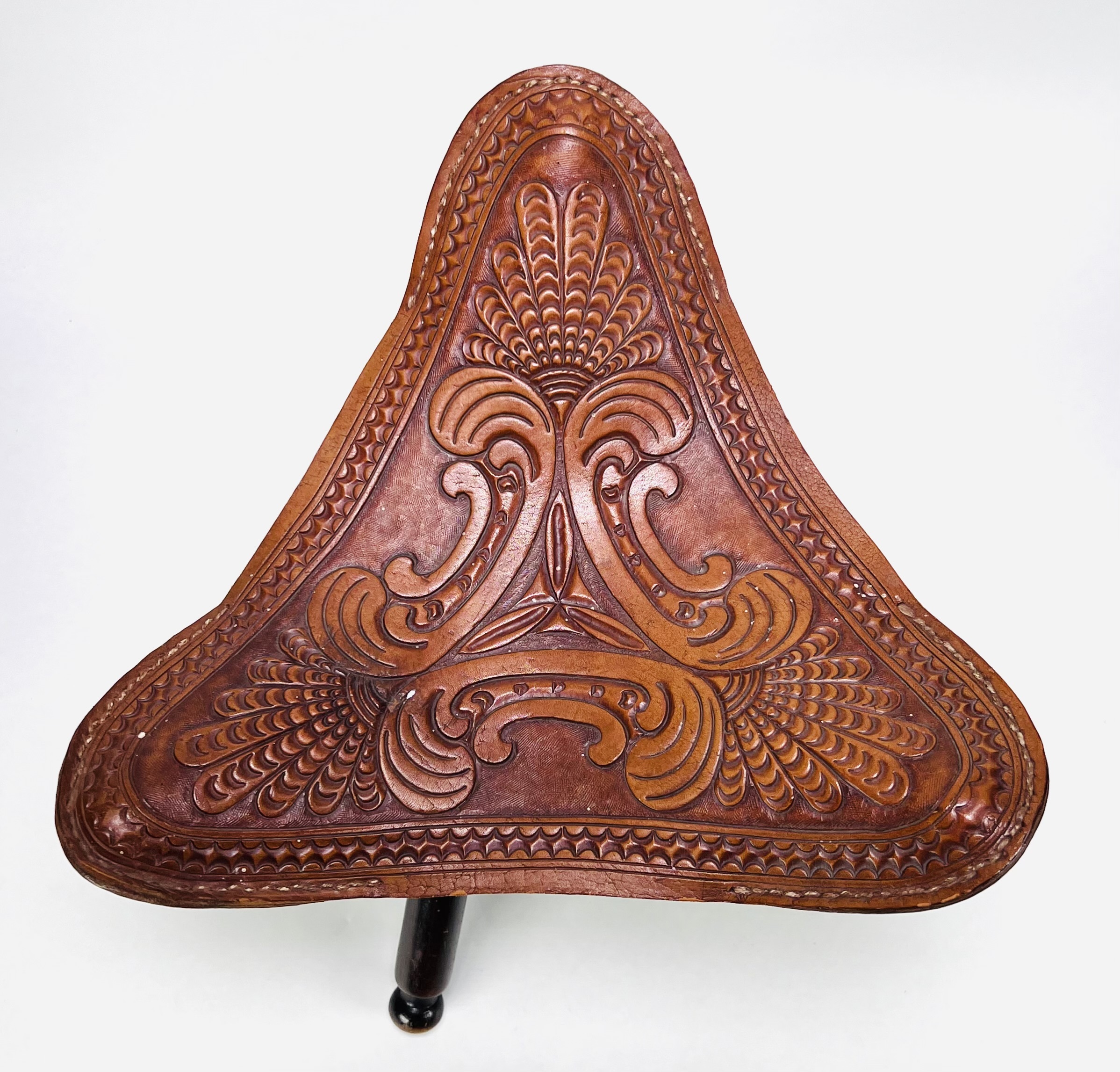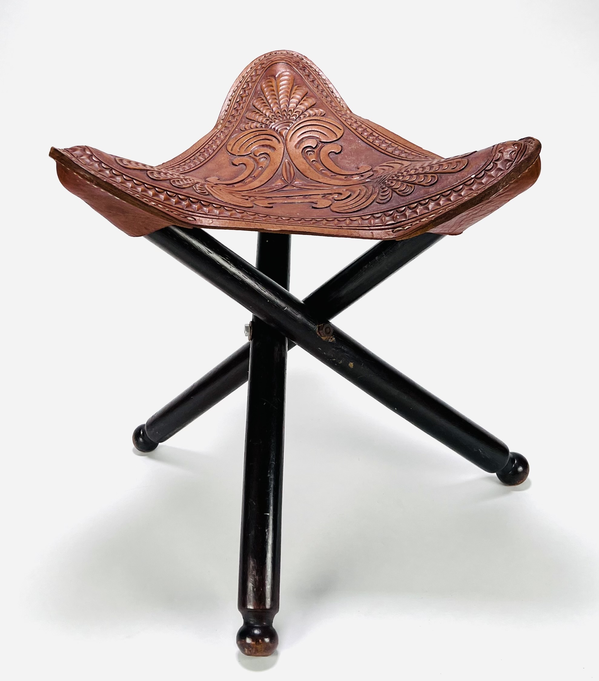 Houten driepoot kruk met gestanst tuiglederen zitvlak. Midden-Amerika, 20e eeuw. |