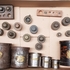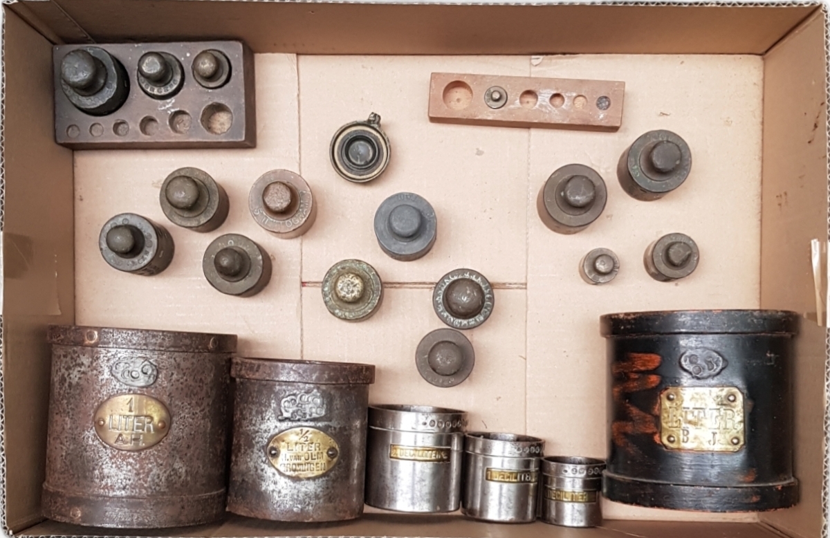 Zes maatbekers en meerdere messing gewichten met twee houten gewichtshouders. 20e eeuw. |