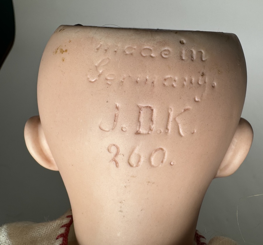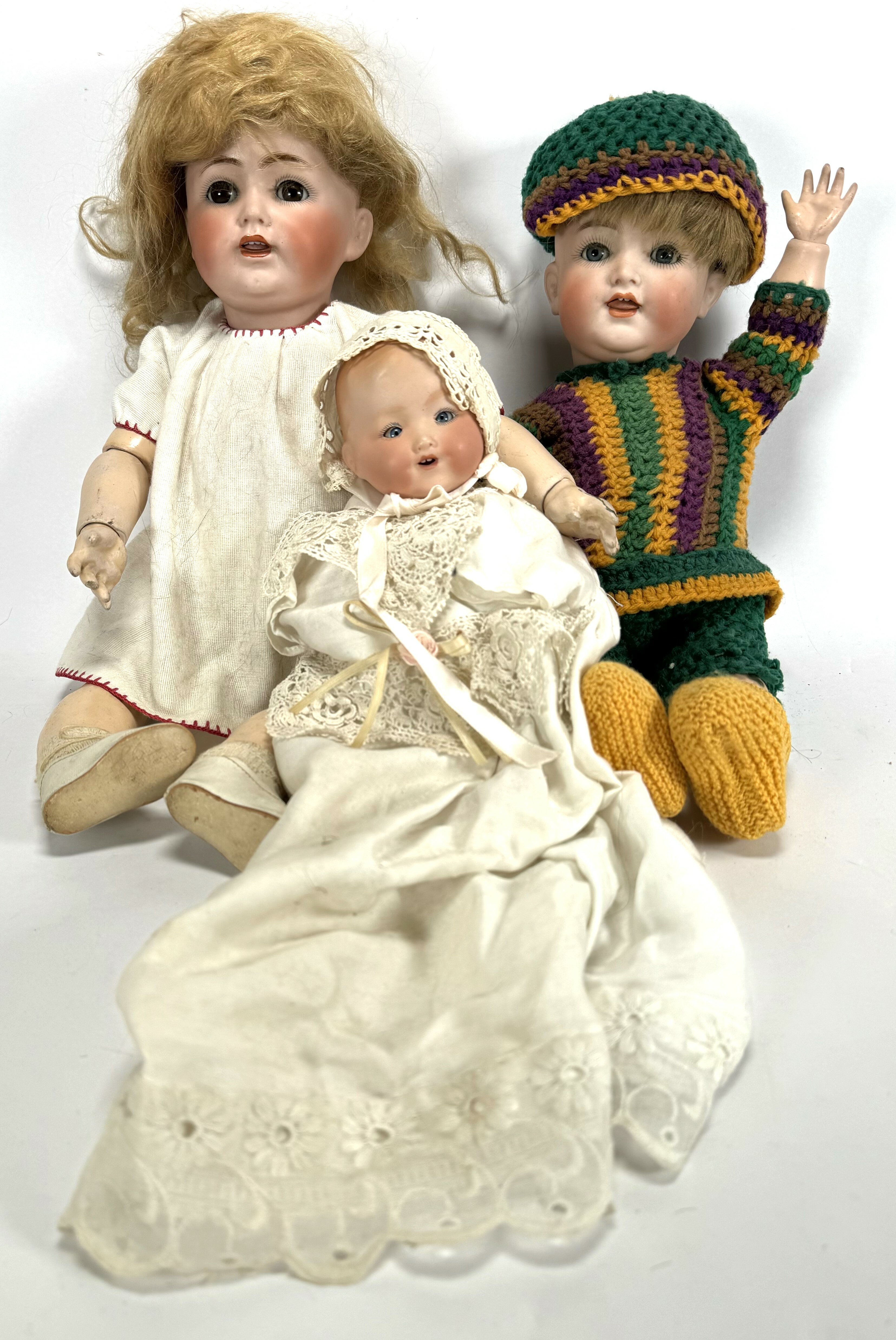 Drie biscuit porseleinen poppen; een pop gemerkt Simon & Halbig, genummerd 126 Germany, een pop gemerkt J.D.K., Germany en genummerd 260 en een pop gemerkt A.M. Germany. Duitsland, begin 20e eeuw. |