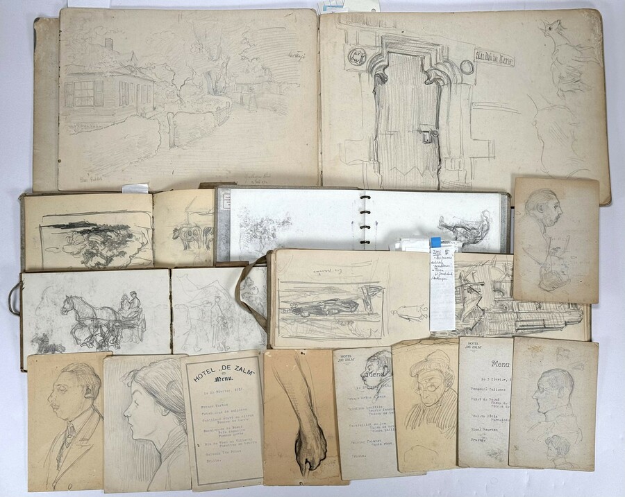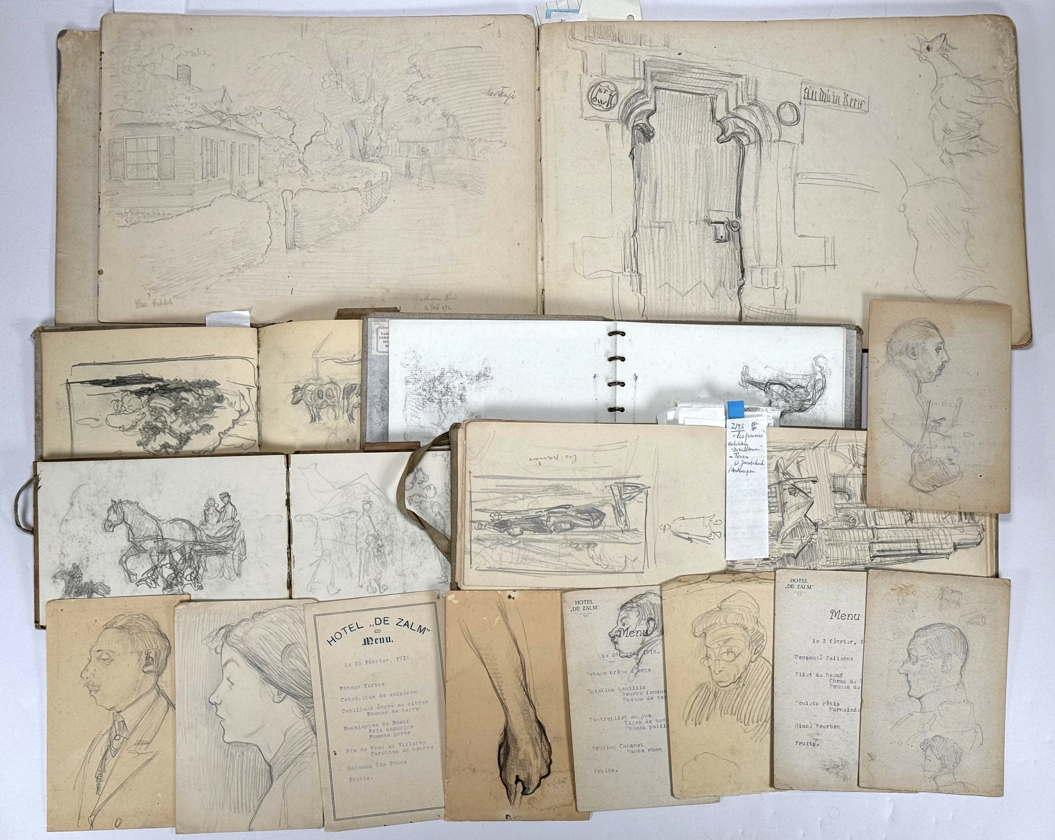 Vijf schetsboeken van kunstenaar Reinhardt Dozy (Nijmegen, 28 september 1880 – Elp, 27 januari 1947) met studietekeningen van dieren, landschappen, gebouwen en mensen. Provenance: collectie zoon van de kunstschilder. |
