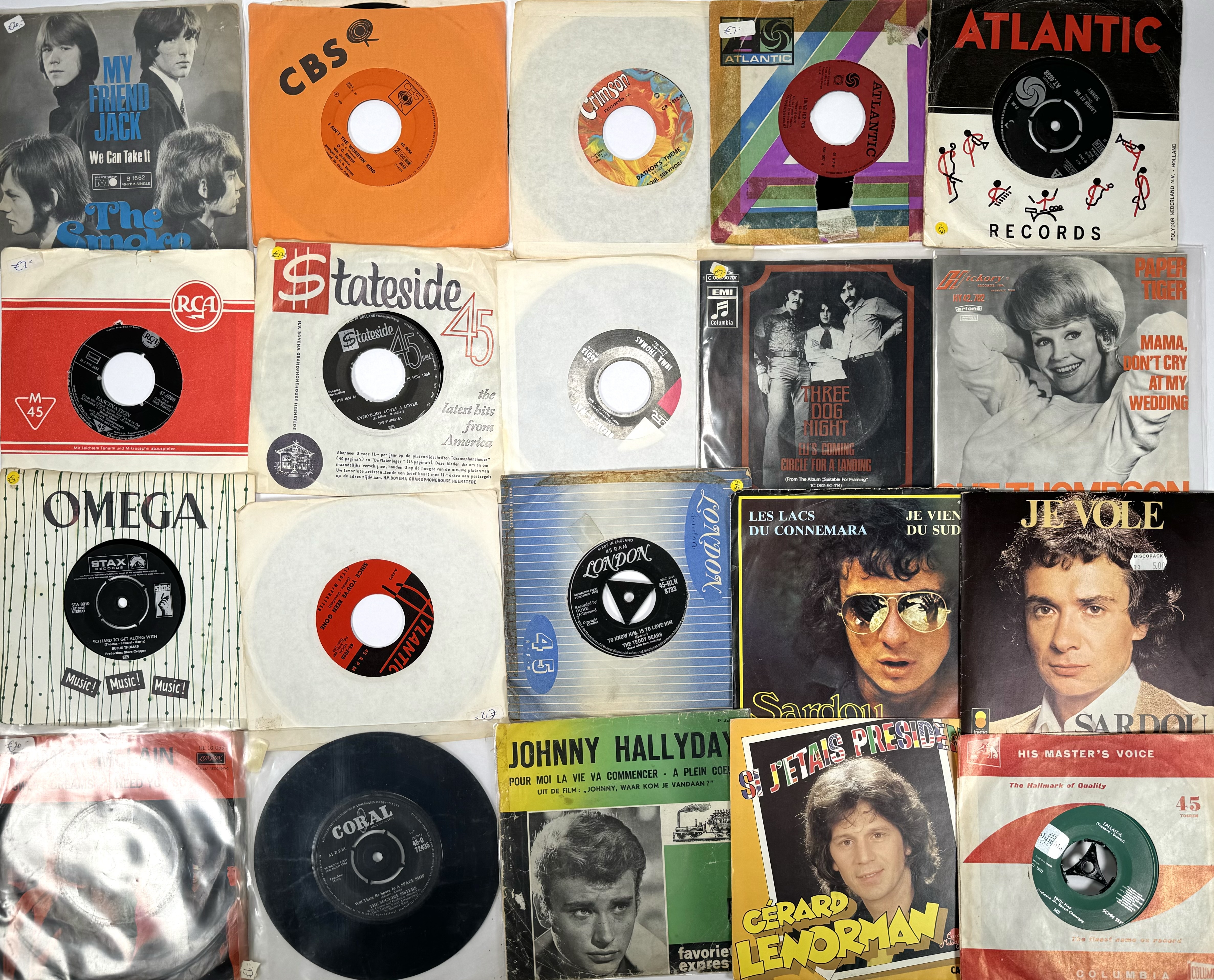 Lot met twintig 45 toeren singles, internationaal jaren 50-70 met onder meer Sardou, Johnny Hallyday en The Smoke. |