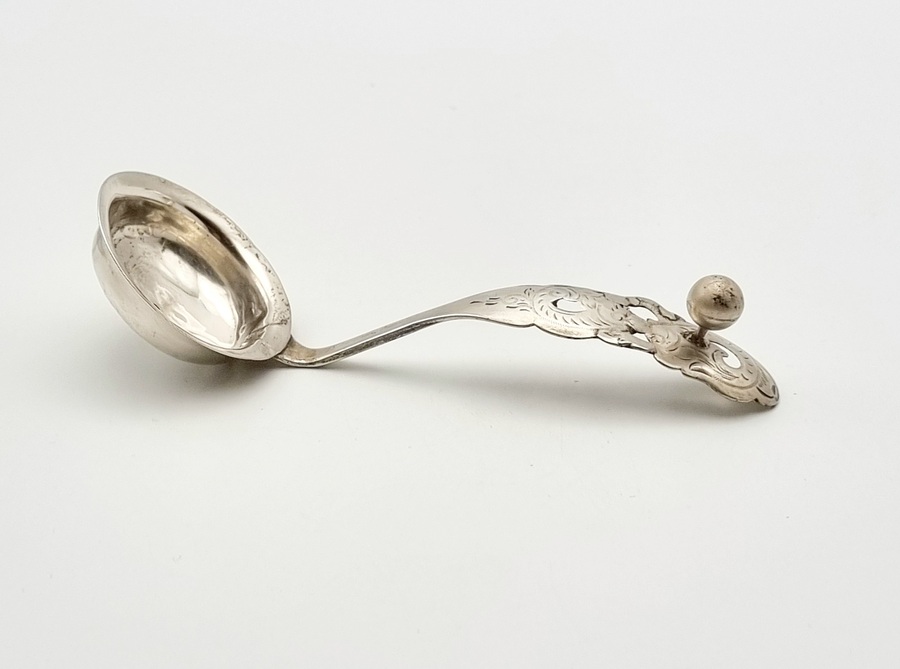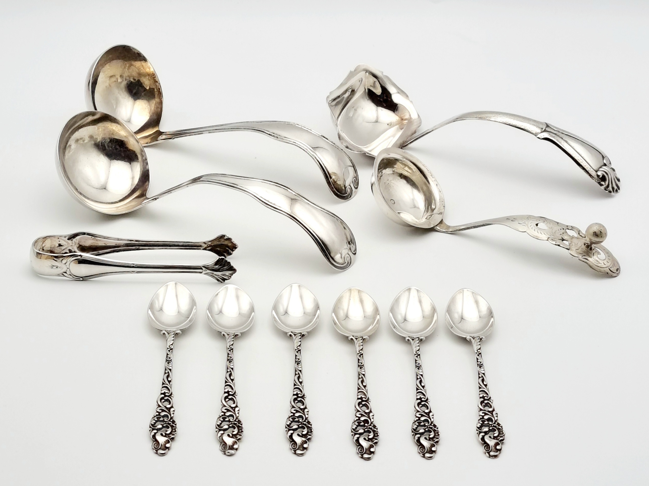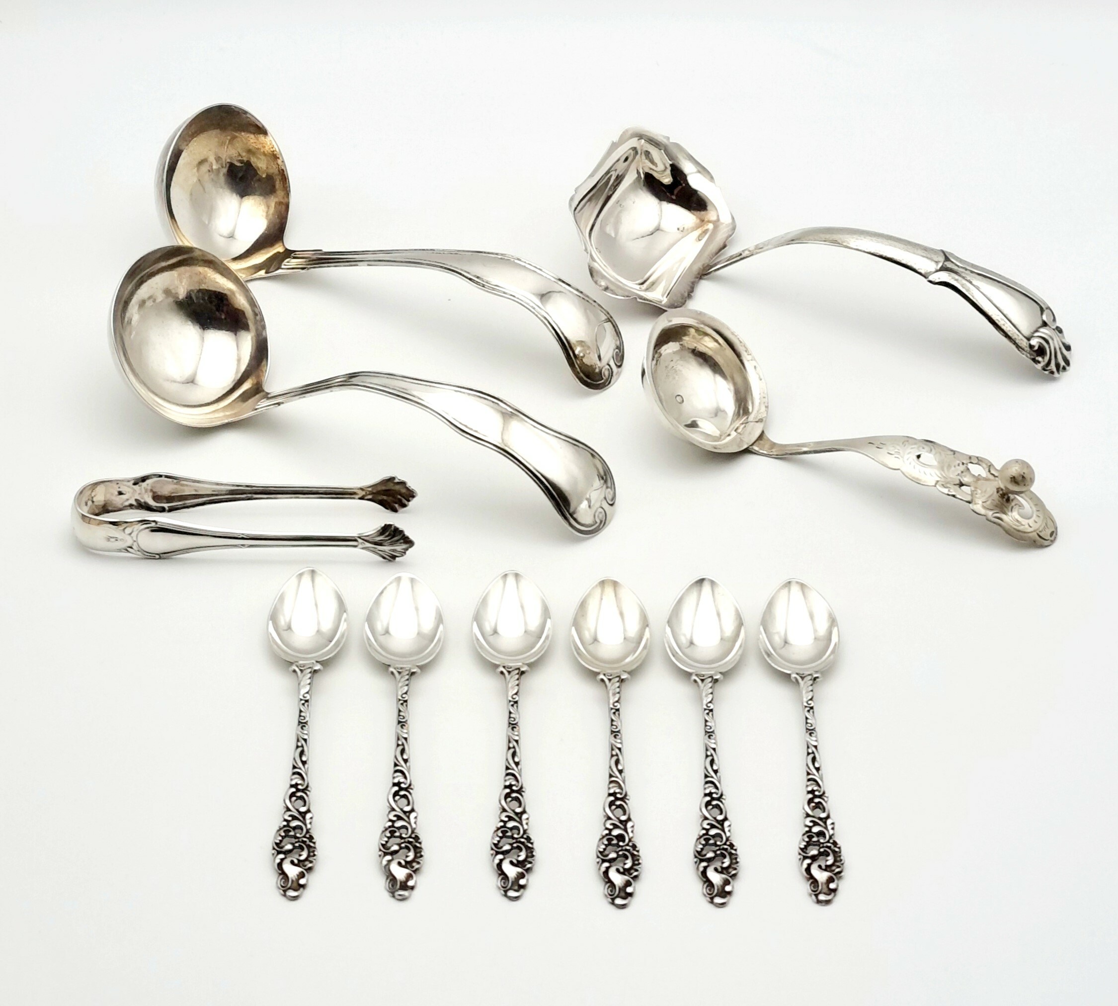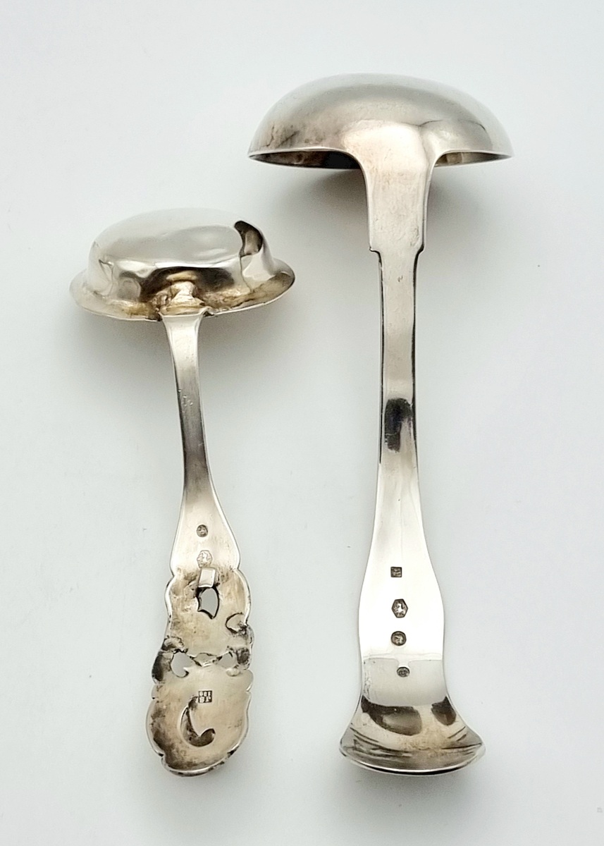Convolutie zilver bestaande uit drie sauslepels gekeurd lopende leeuw 2, meesterkeur Van Kempen, roomlepel gekeurd lopende leeuw 2, meesterkeur Van Kempen en jaarletter 1852, klontjestang gekeurd 800 en zes theelepels meerdere zilverkeuren. 19e/20e eeuw. |