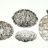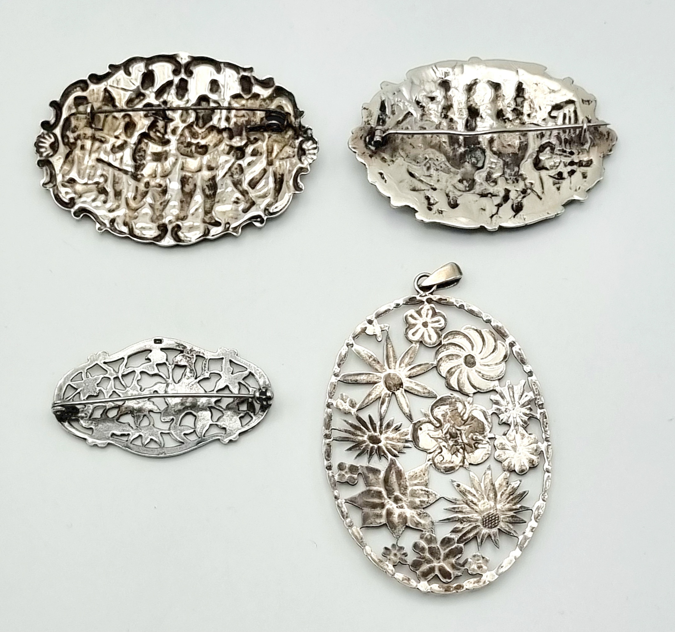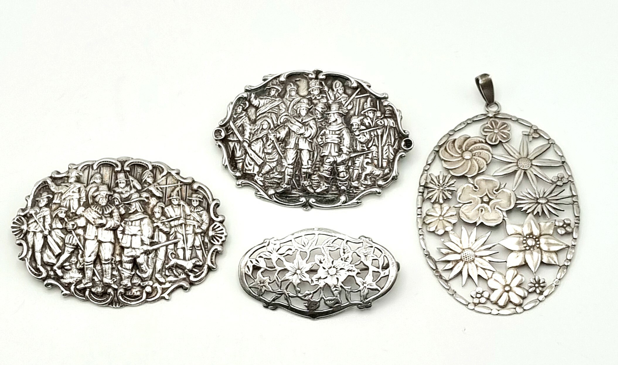 Convoluut zilveren sieraden bestaande uit drie broches en een hanger. Zilver gekeurd 925 en overige keuren, 20e eeuw. |