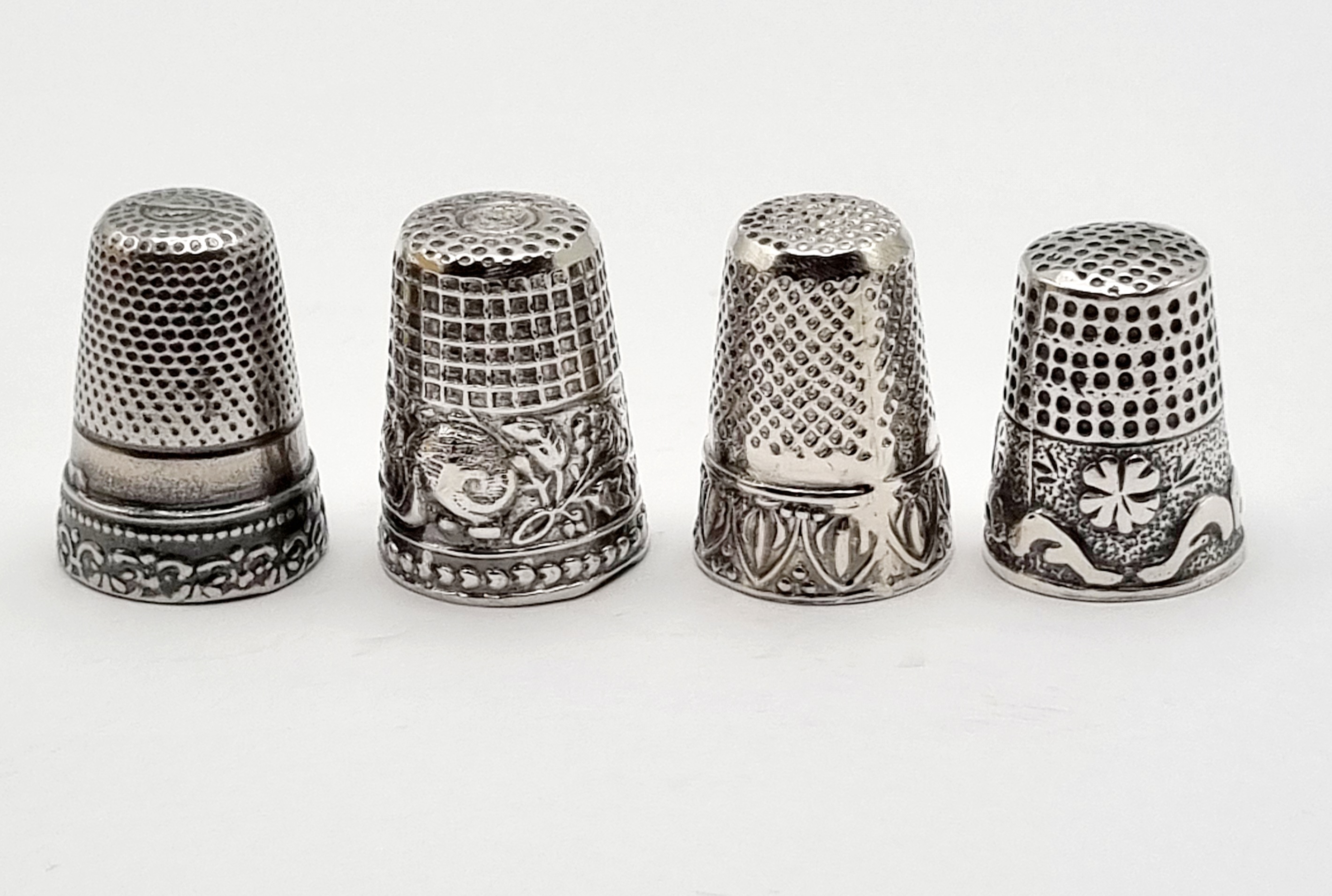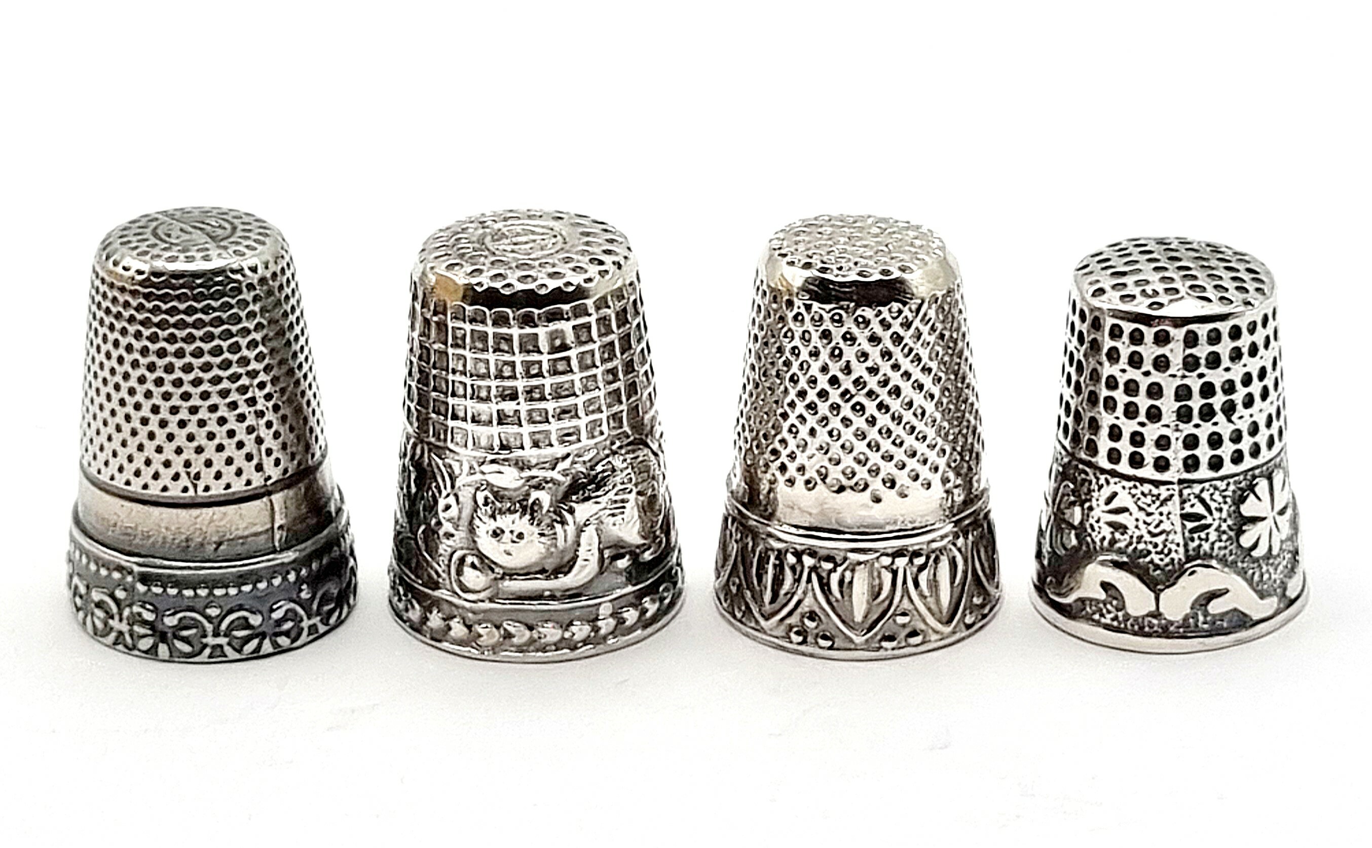 Vier zilveren vingerhoedjes waarvan een met een poezenmotief, 20e eeuw. |
