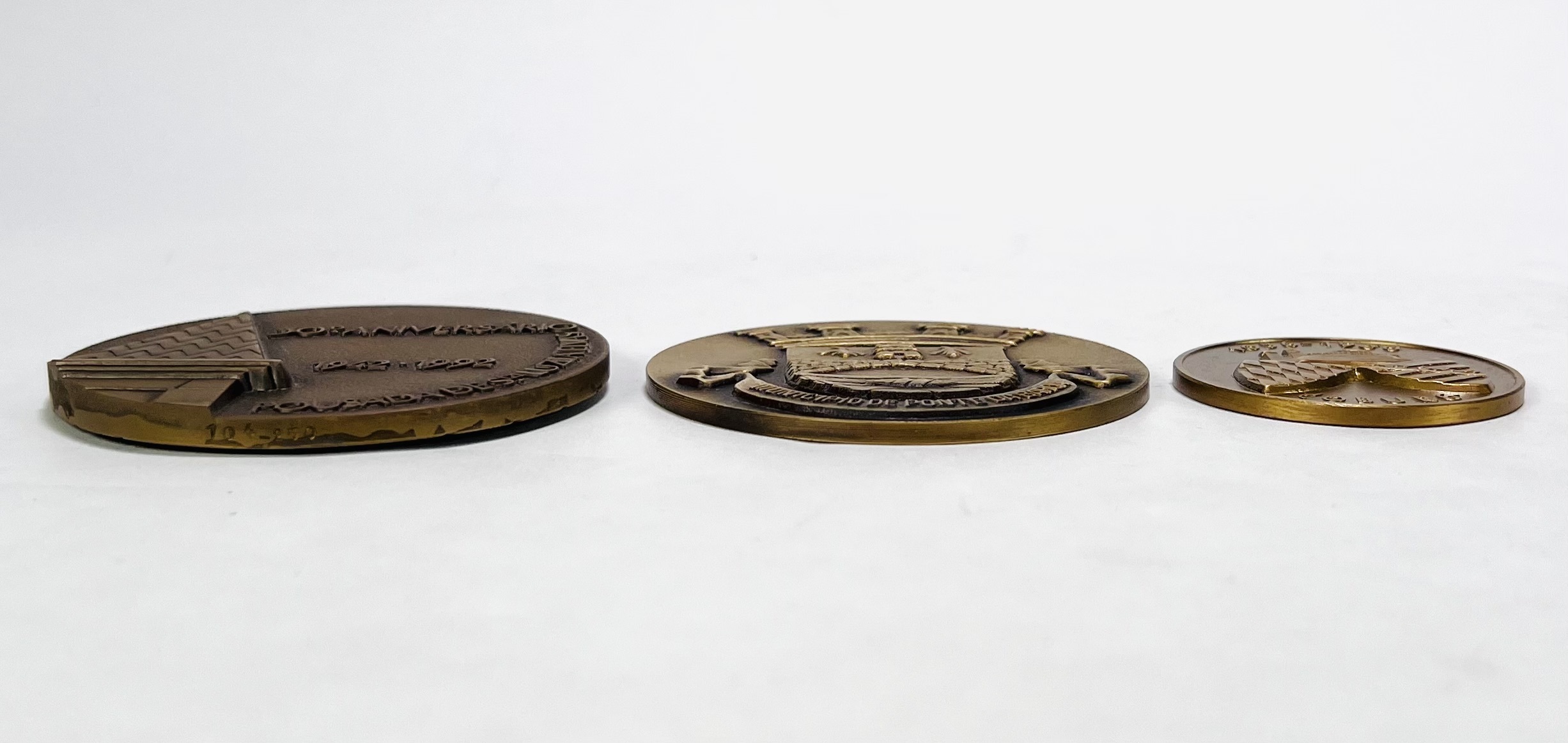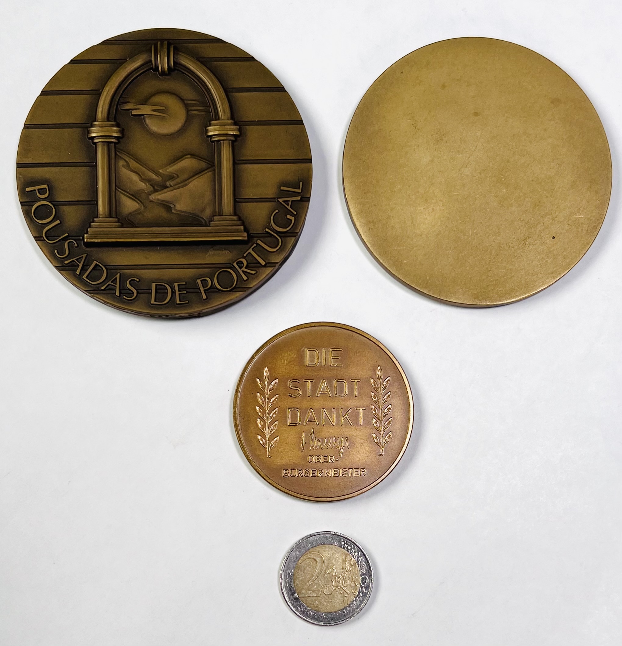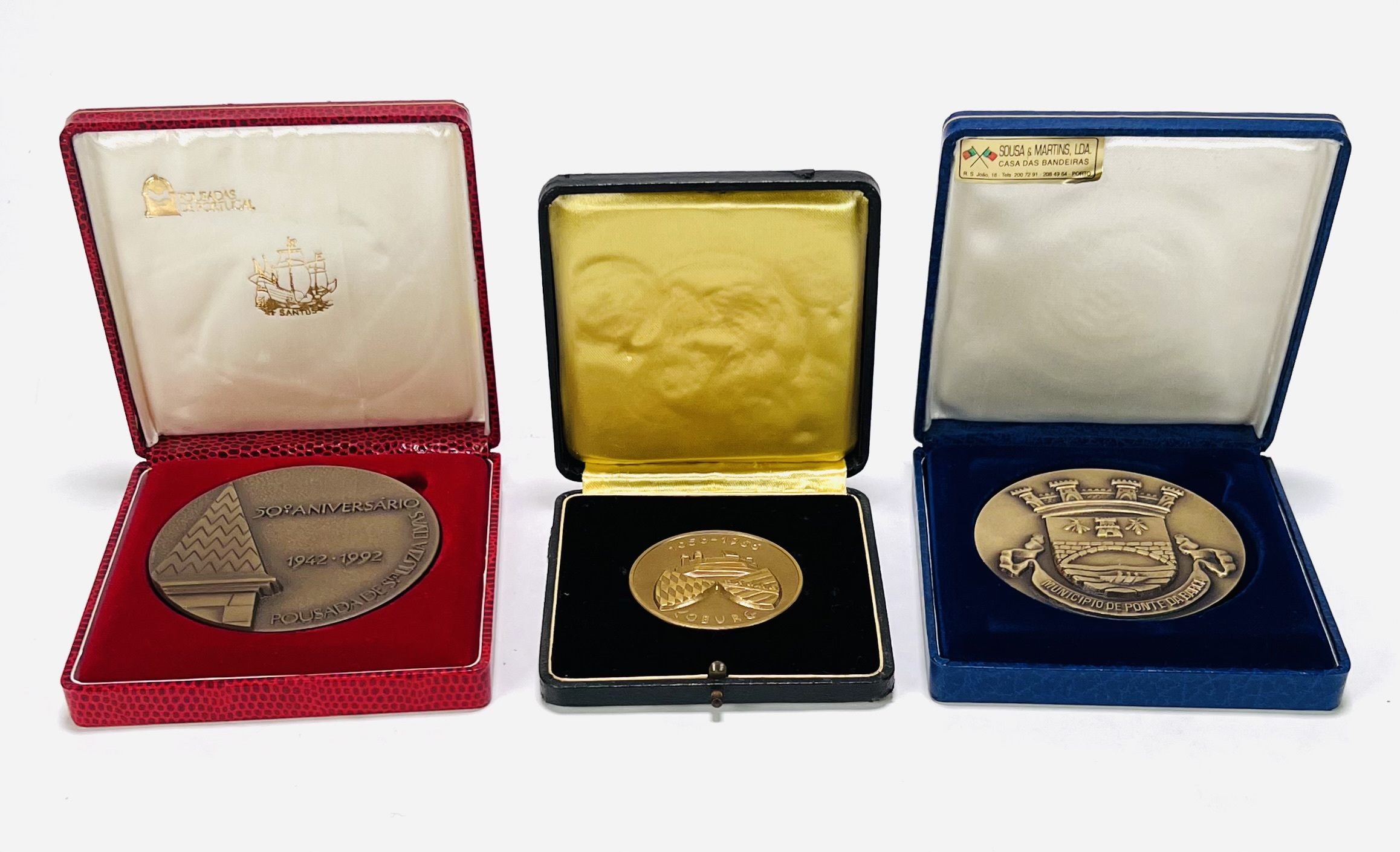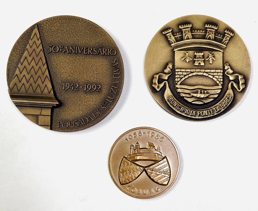 Drie bronzen penningen in etui; Portugese penningen met opschrift “Pousadas de Portugal” uit 1992 en Municipio de Ponte Da Barca. Daarbij een stadspenning van Coburg uit 1956. |