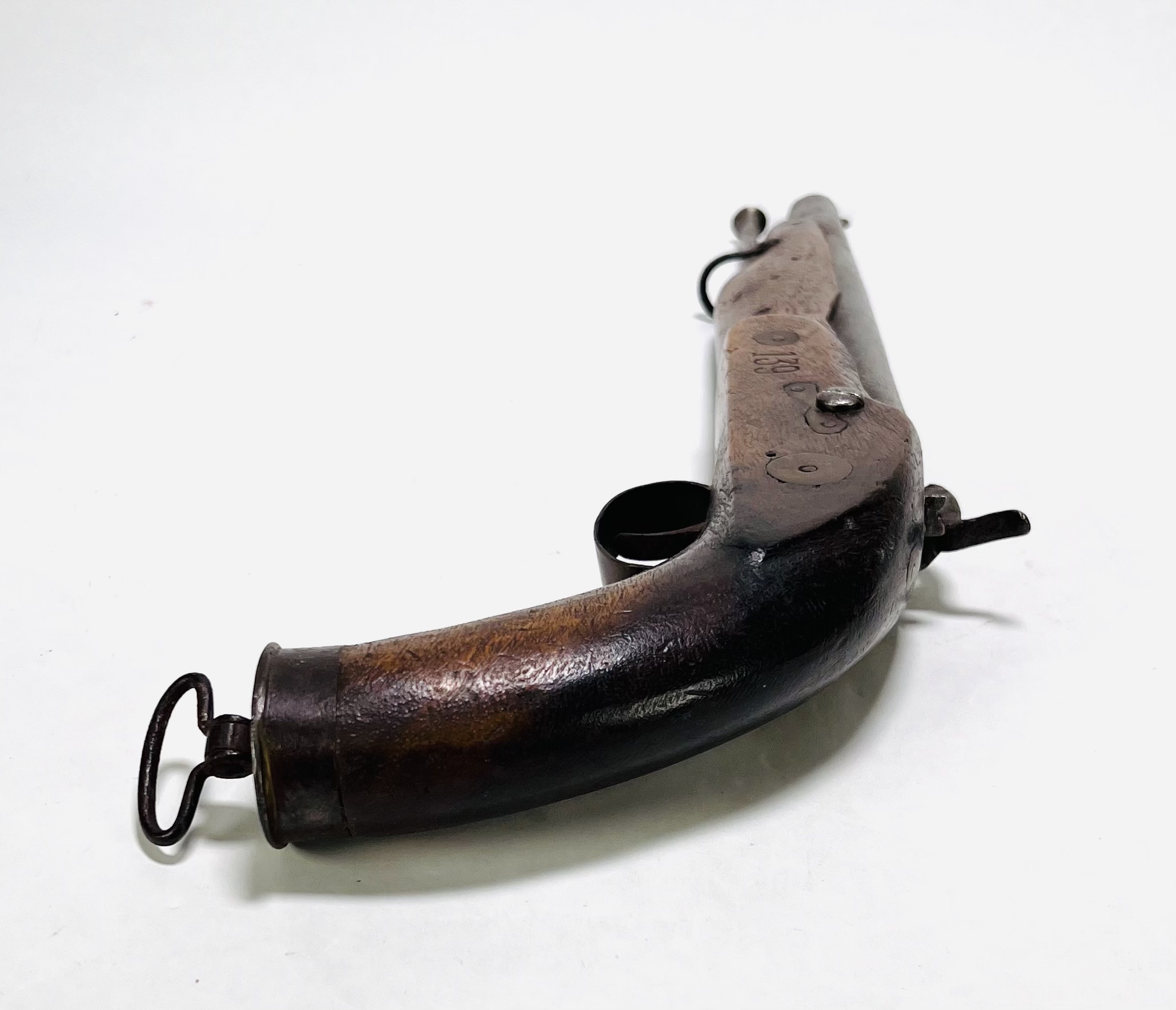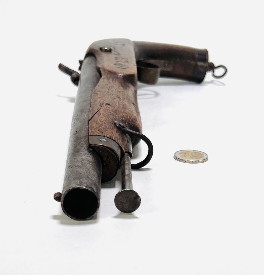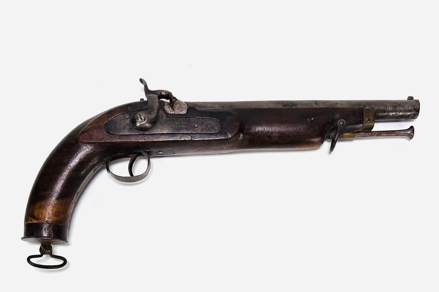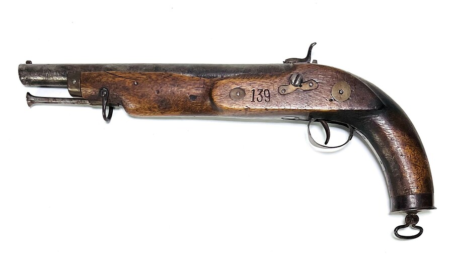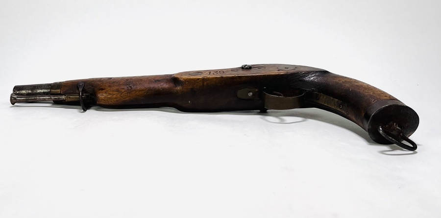 IJzeren vuursteenpistool met houten genummerde kolf, midden 19e eeuw. |