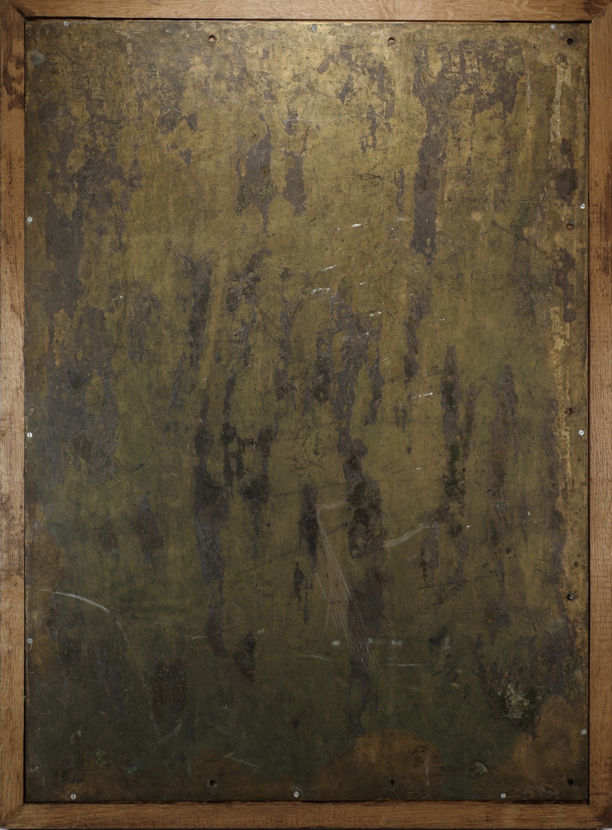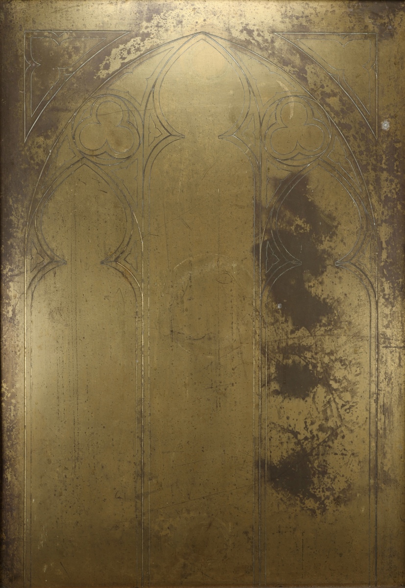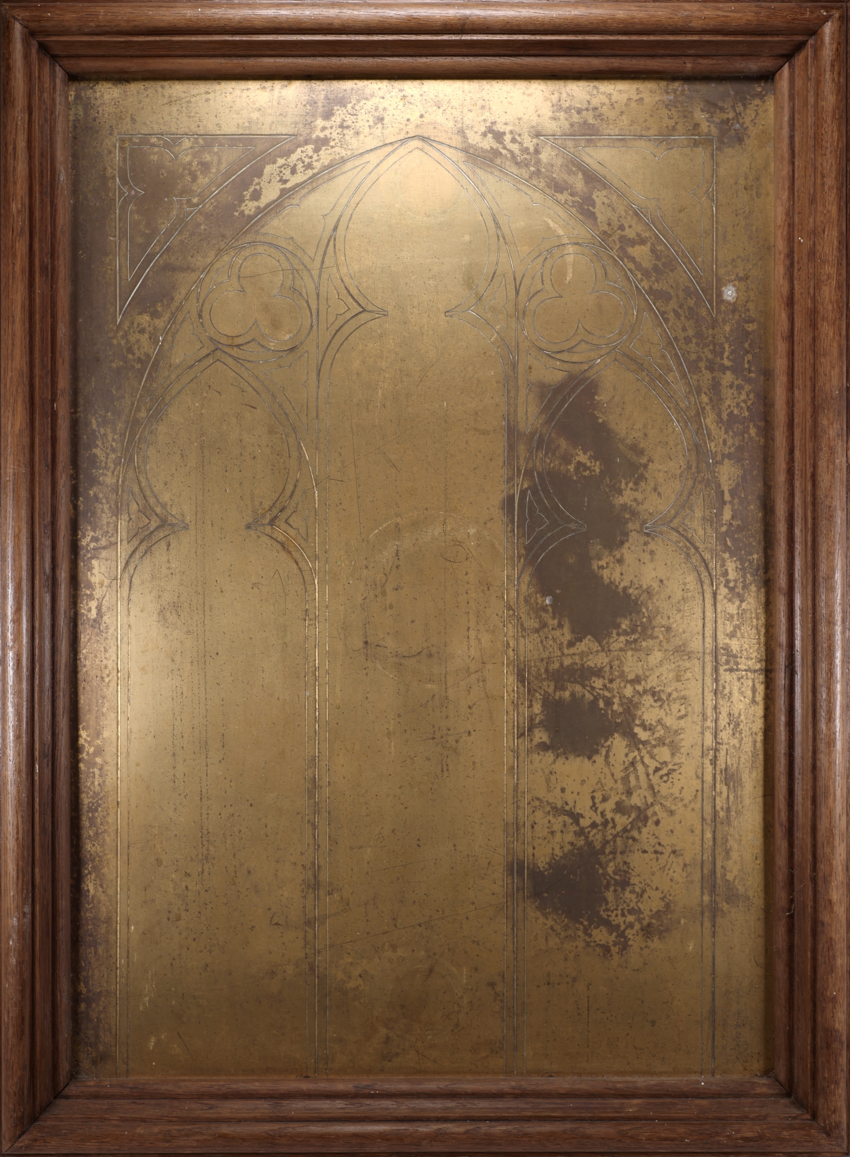 Messing plaat met Neogotische raampartij in eikenhouten omlijsting. Begin 1900. |